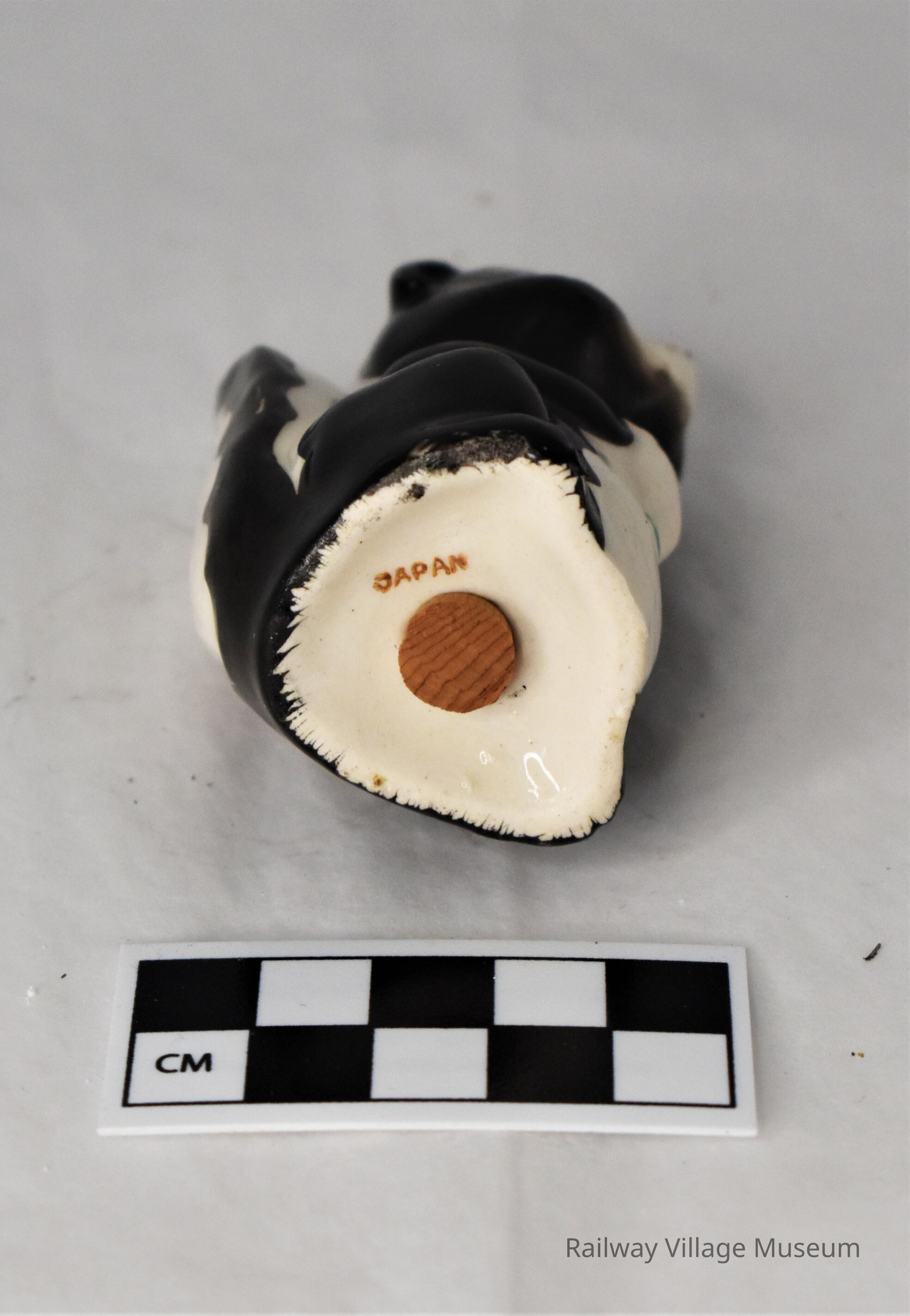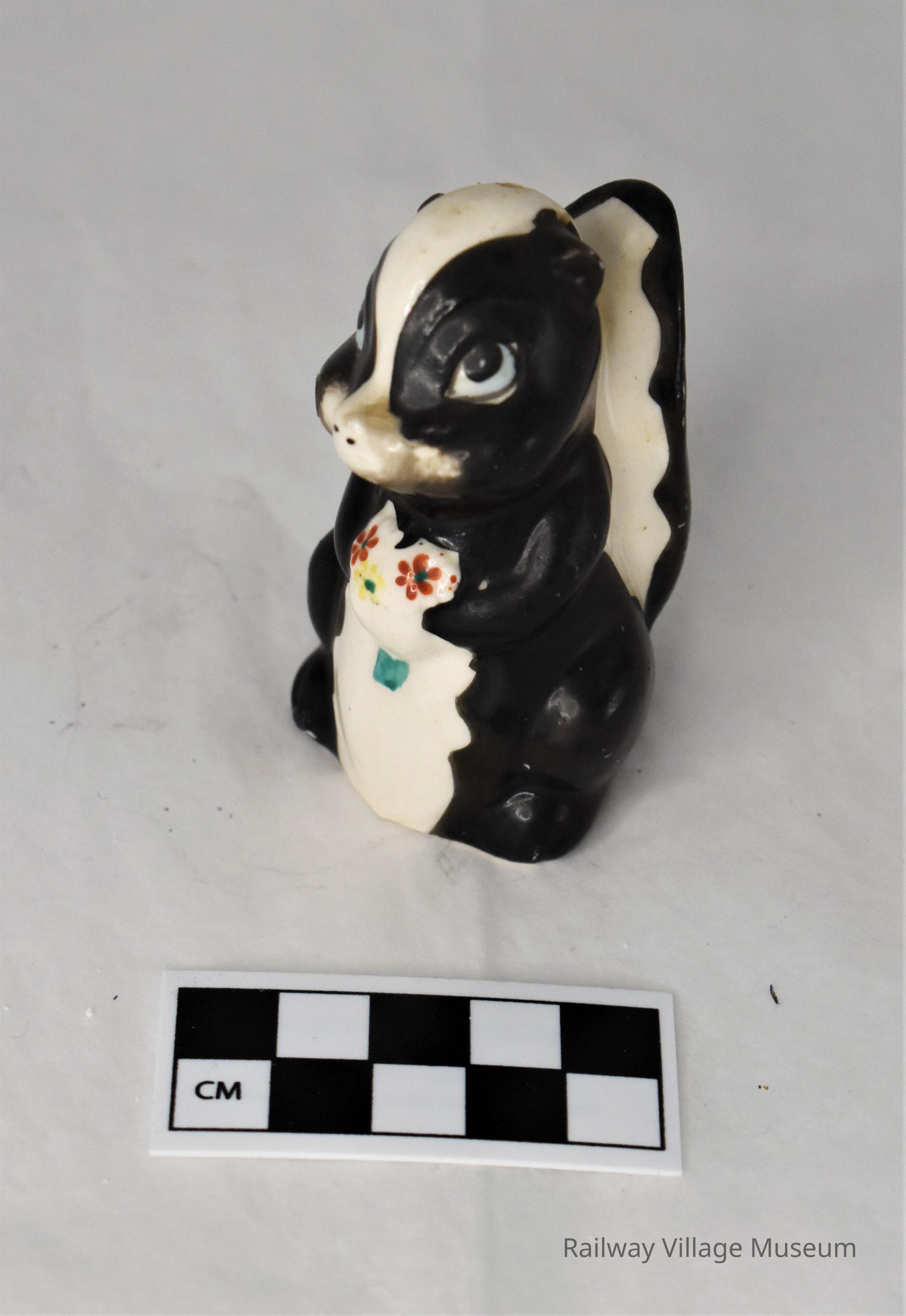 Ceramic skunk saltshaker holding a small bouquet of flowers. Is missing its partner. Made in Japan but manufacturer unknown. Cork stopper intact.