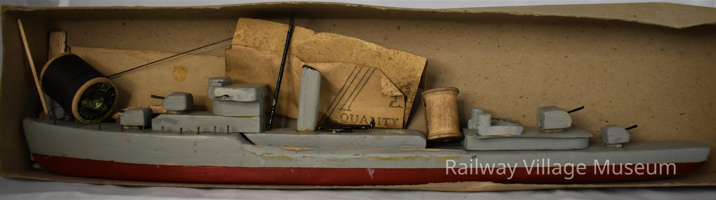 This U.S.S. Hobby Destroyer was one of the Monogram company's first products. Early kits, like this one, were made of balsa wood. Later the company switched to manufacturing with plastic.Context