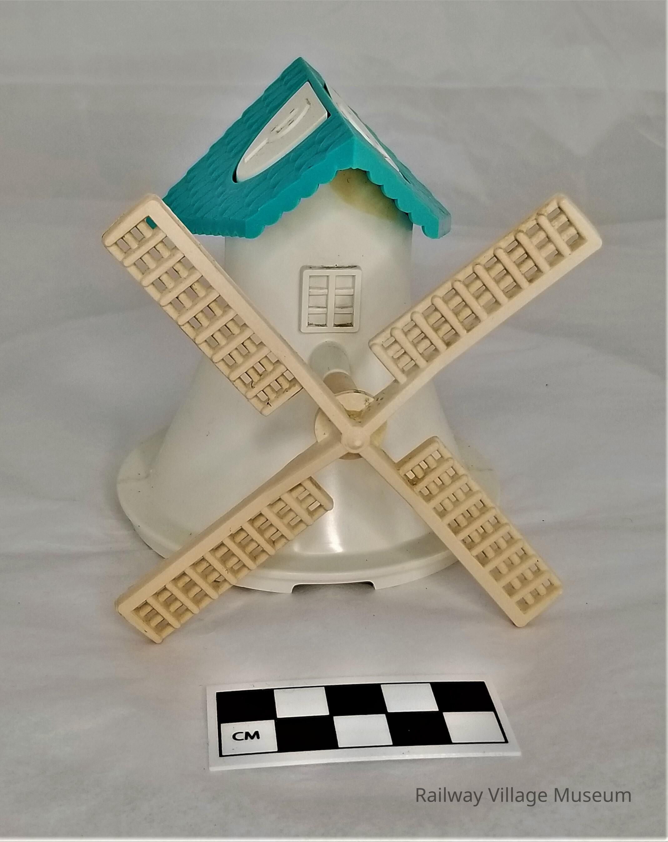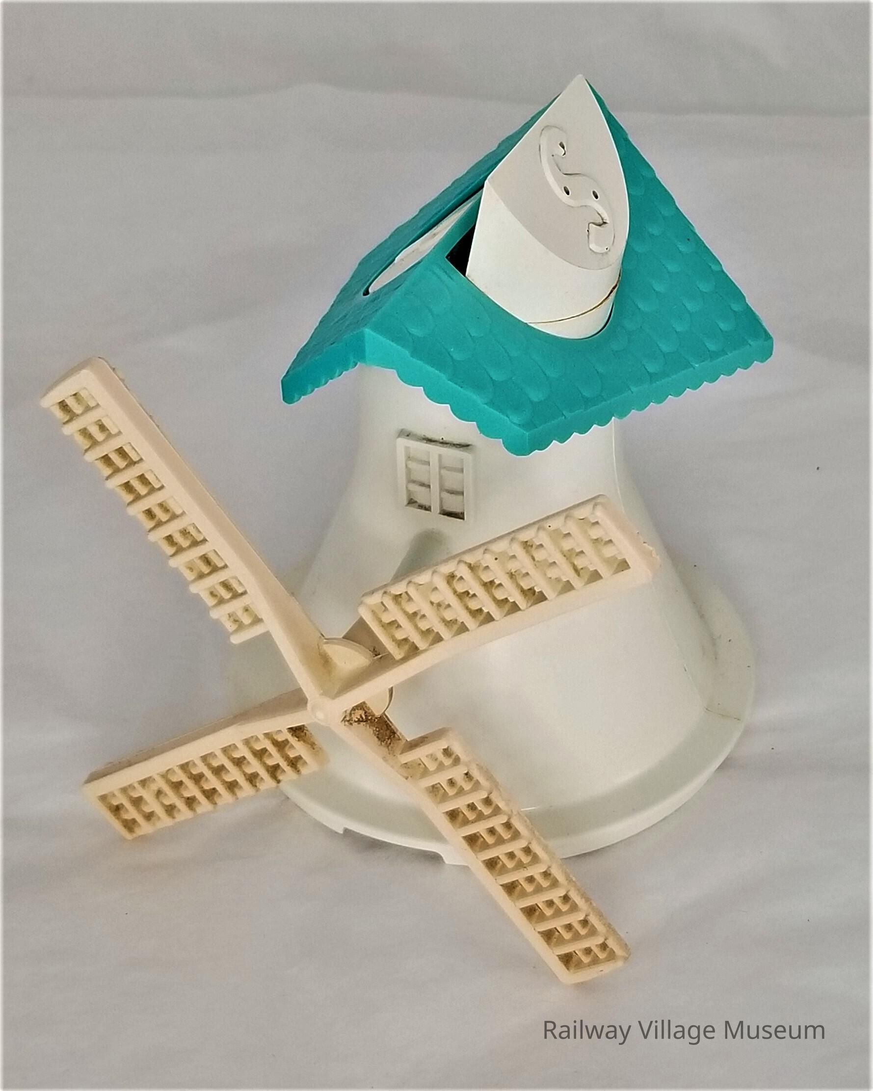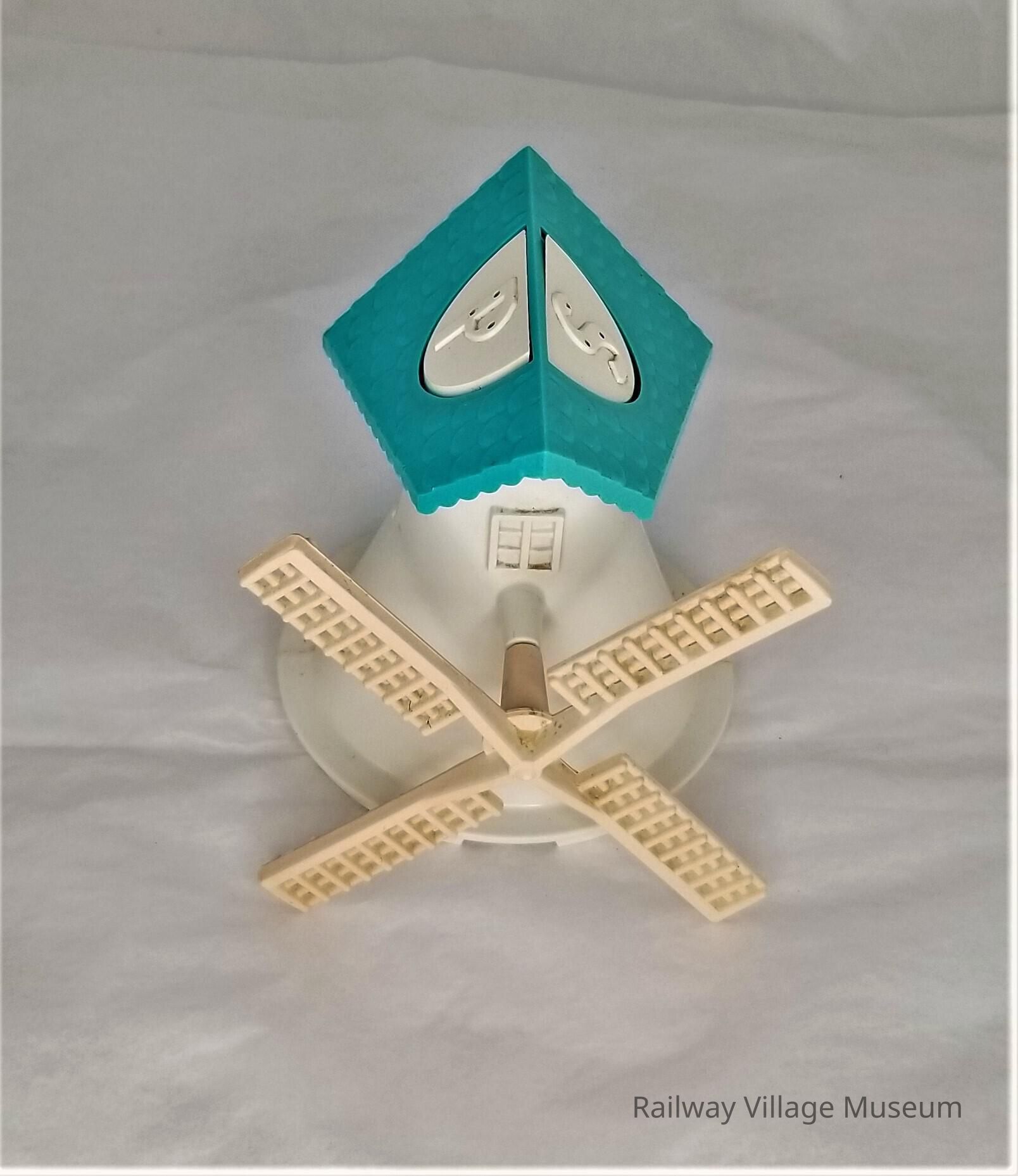 As the windmill blades rotate, the salt and pepper shakers lift out of the roof. This example is missing its blue base.