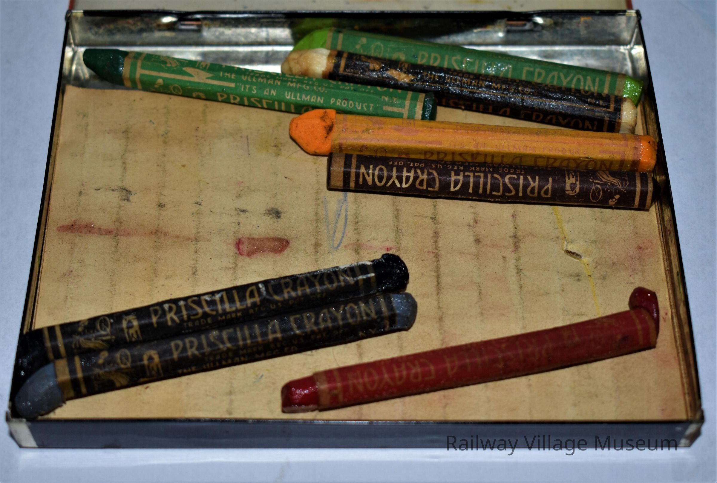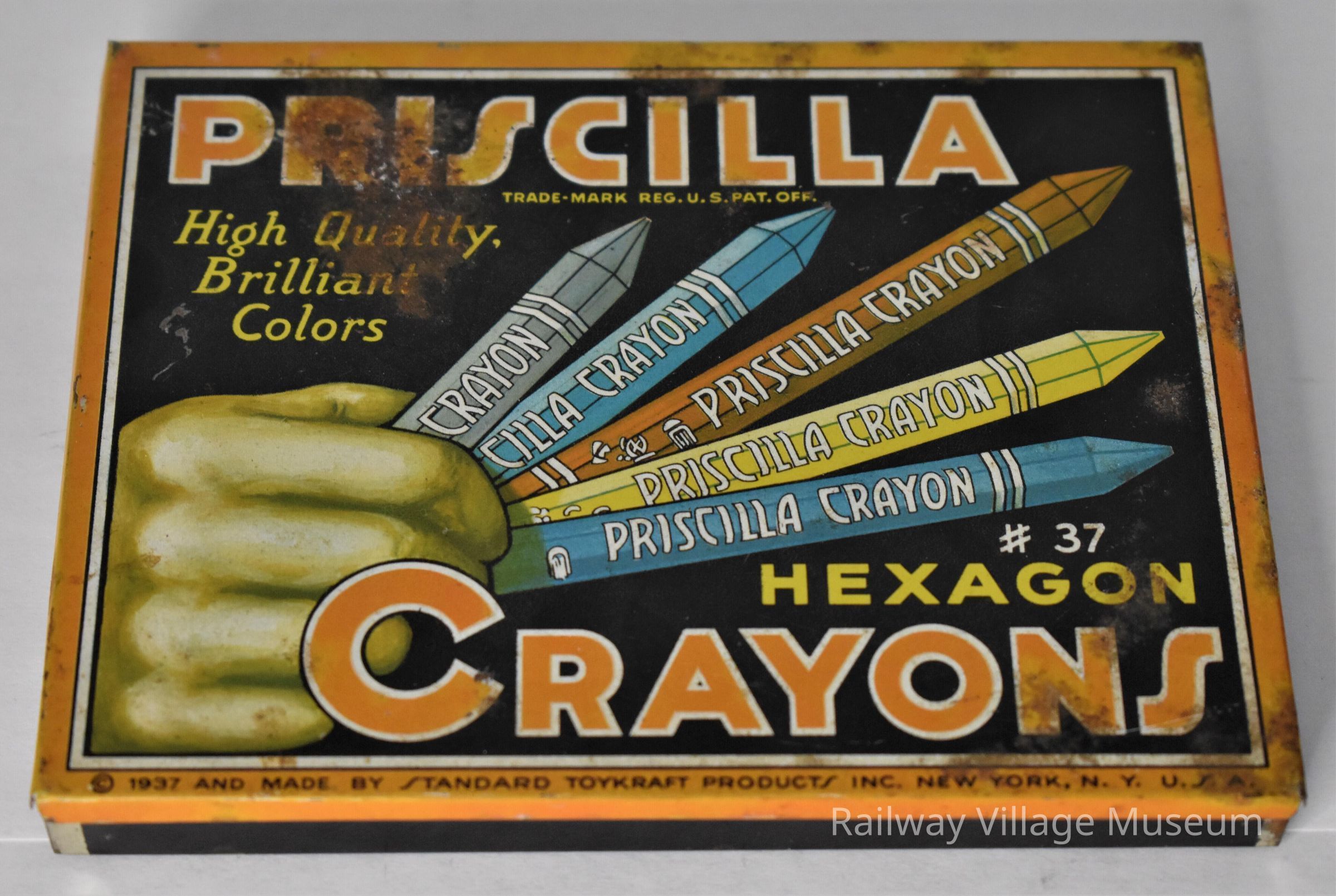 Priscilla Crayons tin with 8 crayons remaining. Made by Standard ToyKraft Products, Inc in 1937. Crayons in this tin show signs of use and most are slightly melted.