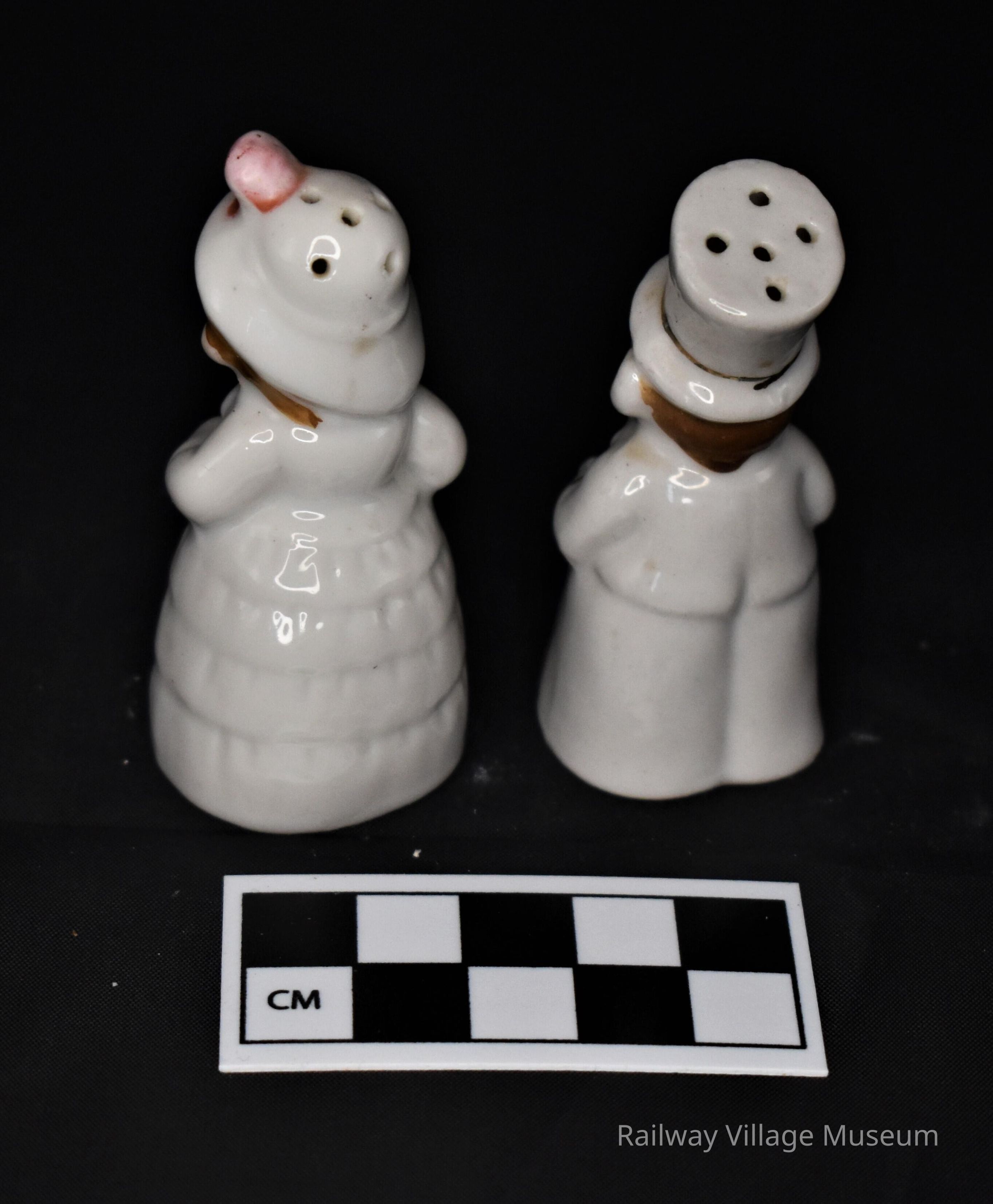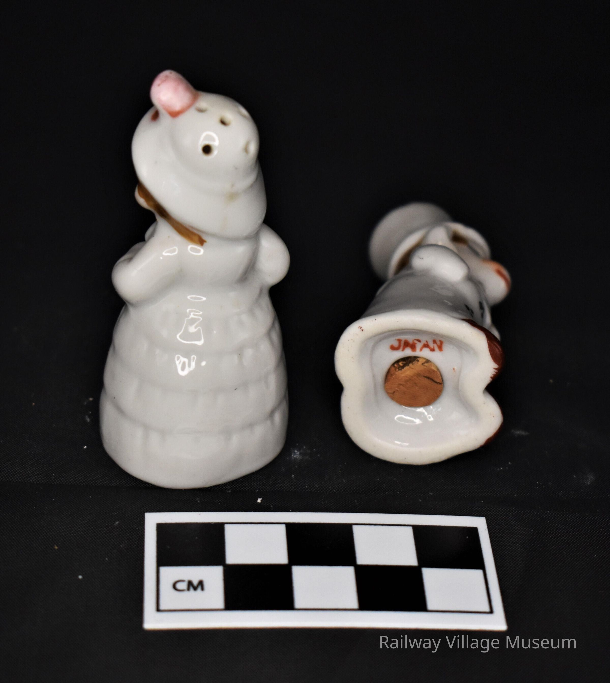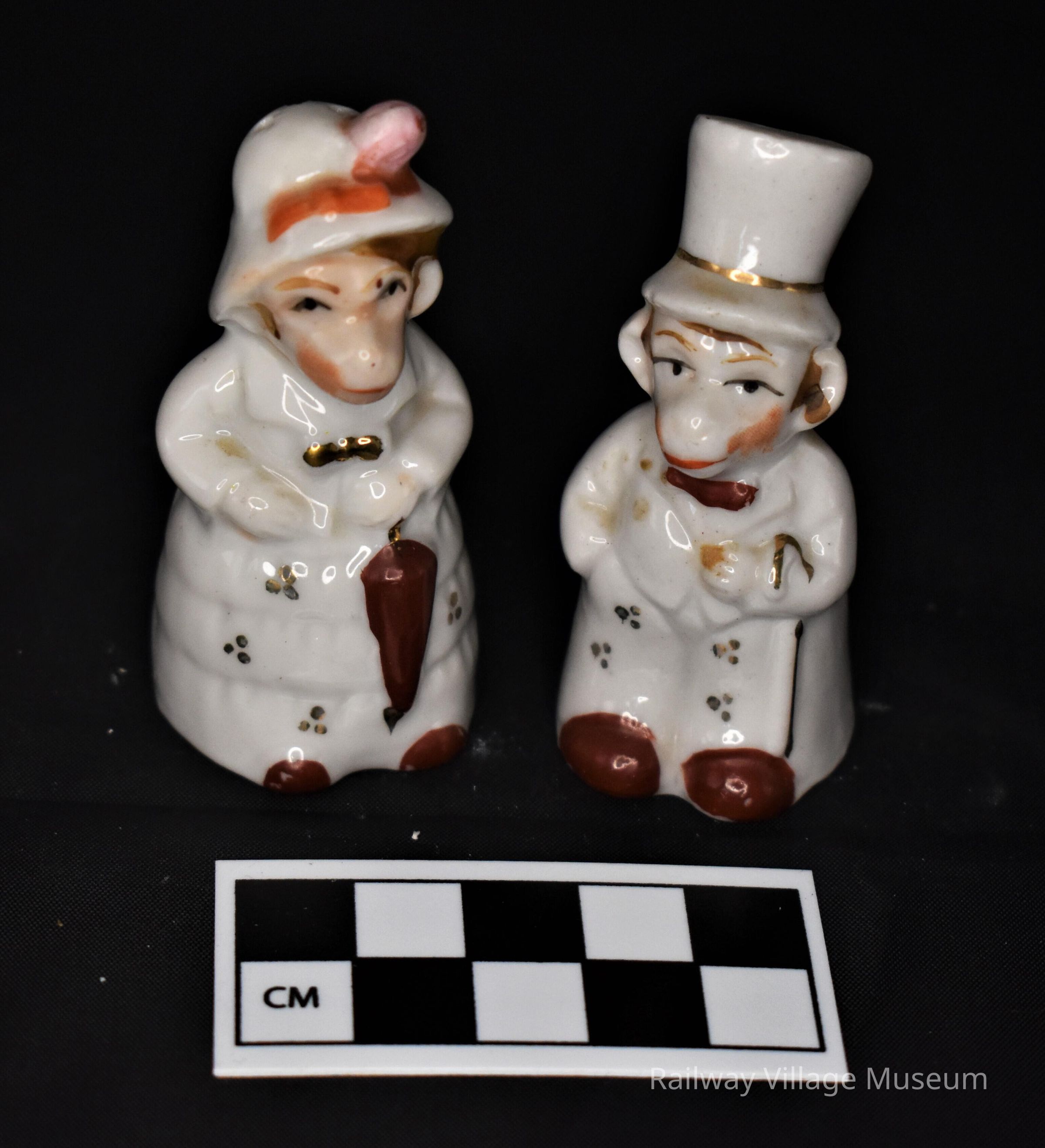 These small ceramic salt and pepper shakers are monkeys or chimpanzees dressed as a gentleman with top hat and cane and lady with hat and umbrella. Both have cork stoppers in place and are labeled with "Japan".