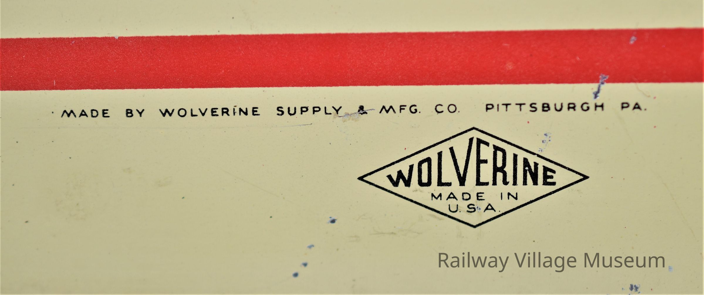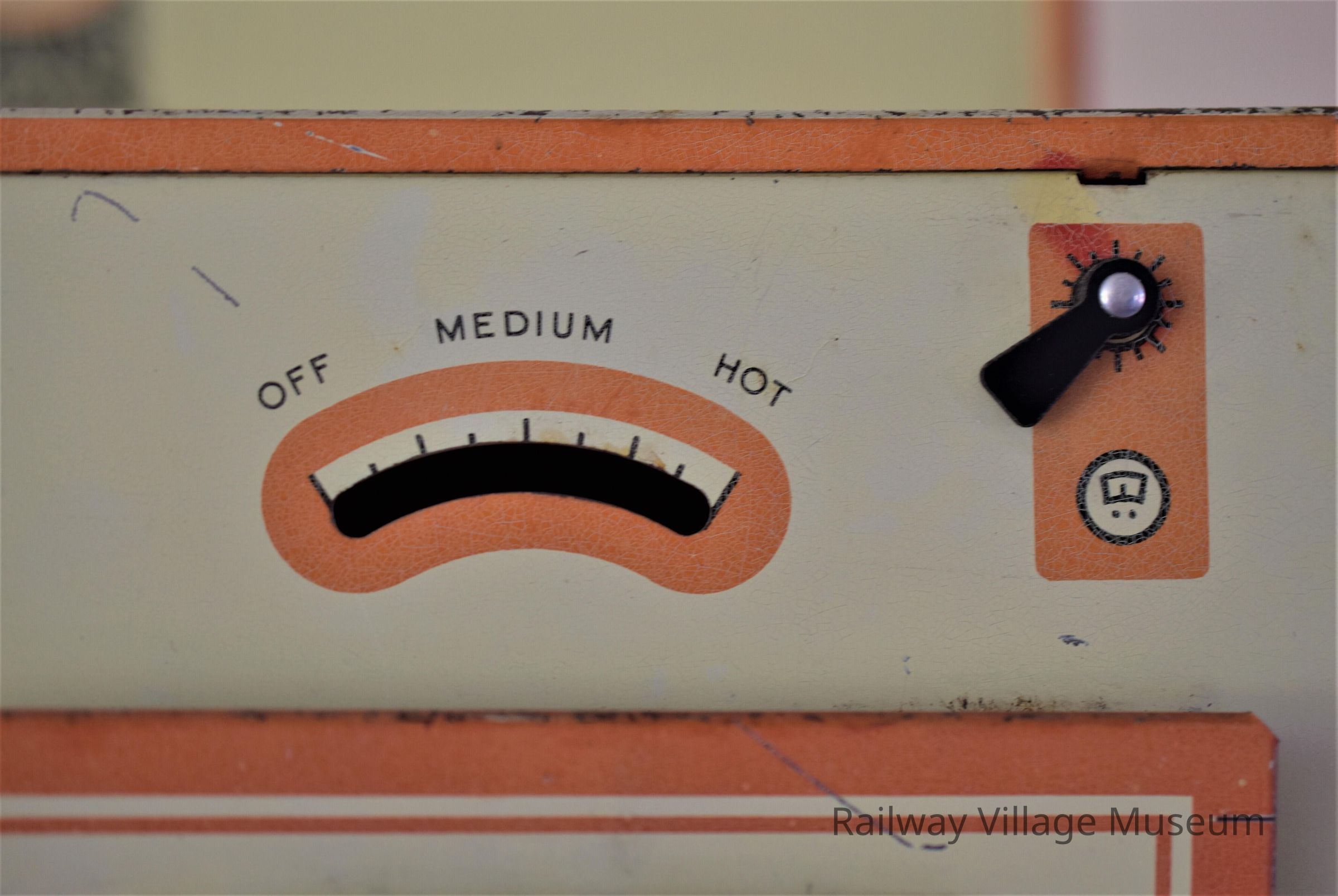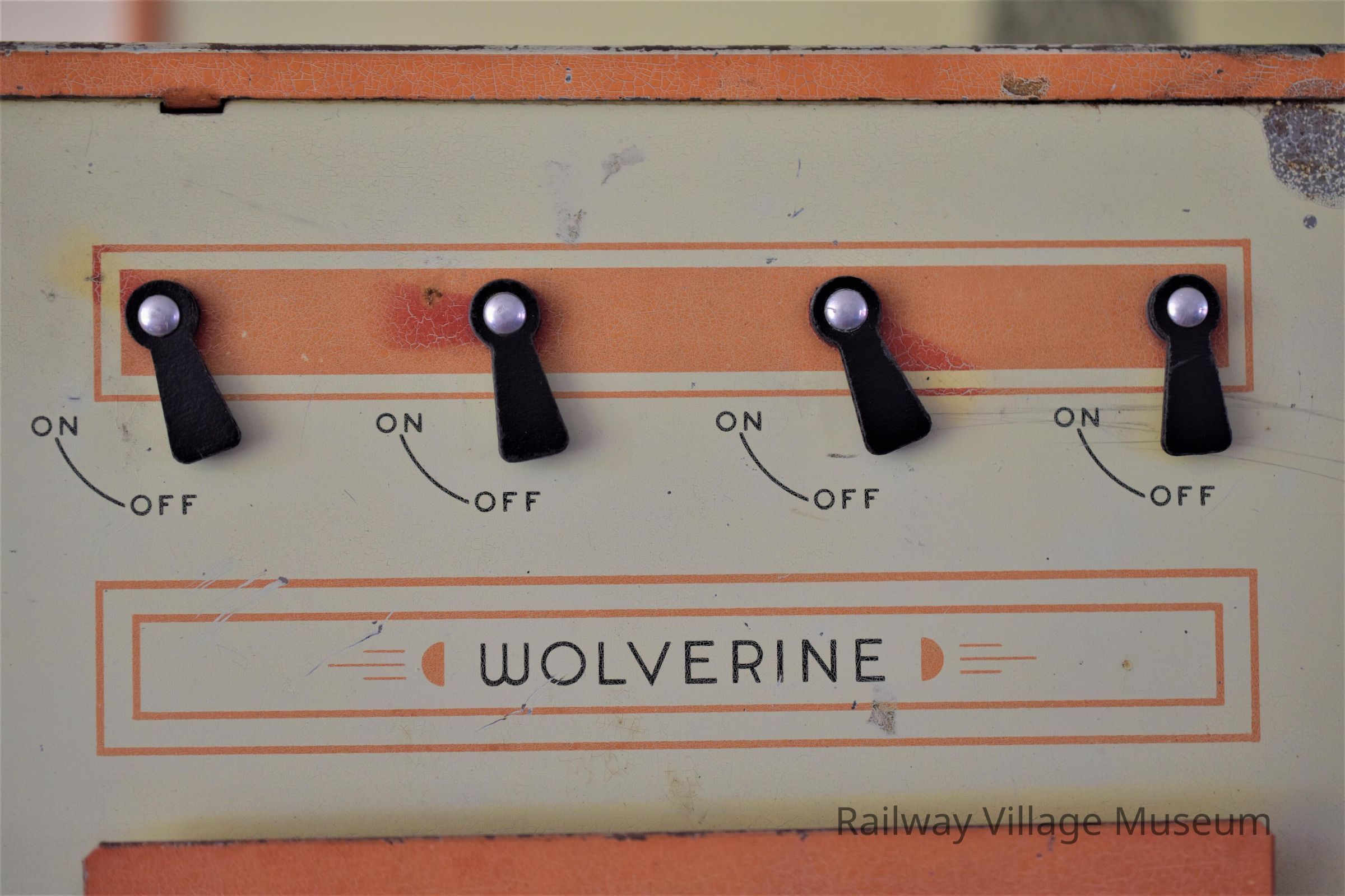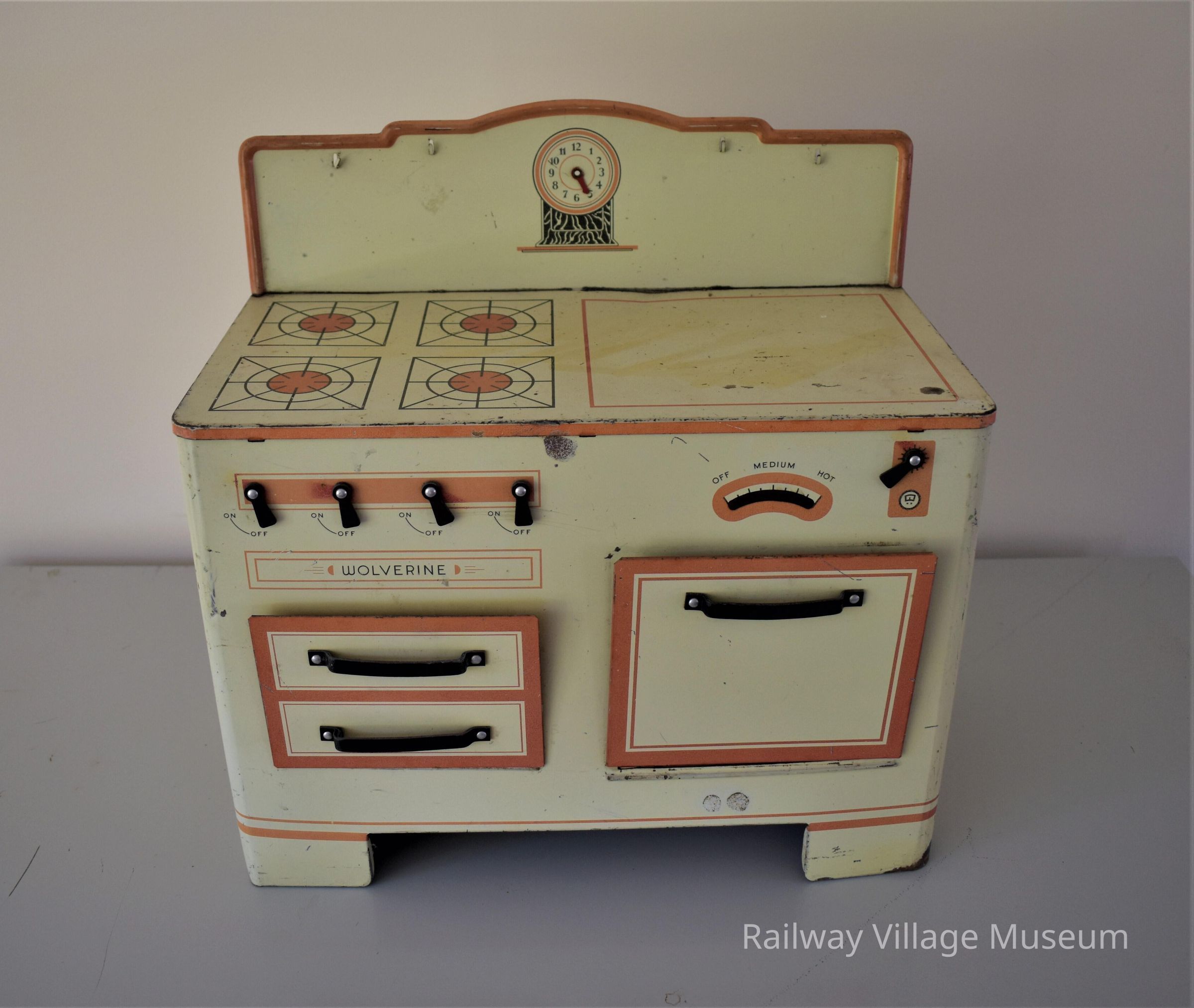 An orange and white wolverine stove. The doors all open, and the levers still turn. There is one missing lever.Made/Created