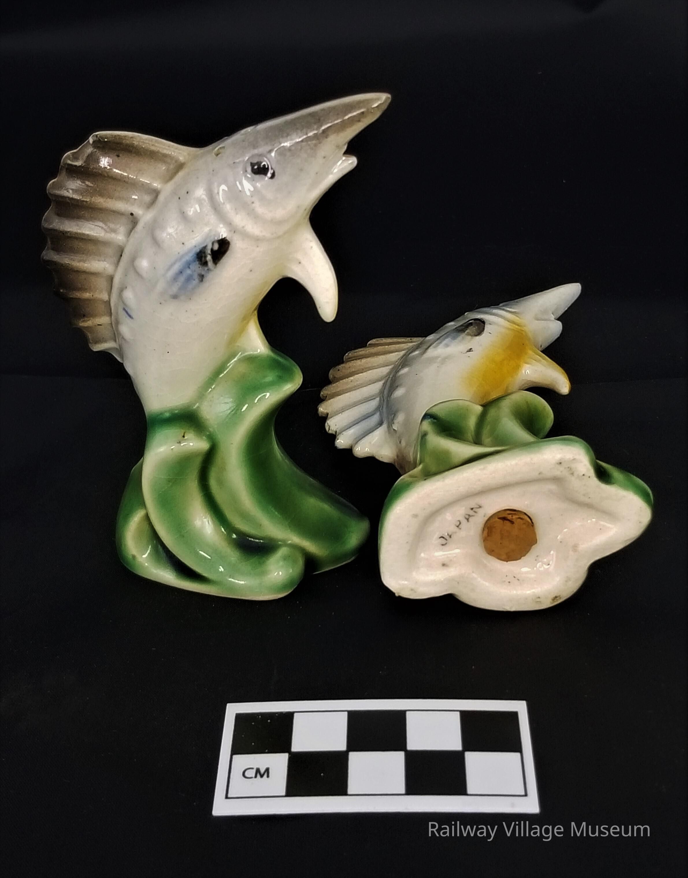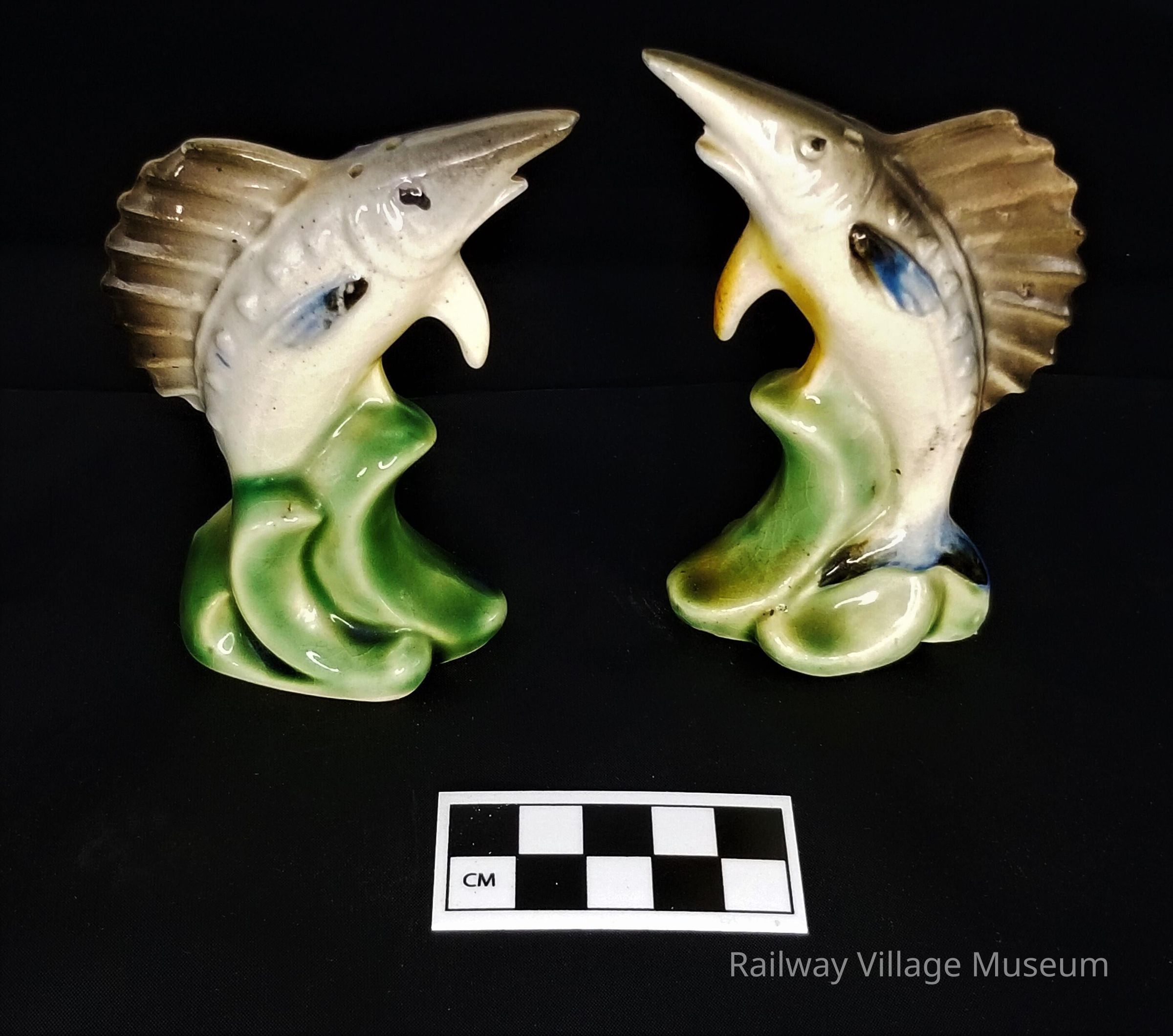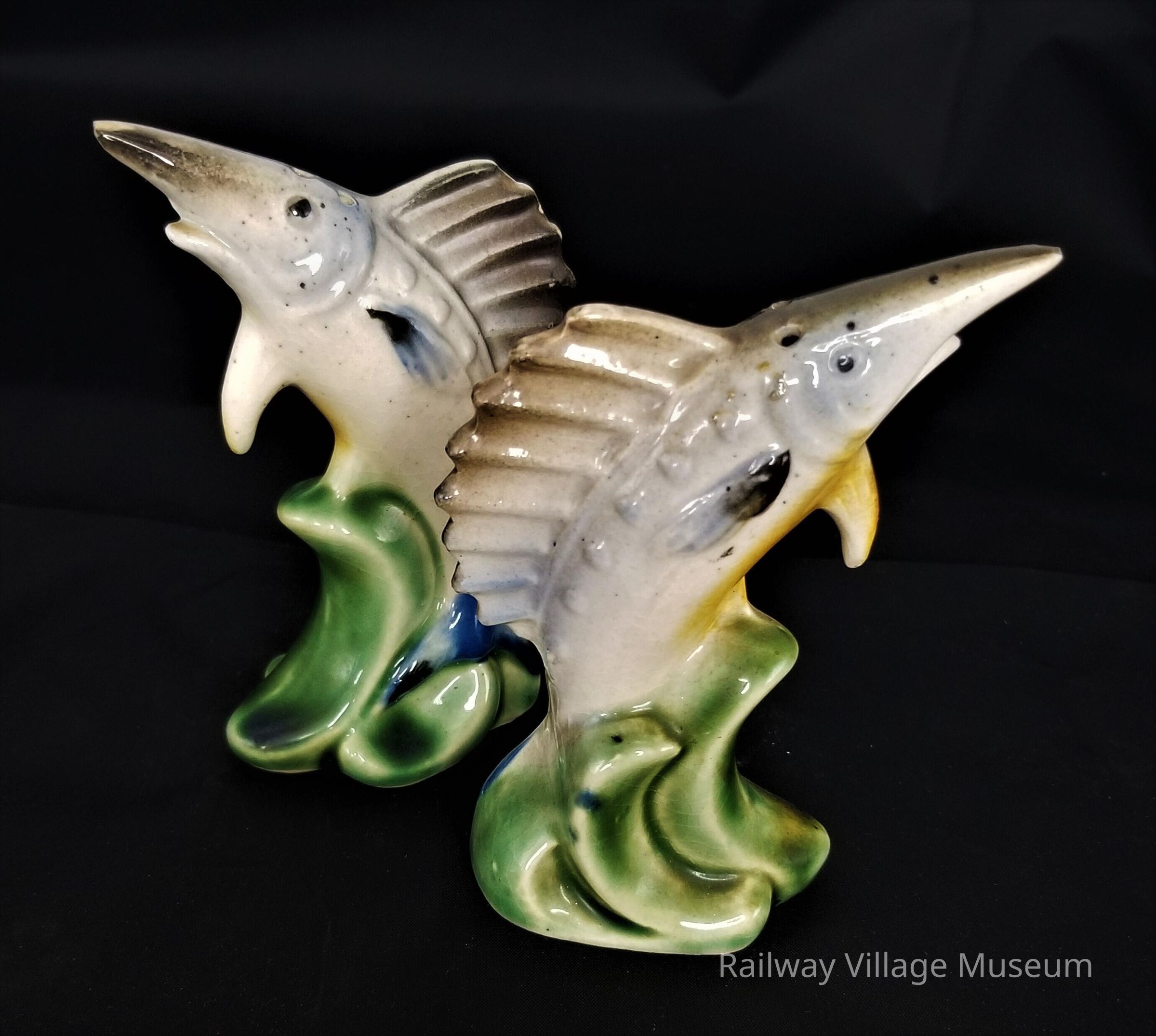 These identical ceramic swordfish shakers were made in Japan. Ceramic tropical and game fish were popular designs and there are diverse species represented in shakers from the 1950s.
