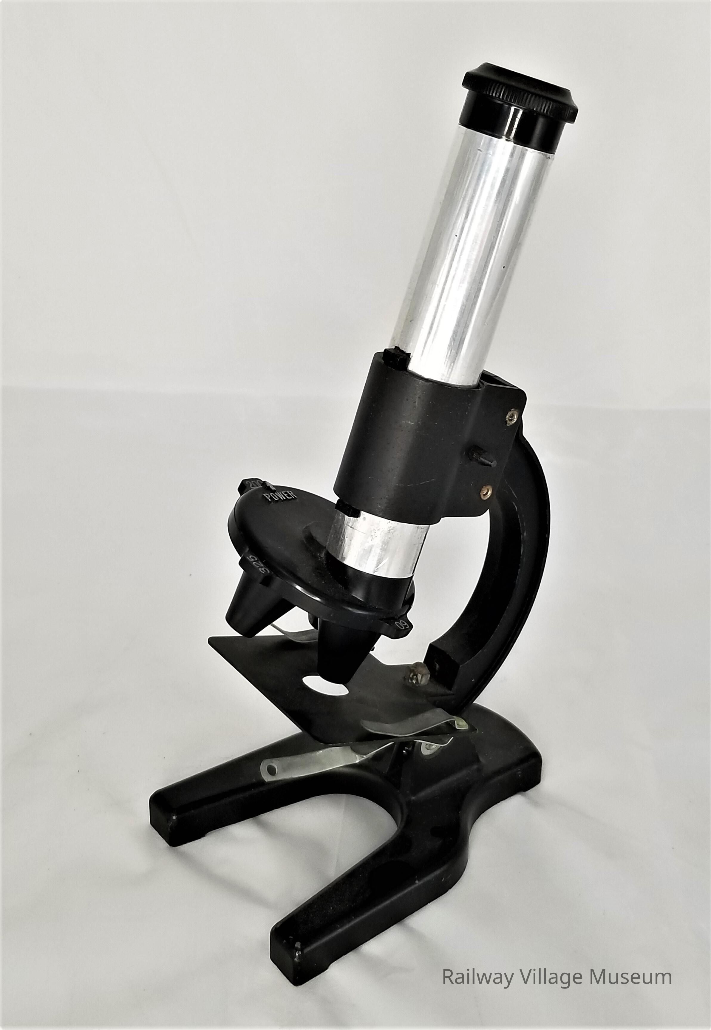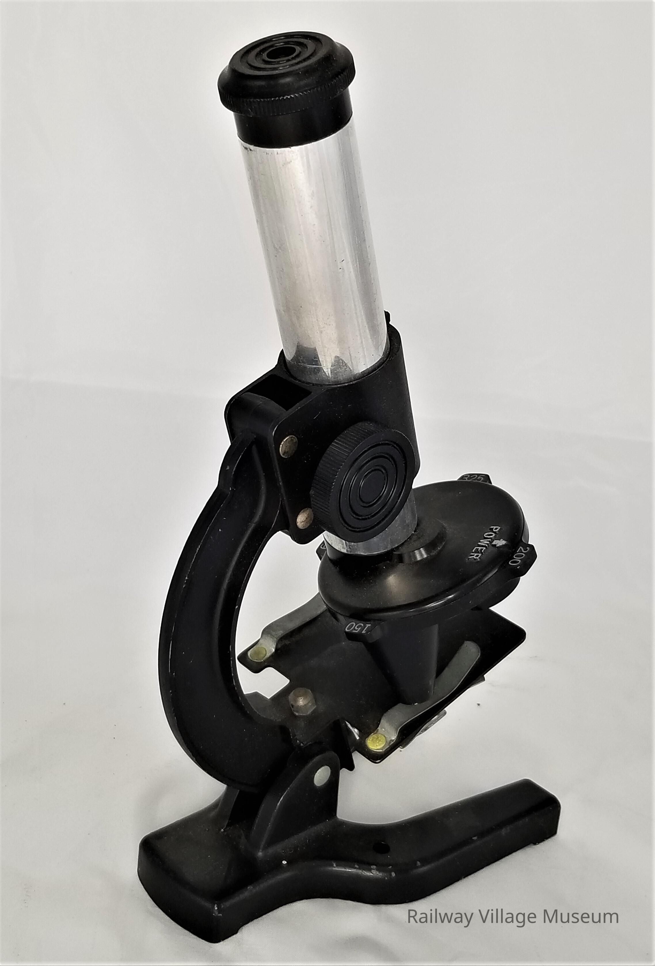 This unmarked microscope has 4 power settings: 60, 150, 200, 325. The microscope is missing its mirror and is non-functioning. This item is part of the BRV education collection for display purposes.