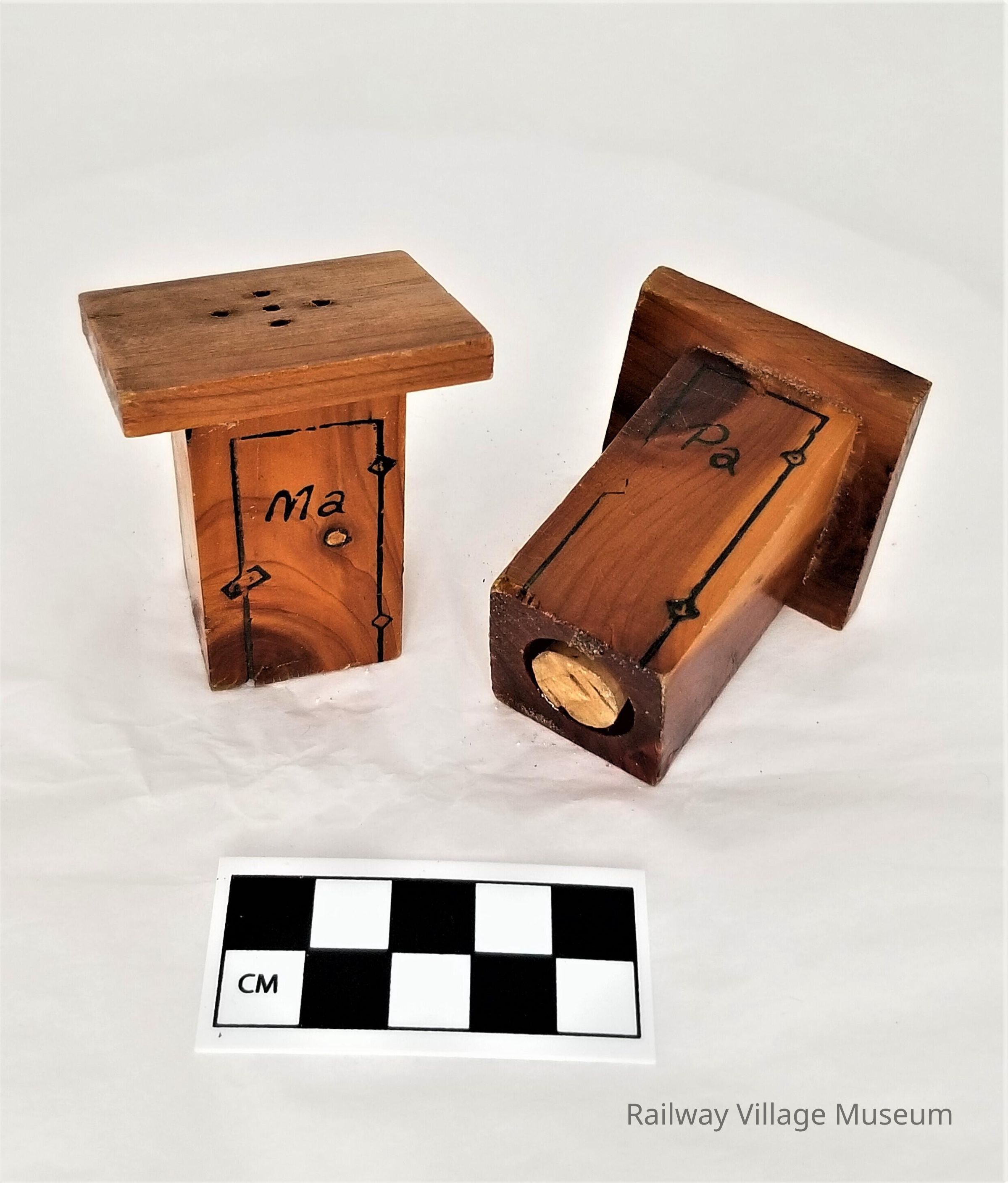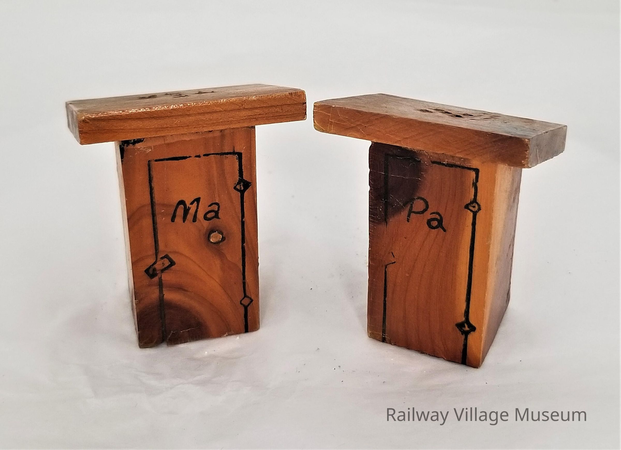 Wooden "Ma" and "Pa" outhouse salt and pepper shakers. The "Ma" shaker has the label "White Mts., N.H."