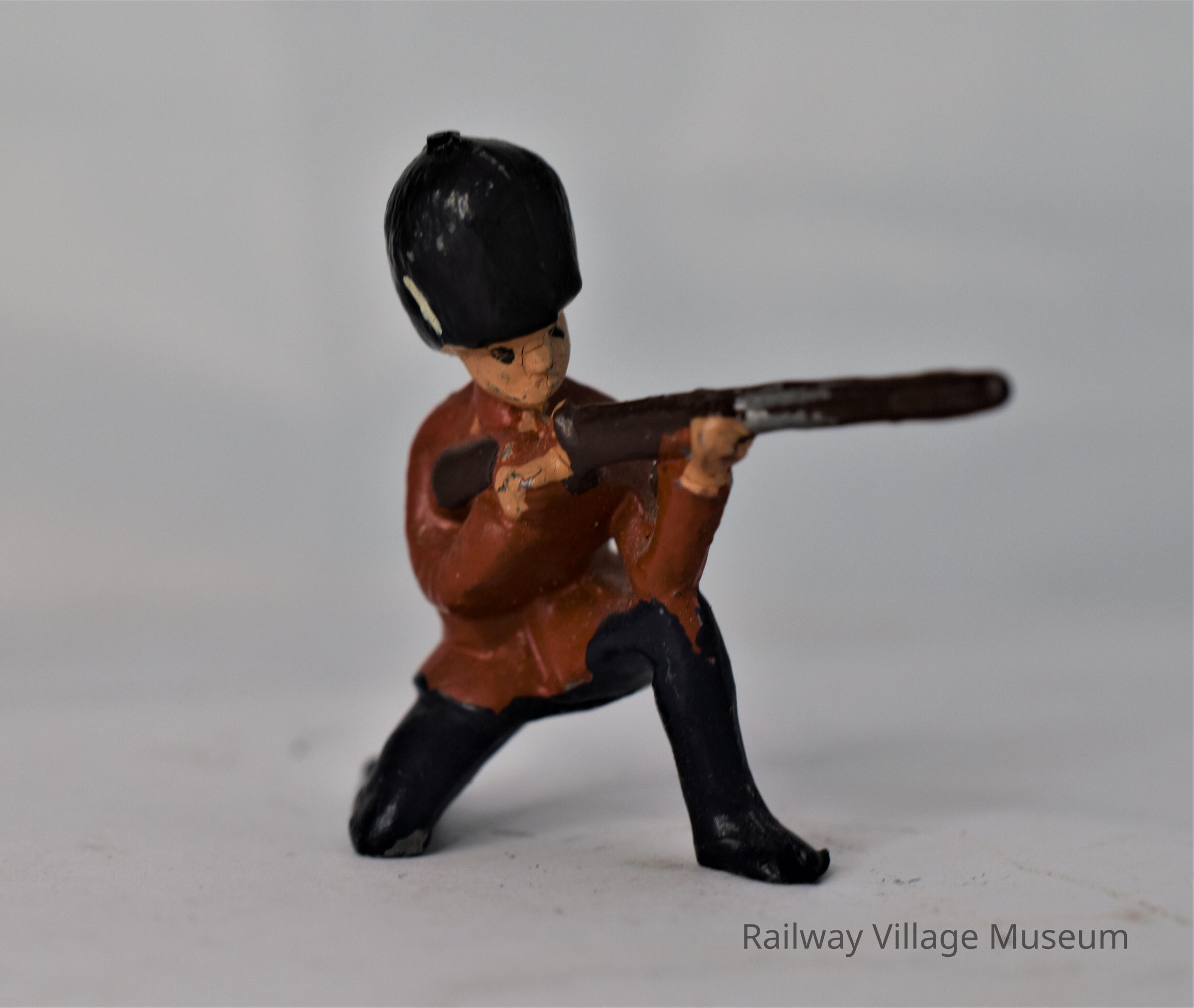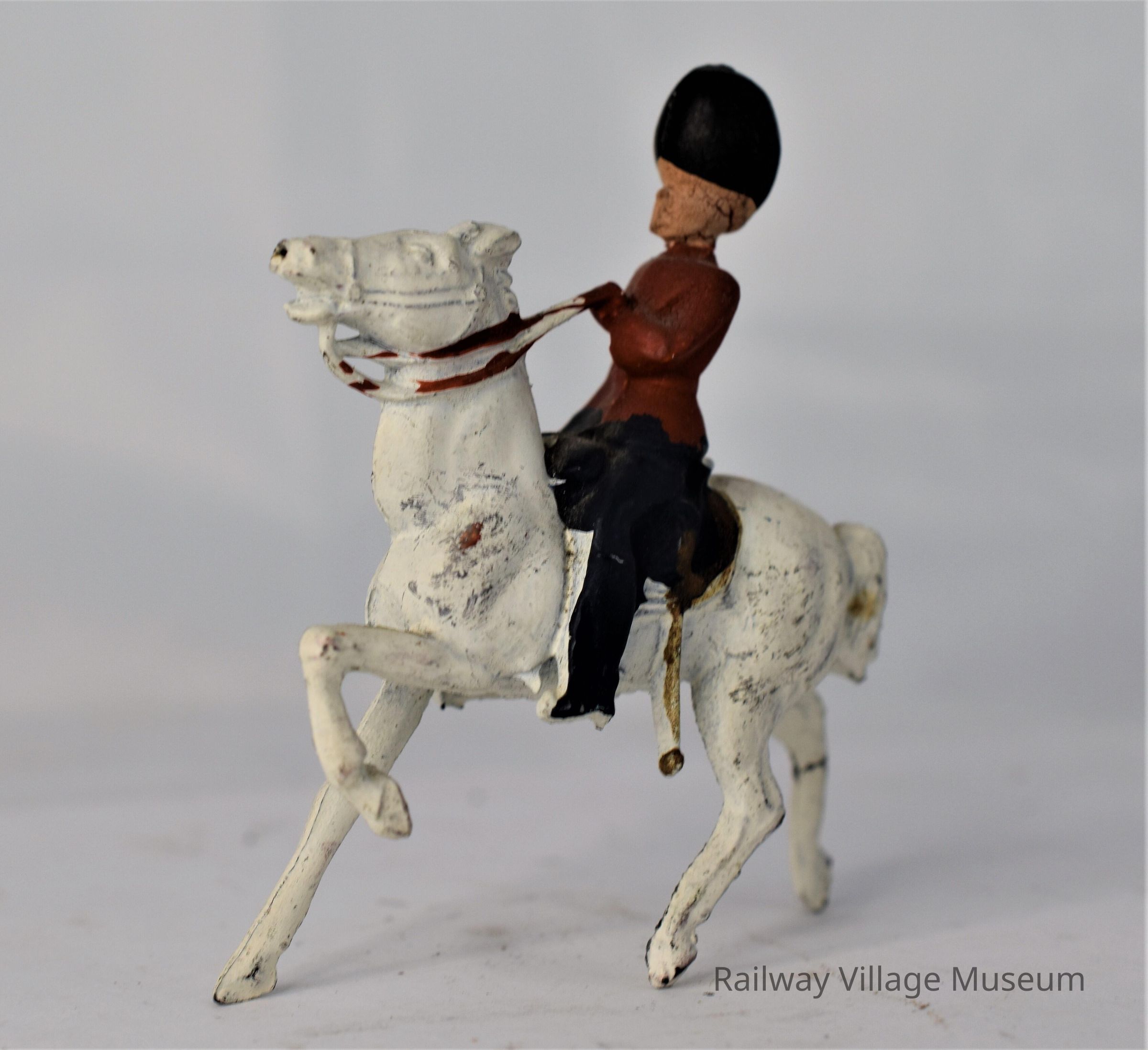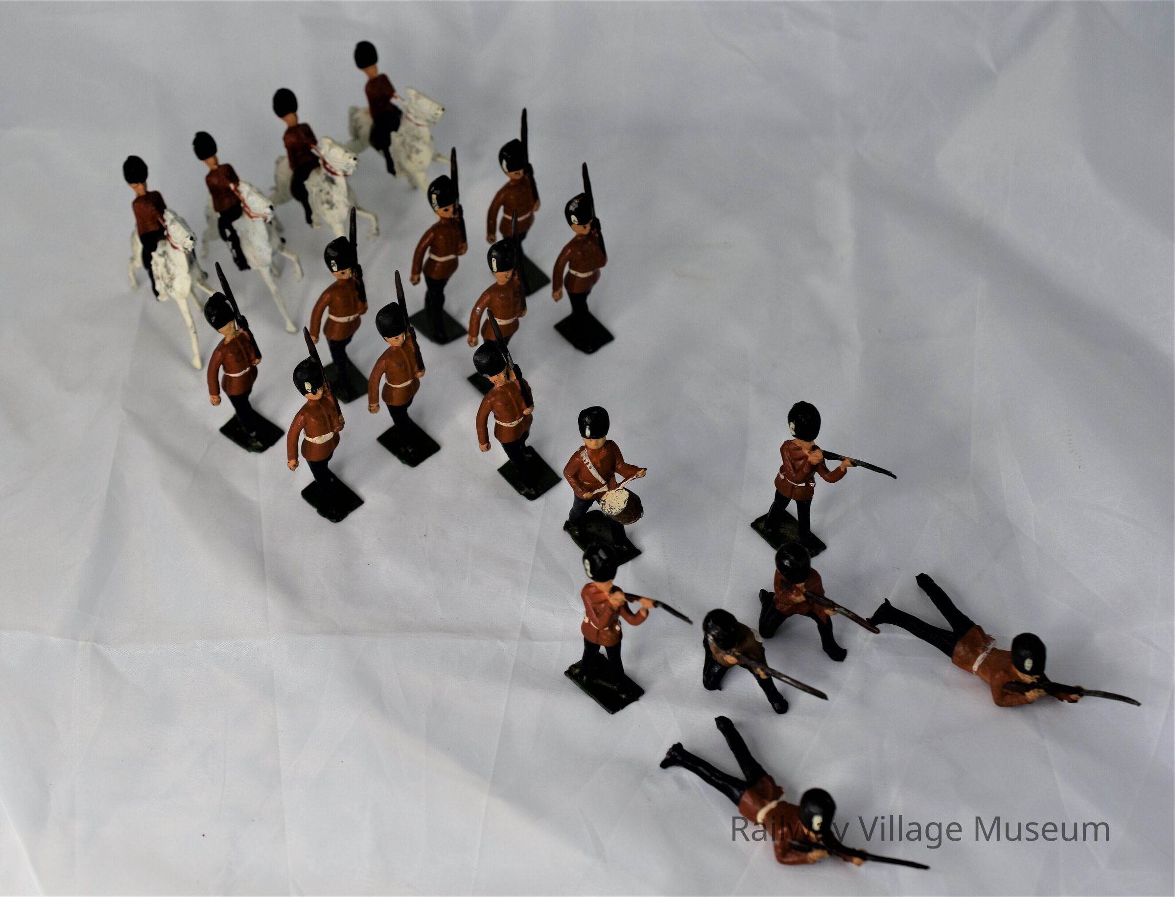 A set of 20 British soldiers, manufactured by Crescent Toys Inc. The horses' stomachs have the makers mark on them. Each soldier wears the same outfit.