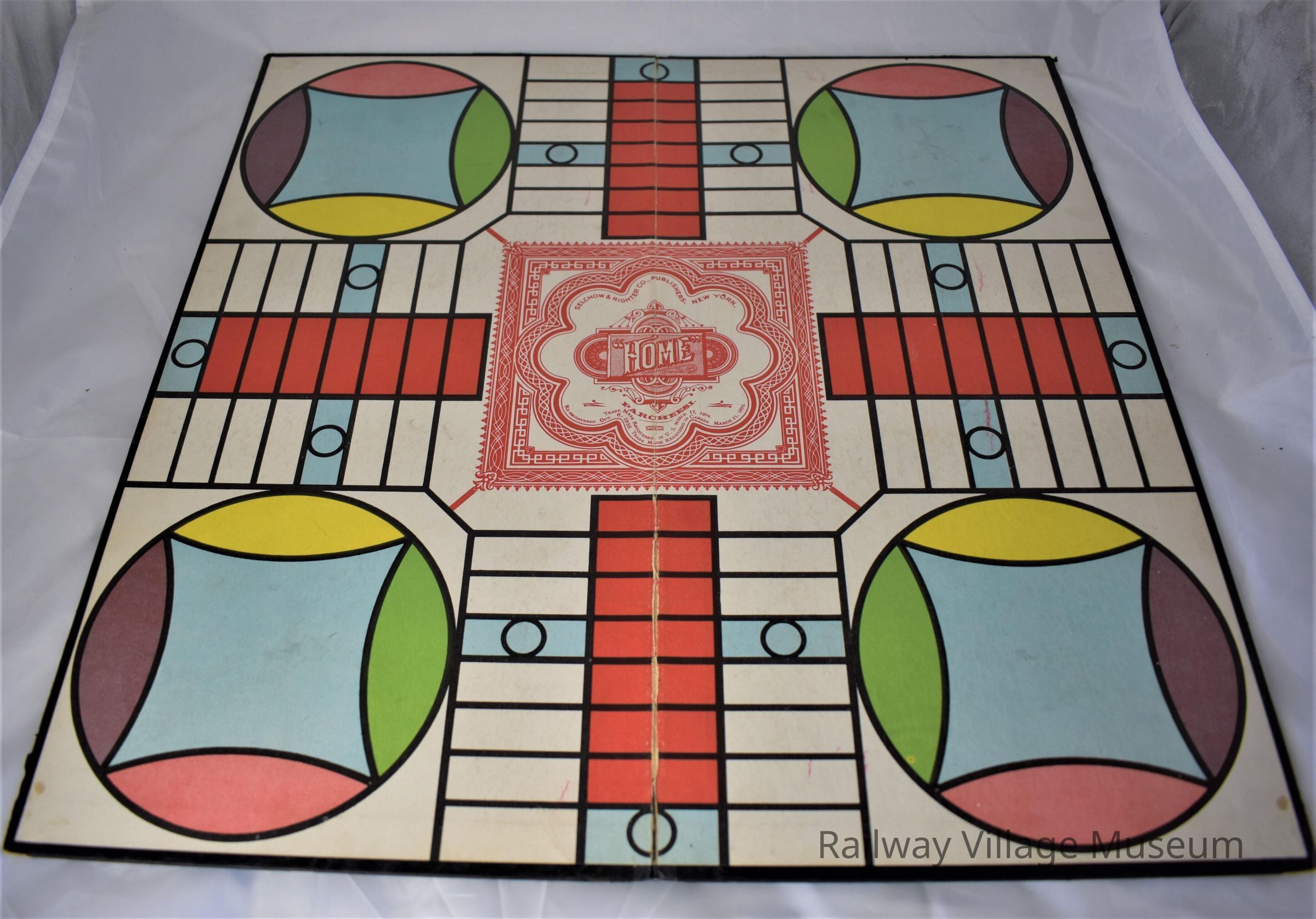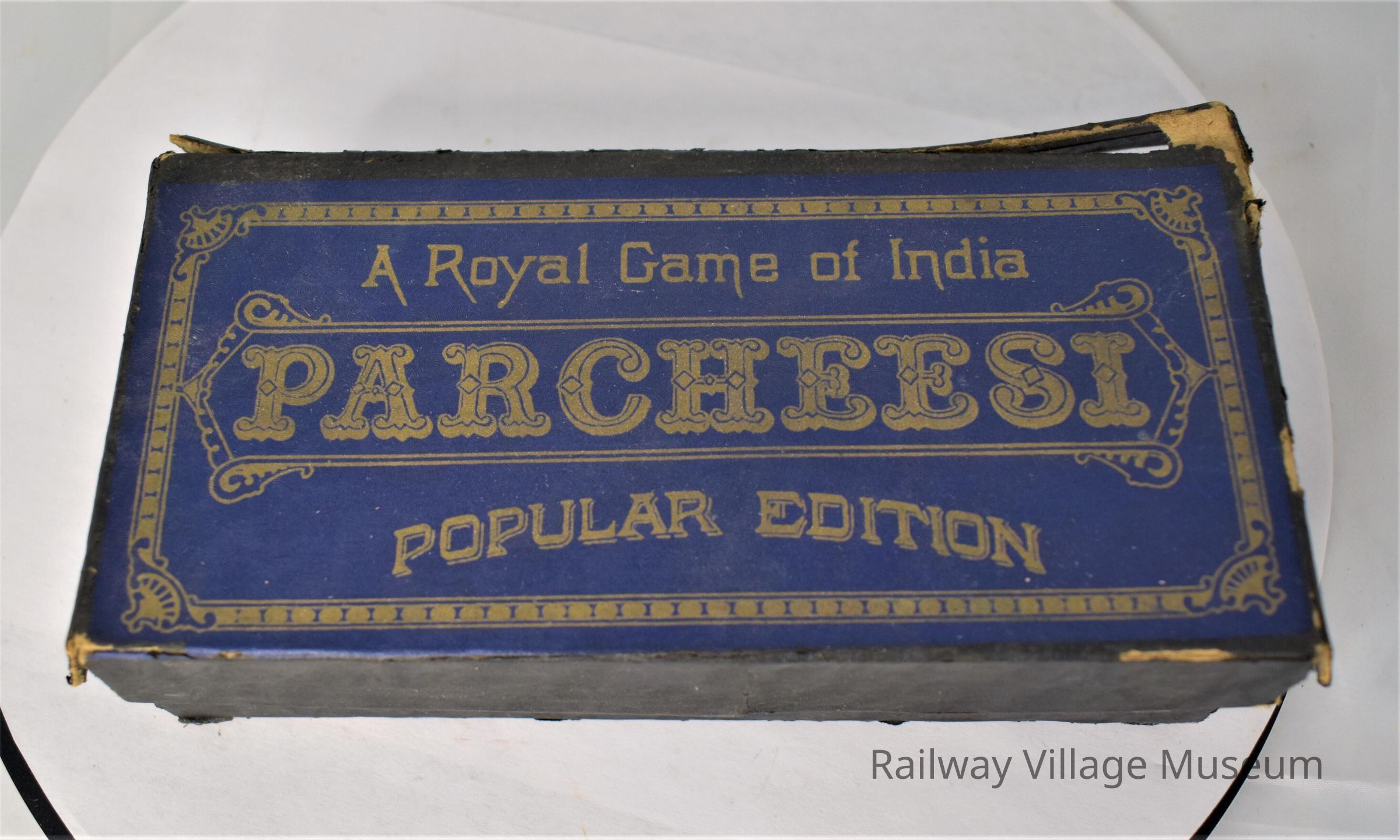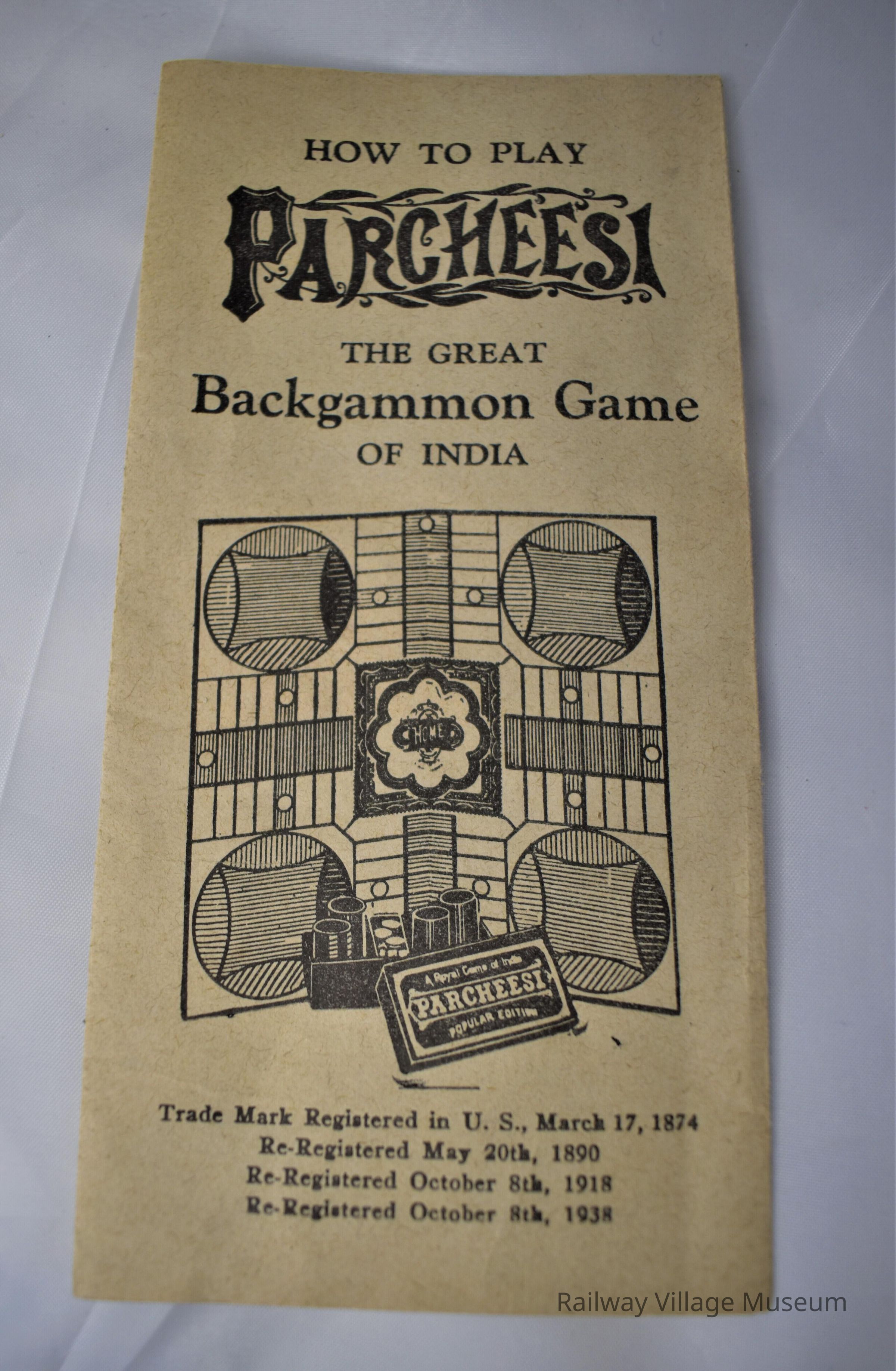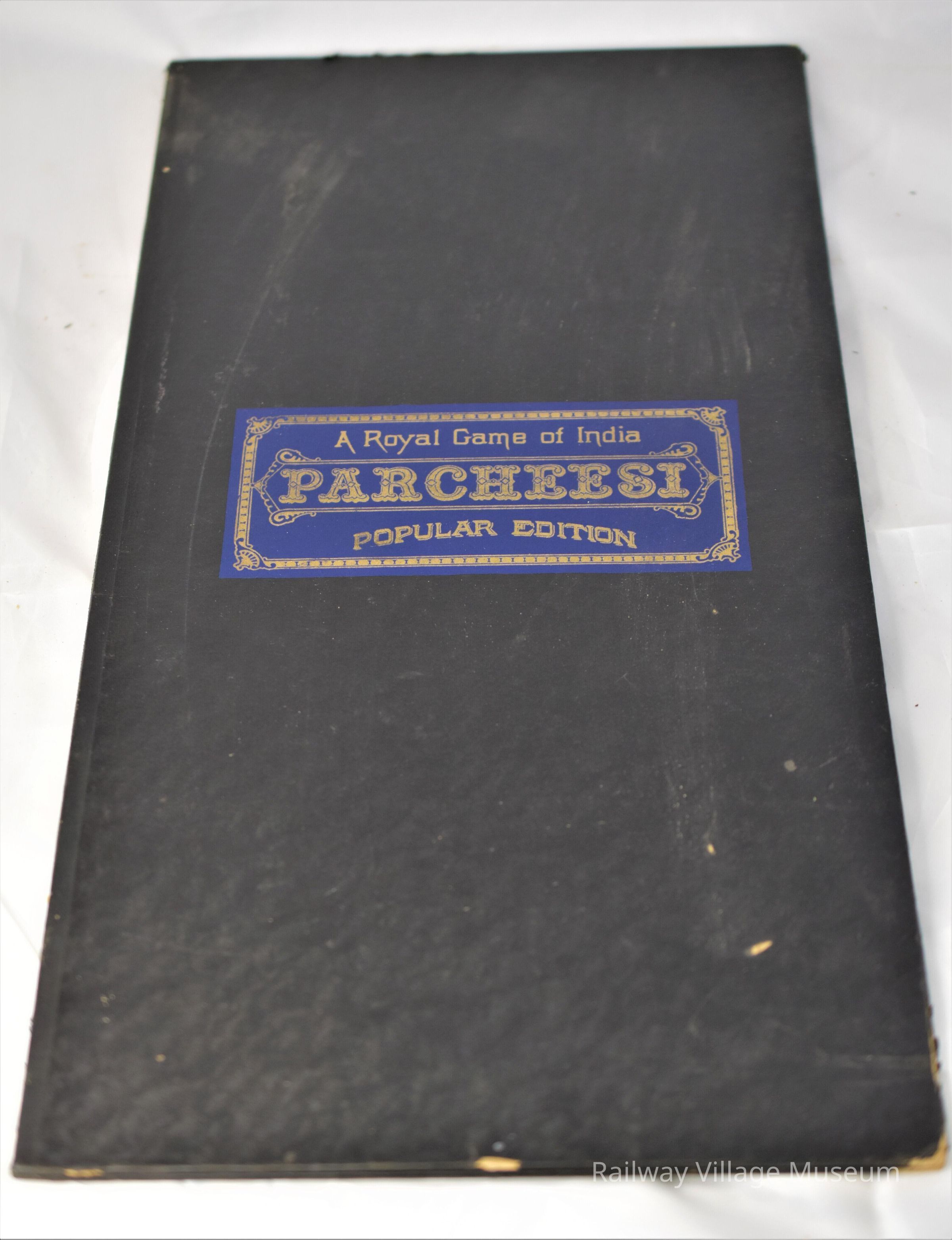 Parcheesi is a backgammon game that originated in India. The board has little nicks in it, and the game piece box is falling apart. The dice that come with the game are not the original dice, and the game is missing a few of its tokens.Made/Created