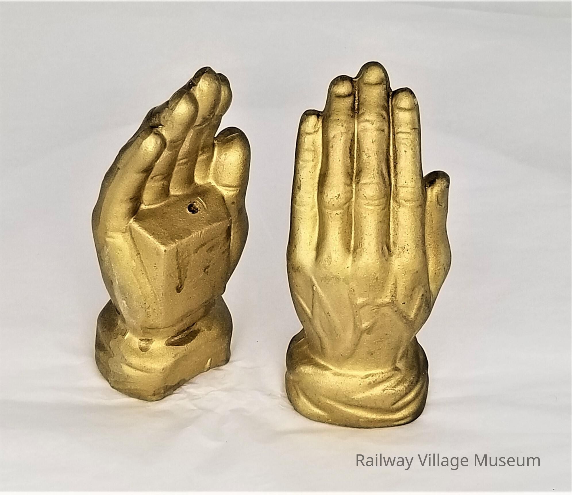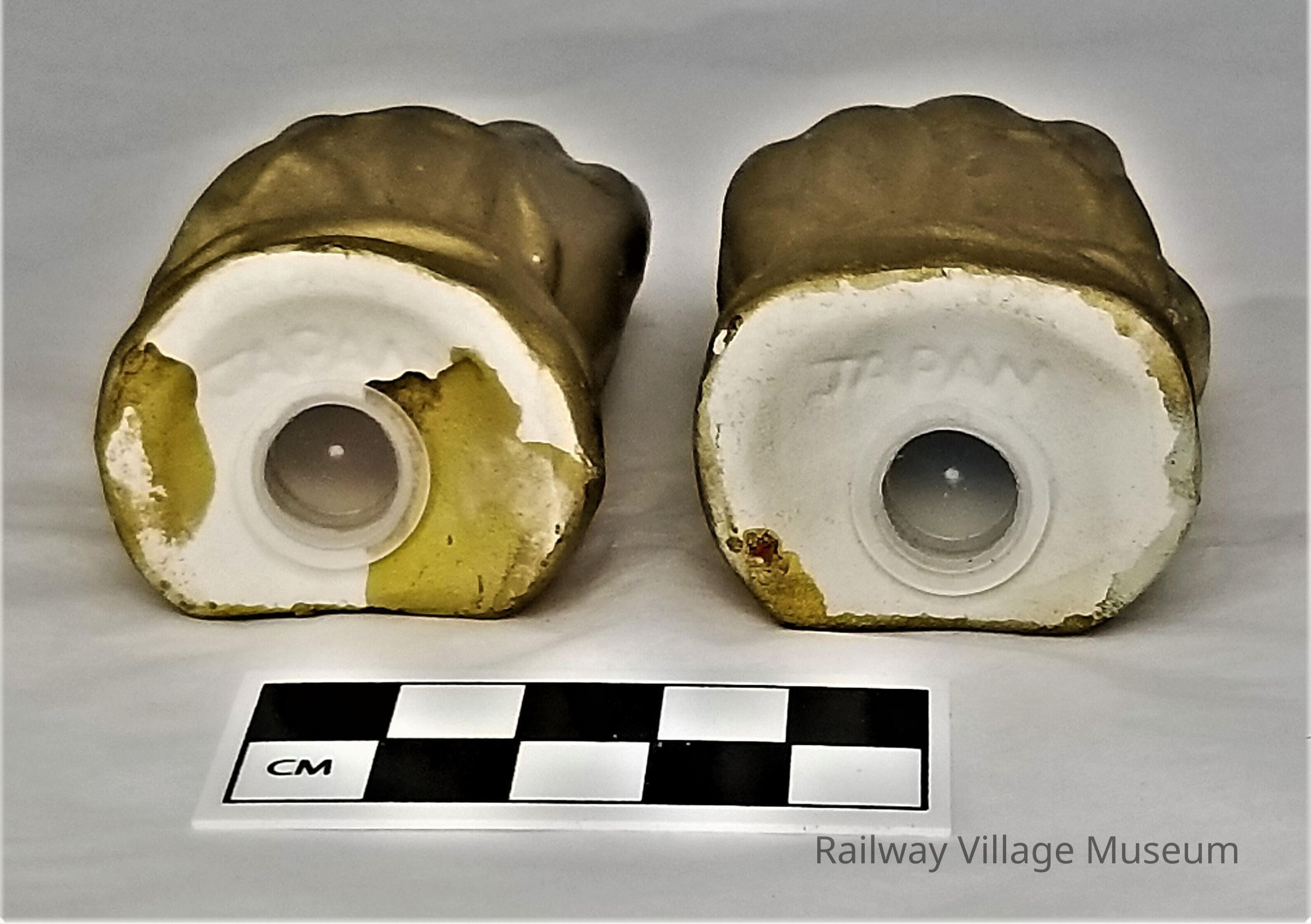 Salt and pepper shakers in the form of praying hands. White ceramic painted gold. "Japan" impressed on bottom of each shaker.