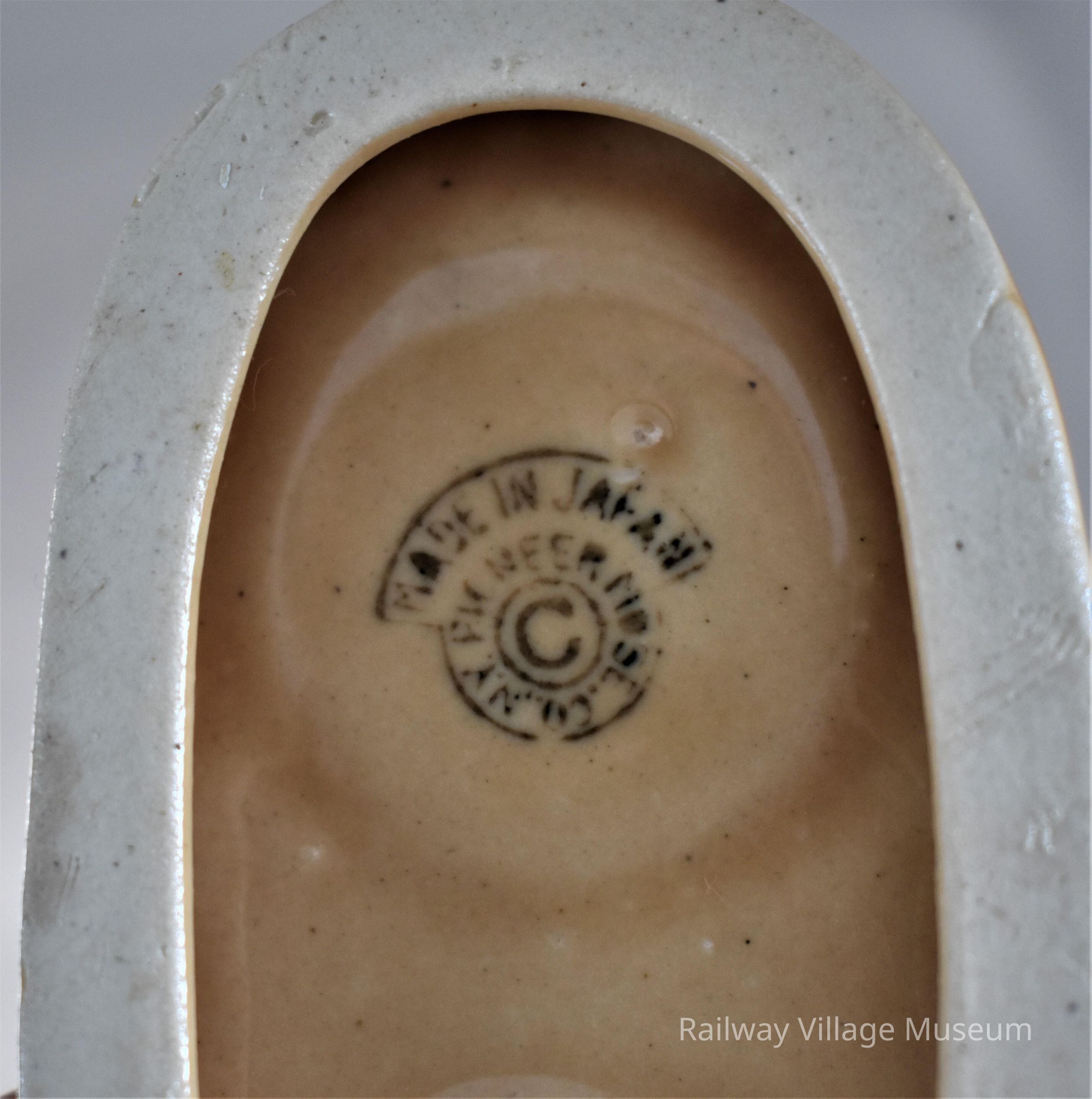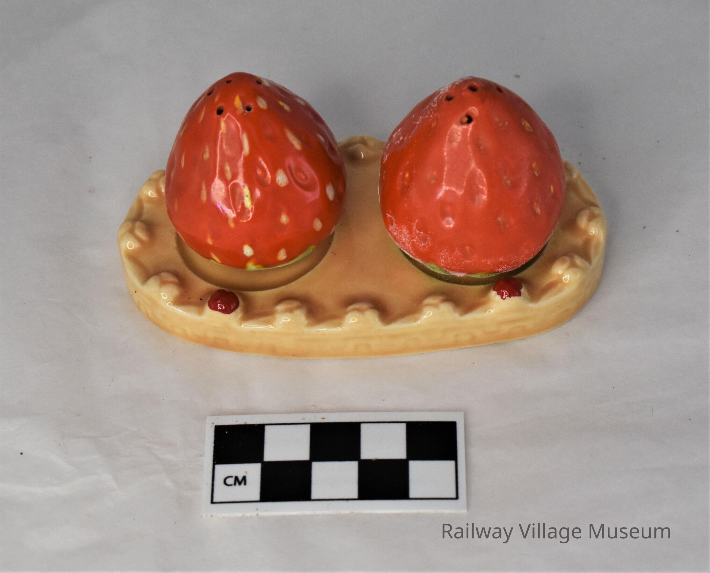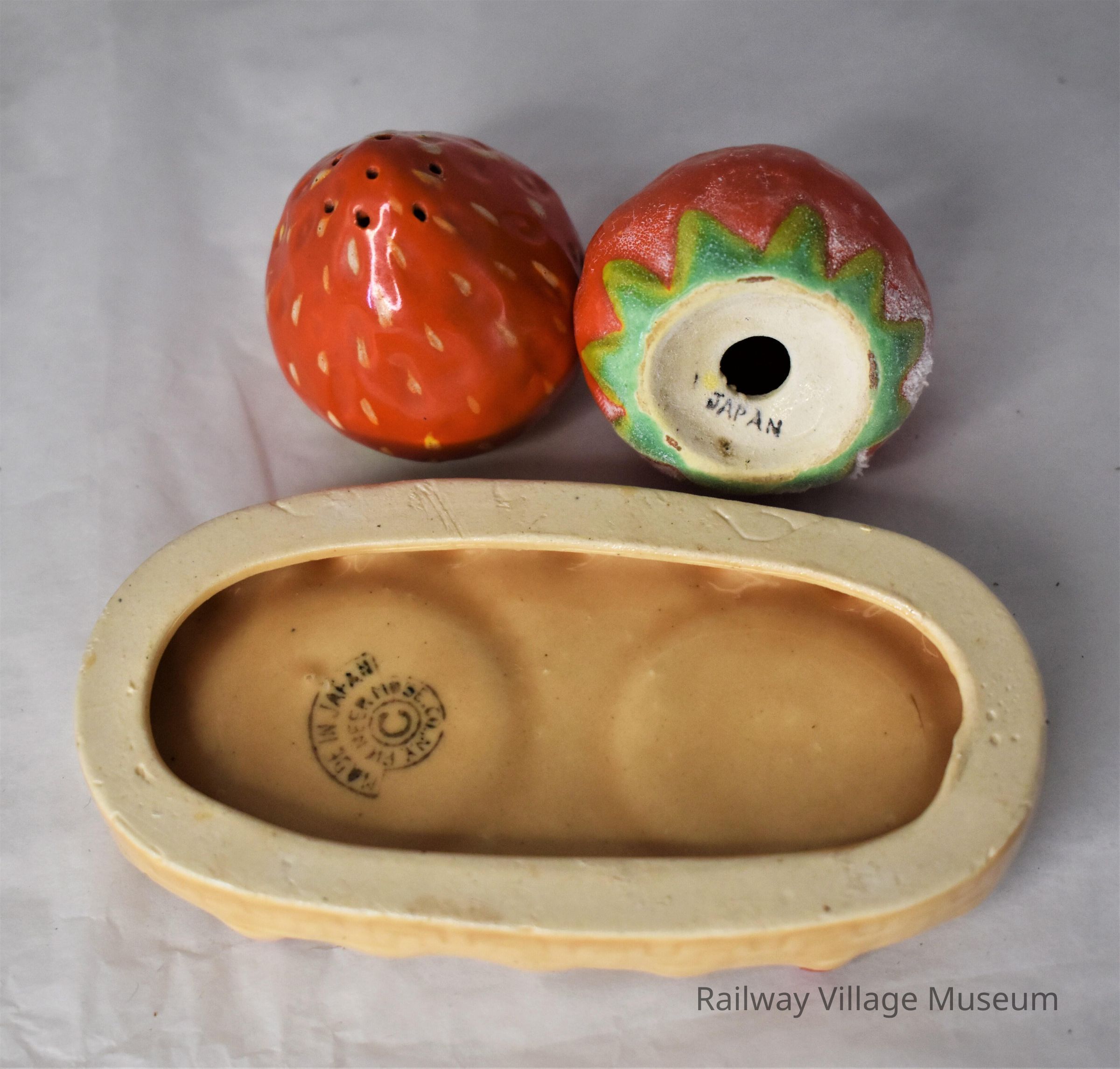 This ceramic salt and pepper set includes two matching strawberry shakers sitting atop a small dish that looks like a pastry. Only one of the shakers still has the cork stopper intact. Both shakers are stamped with "Japan". The bottom of the pastry dish has a full maker's mark from the Pioneer Mose Co. N.Y.