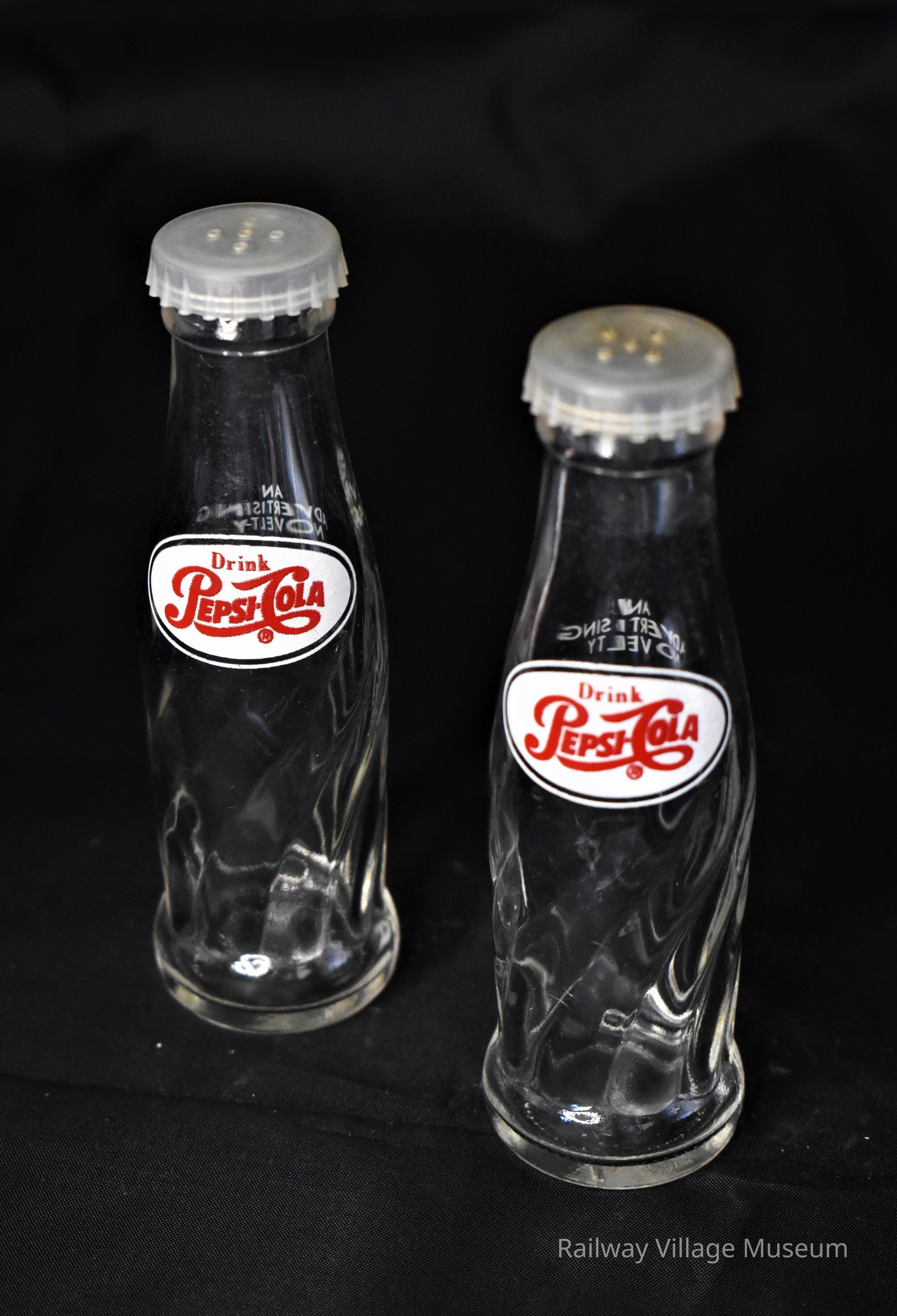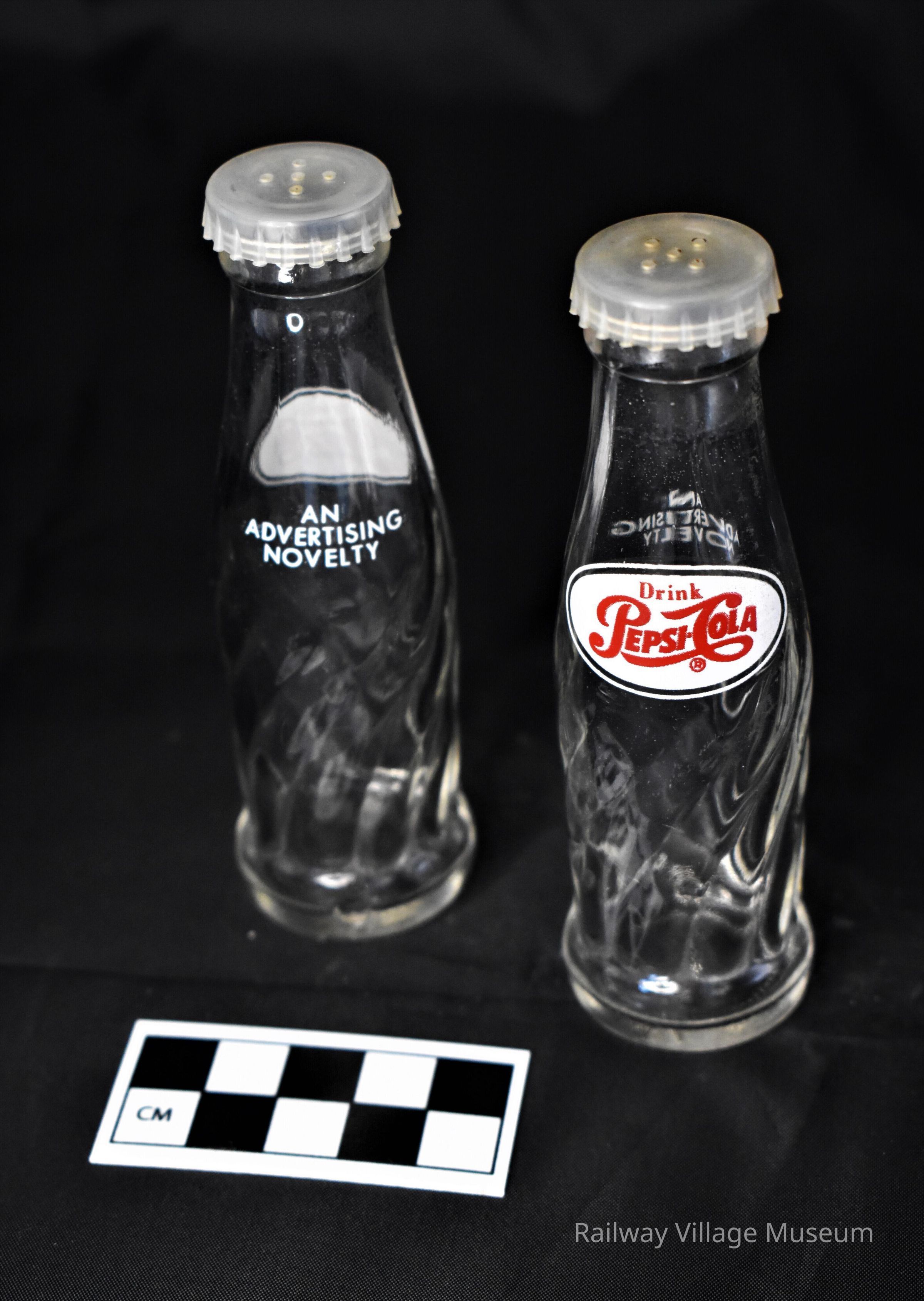 Glass salt and pepper shakers shaped like miniature Pepsi cola bottles with plastic caps. The back of each shaker is labeled "An Advertising Novelty".