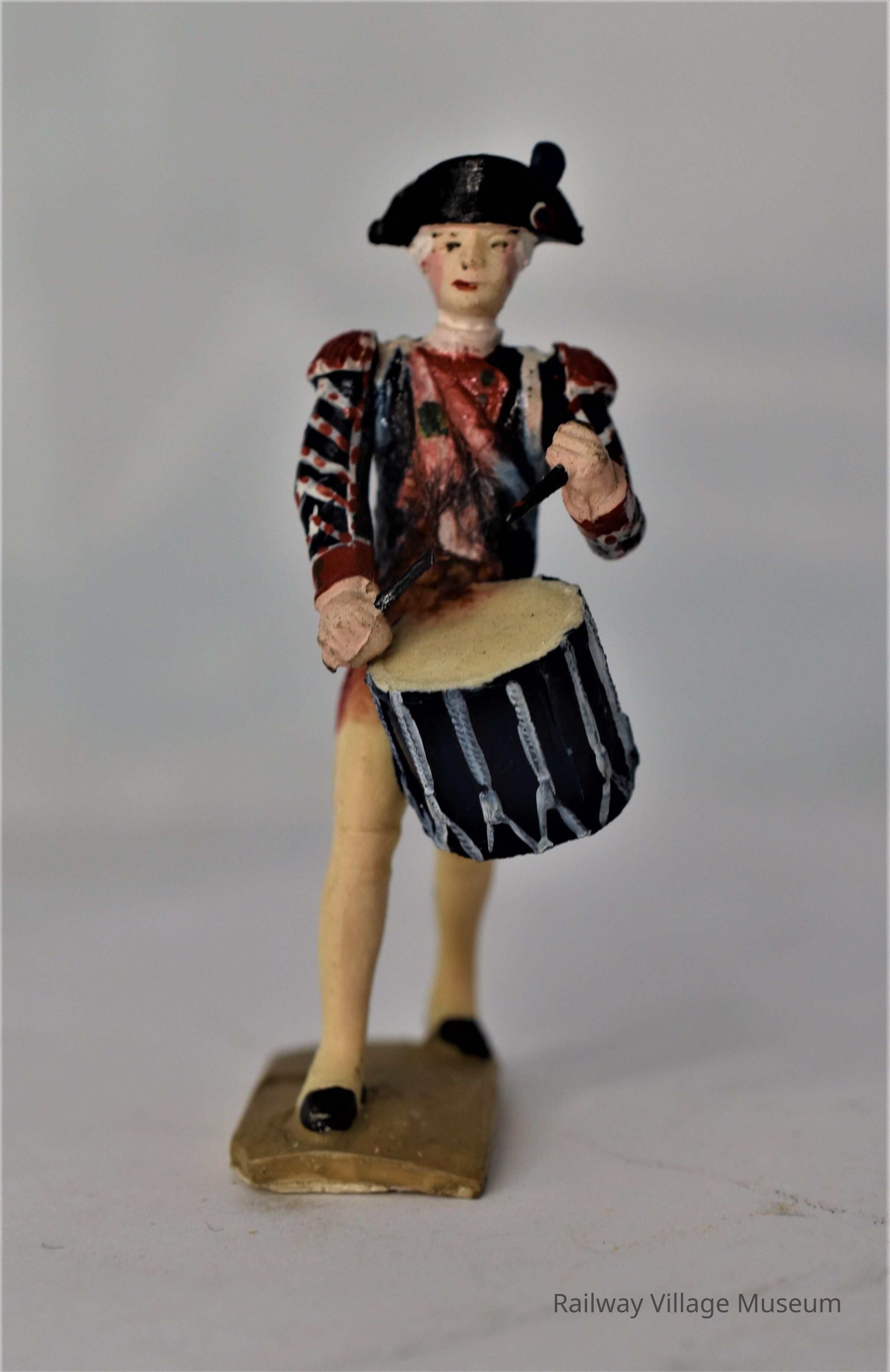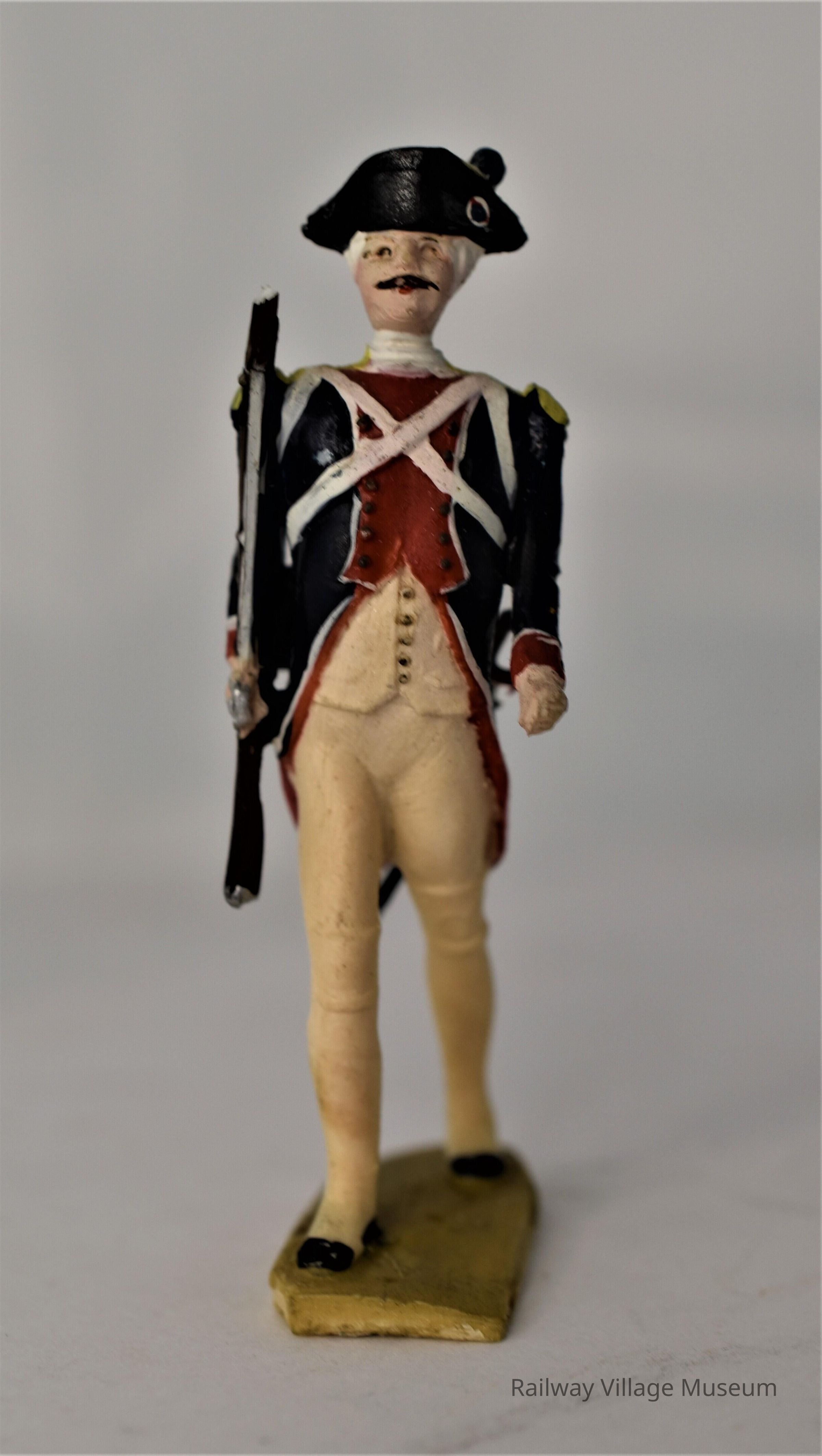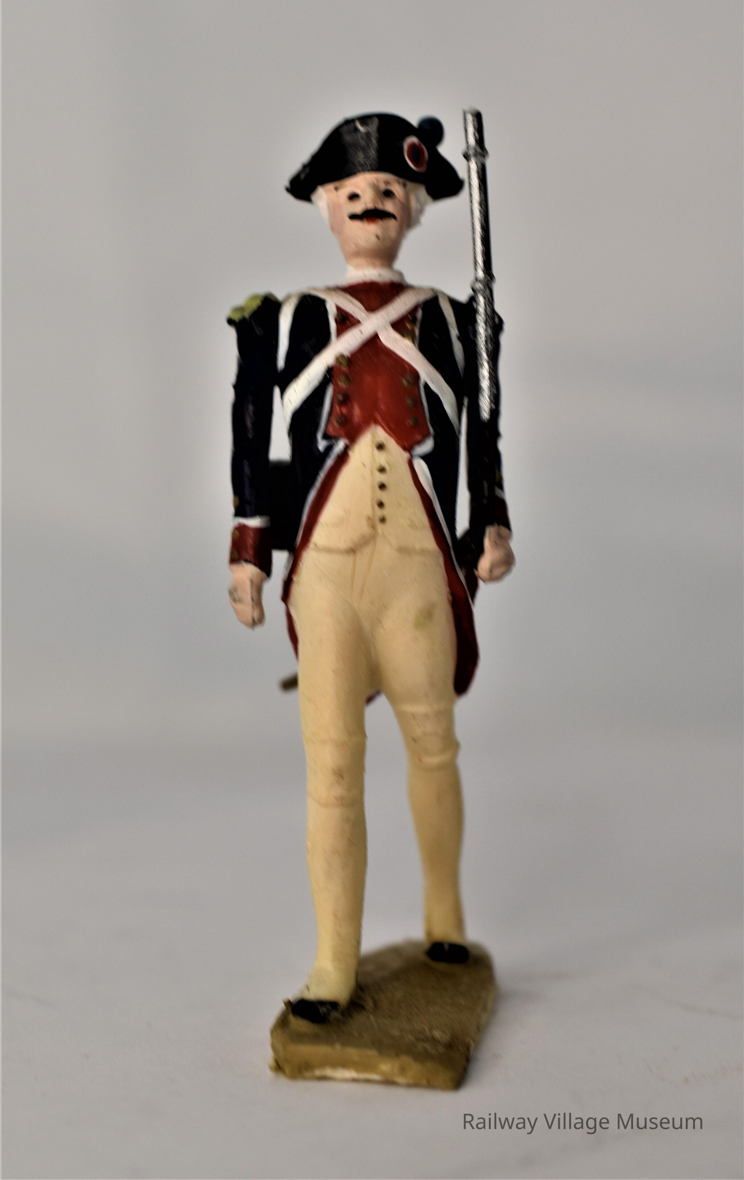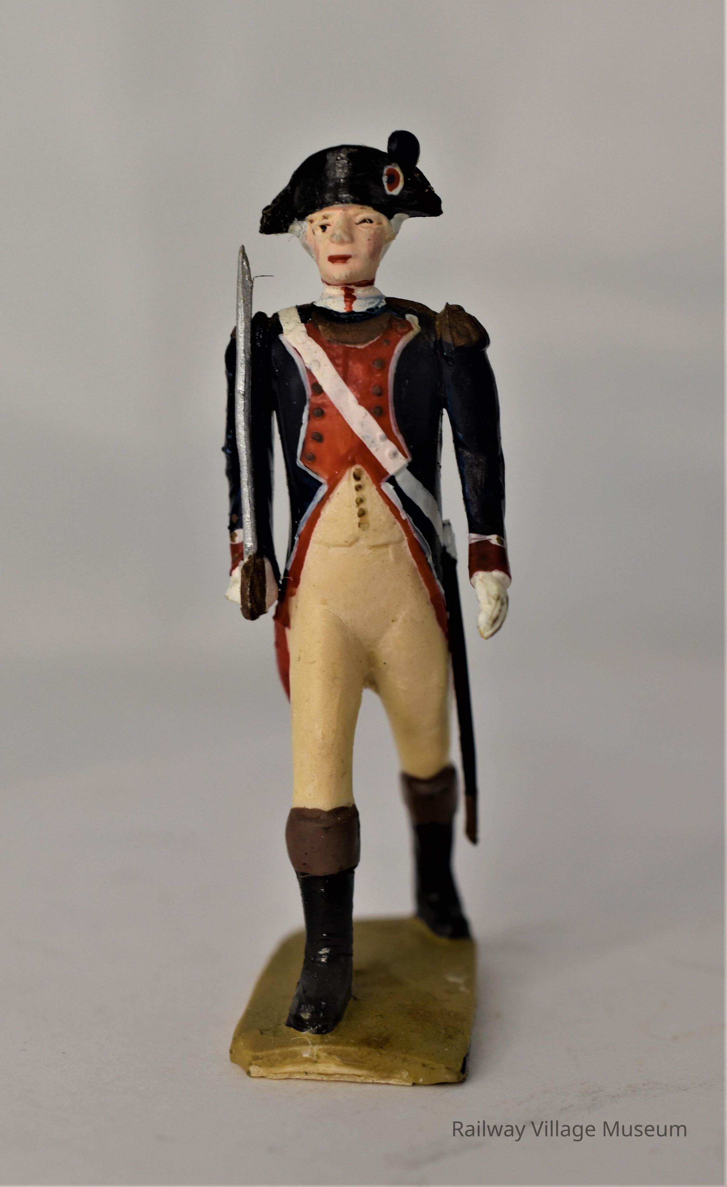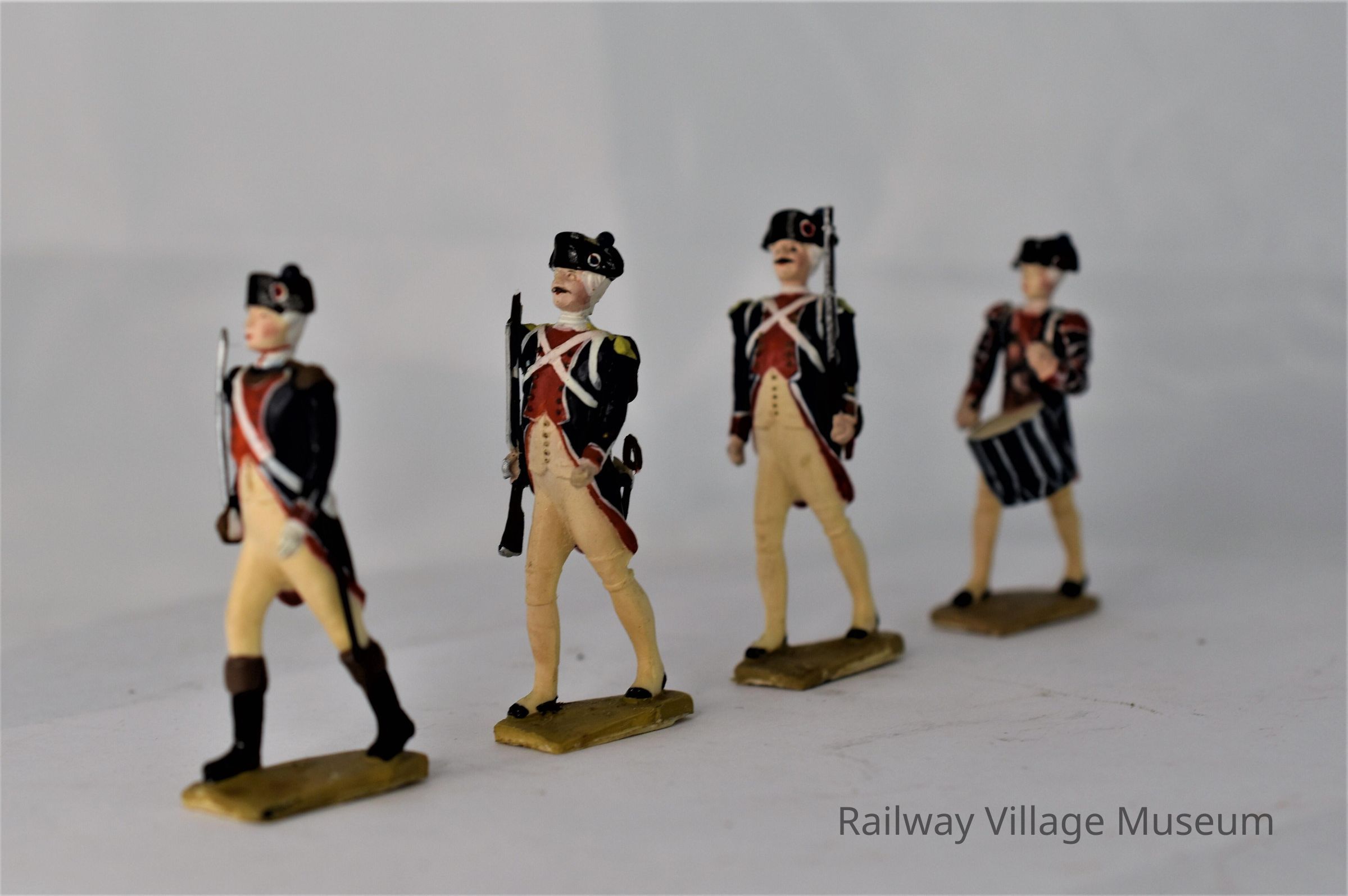 A set of four plastic toy soldiers, manufacturer unknown. They are dressed in red and navy coats, and white pants. One carries a sword, two carry a gun, and the fourth carries a drum.Lexicon
