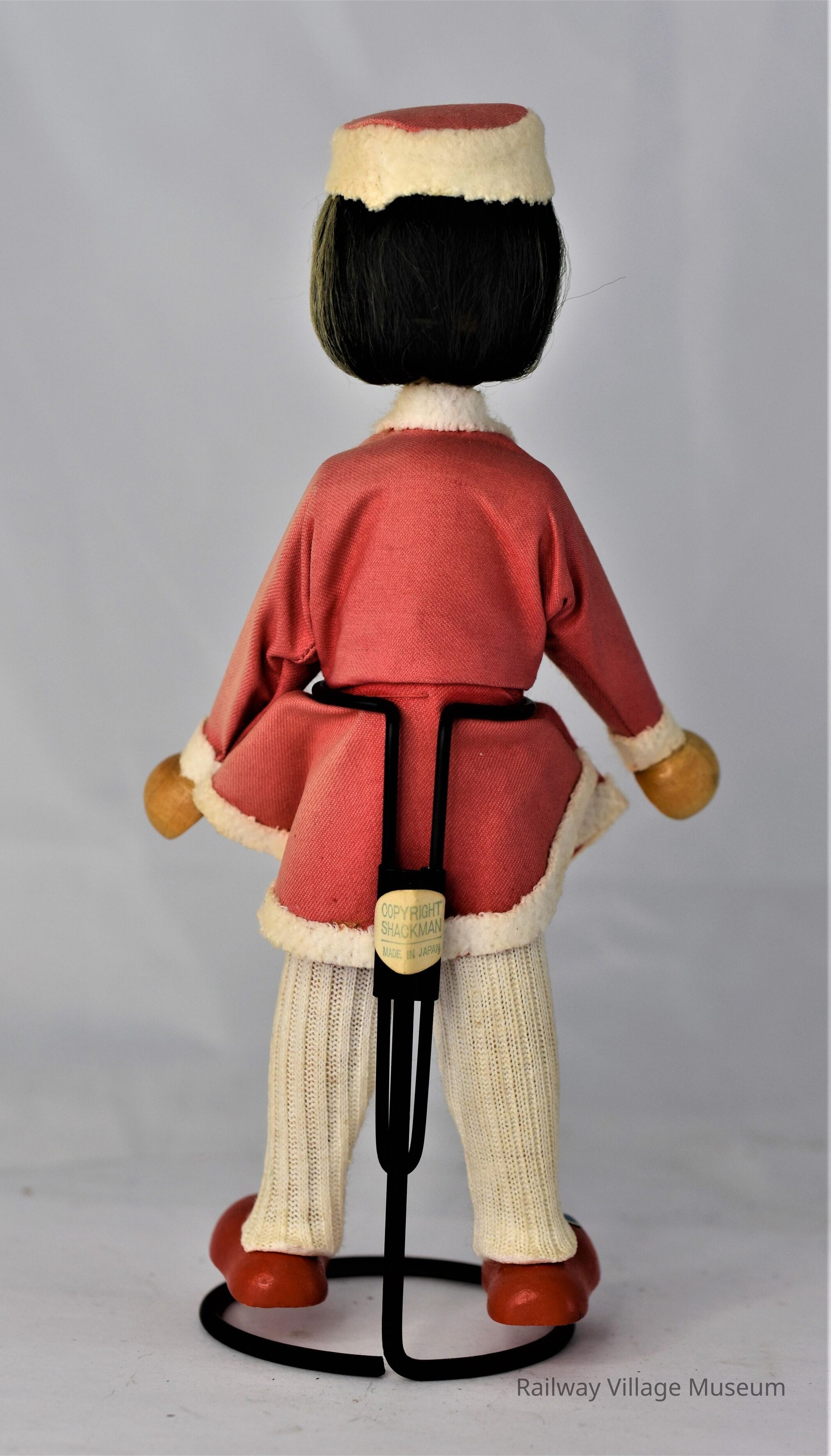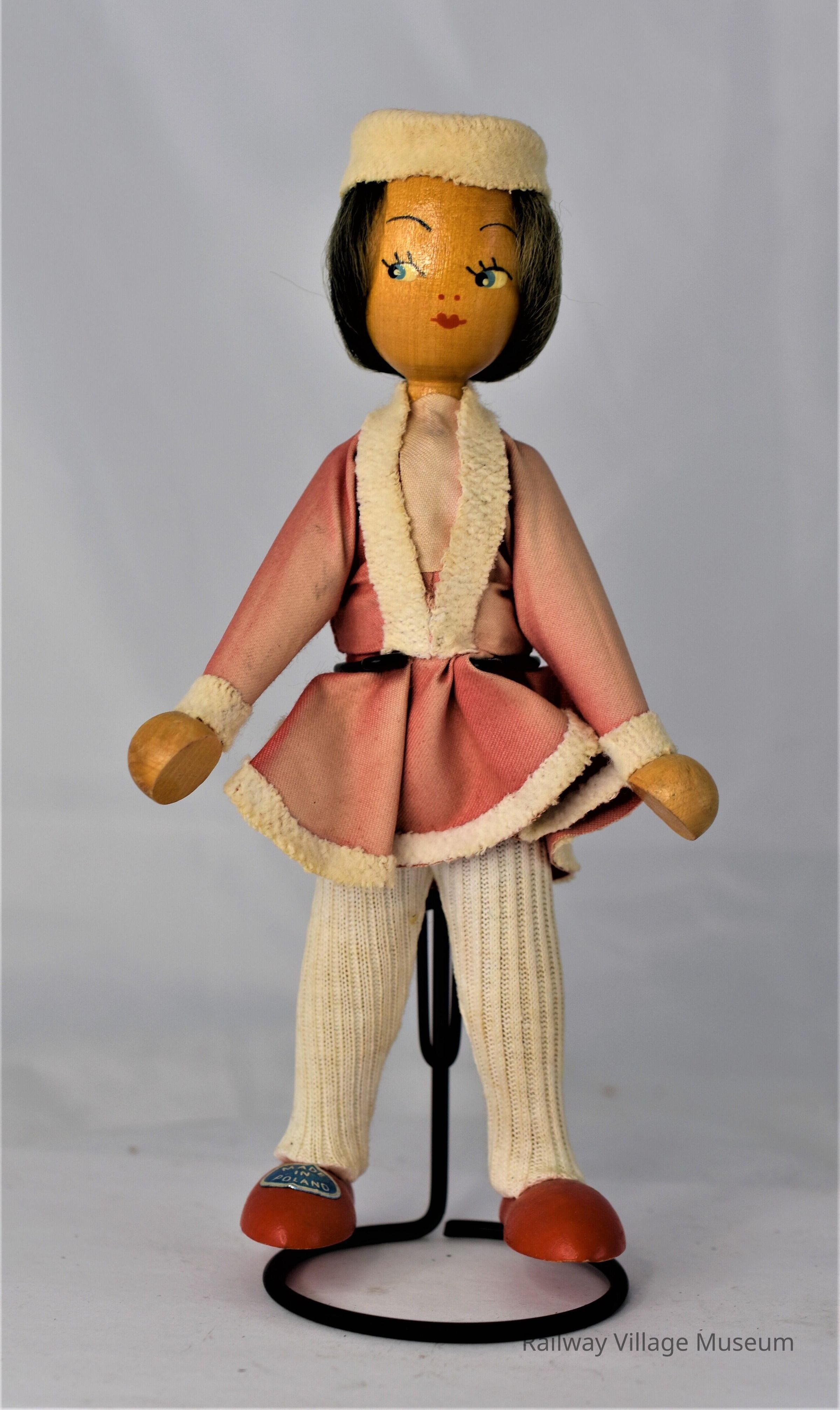 A wooden doll, with a "Made in Poland" sticker on its foot. It's wearing a red jacket with "fur" lining, and white pants. It's hat matches the jacket.Lexicon