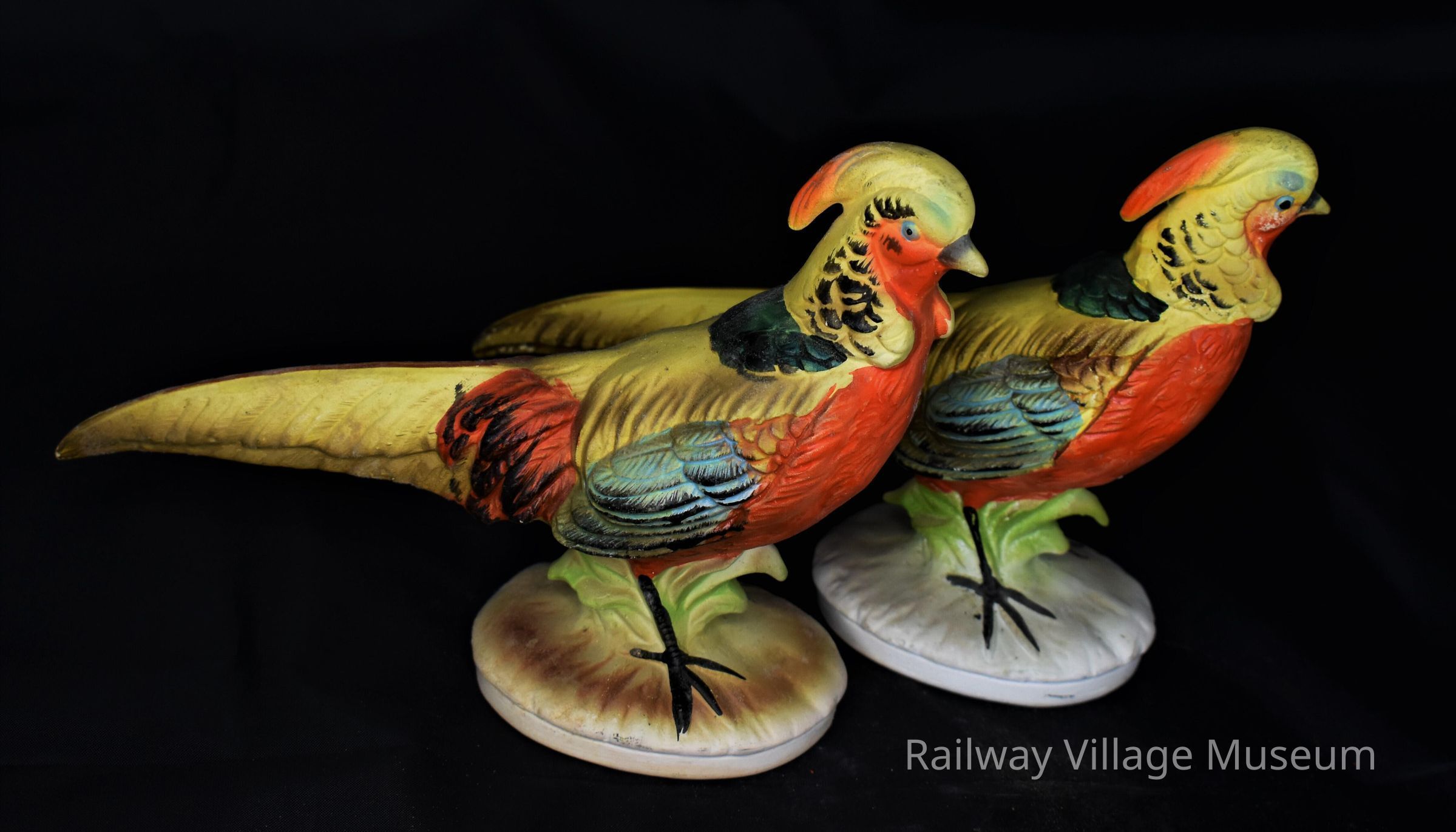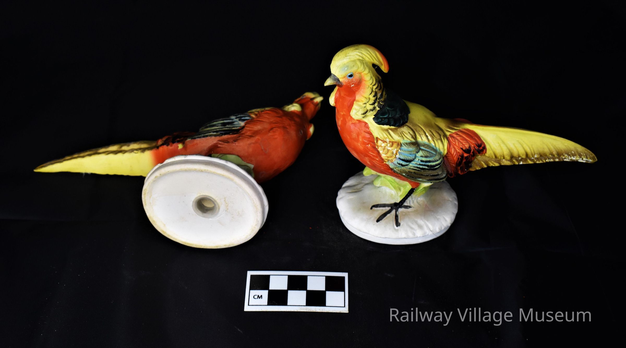 These colorful birds were made out of a plaster material and then hand-painted. They are unmarked but both have plastic stoppers intact.