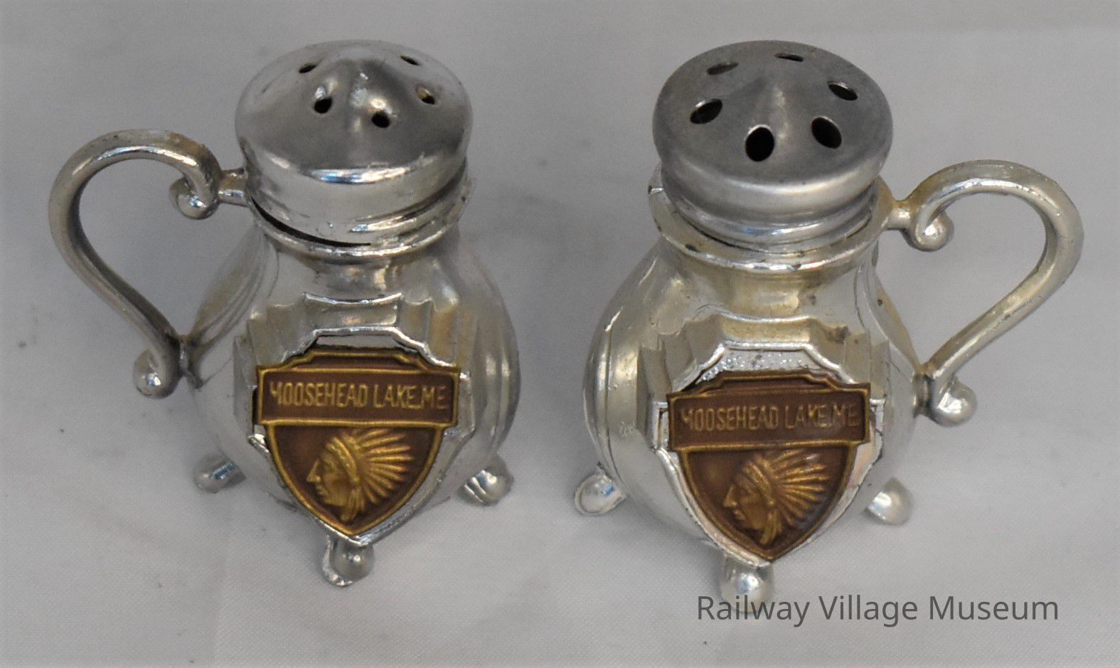 Vintage silverplate teapots Moosehead Lake souvenir salt and pepper shakers made in Japan. Copper Native American Chief emblem on front.