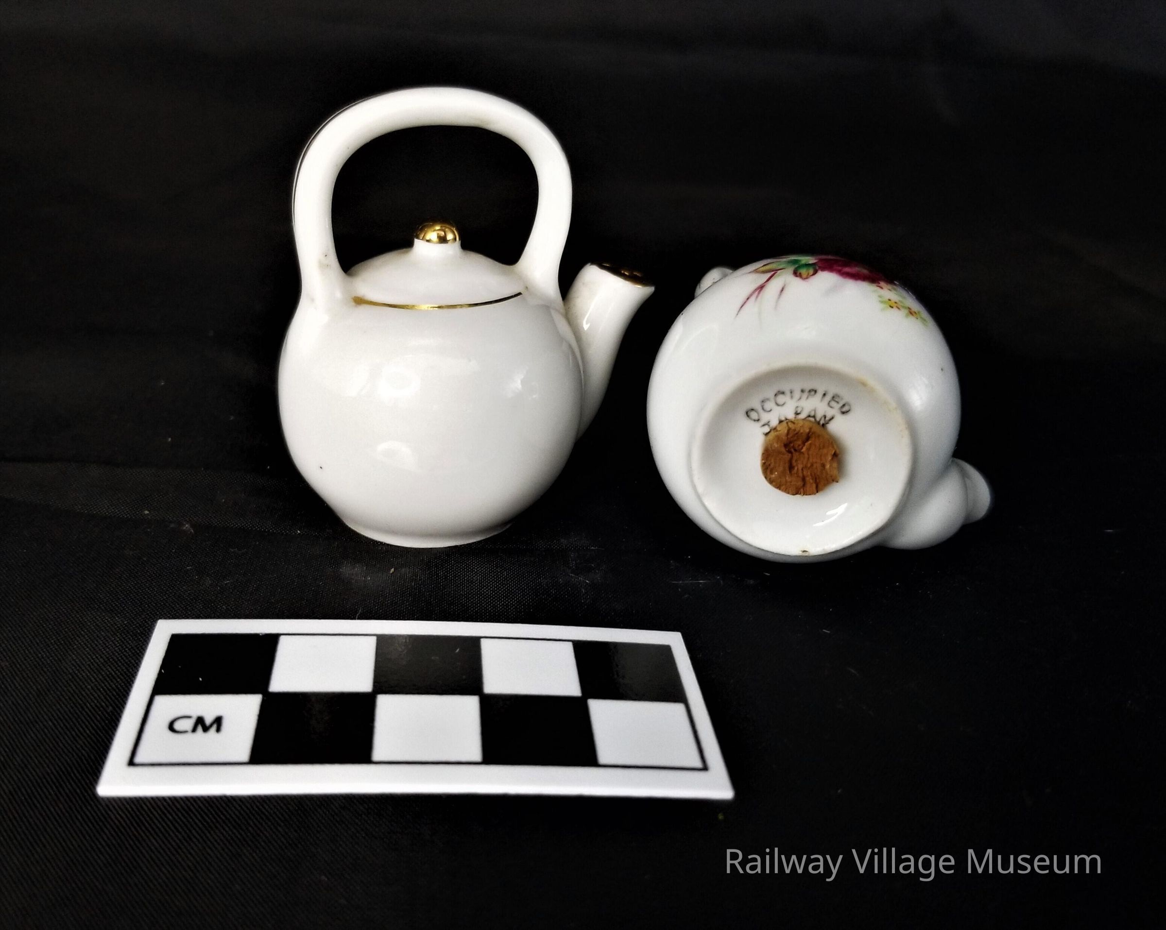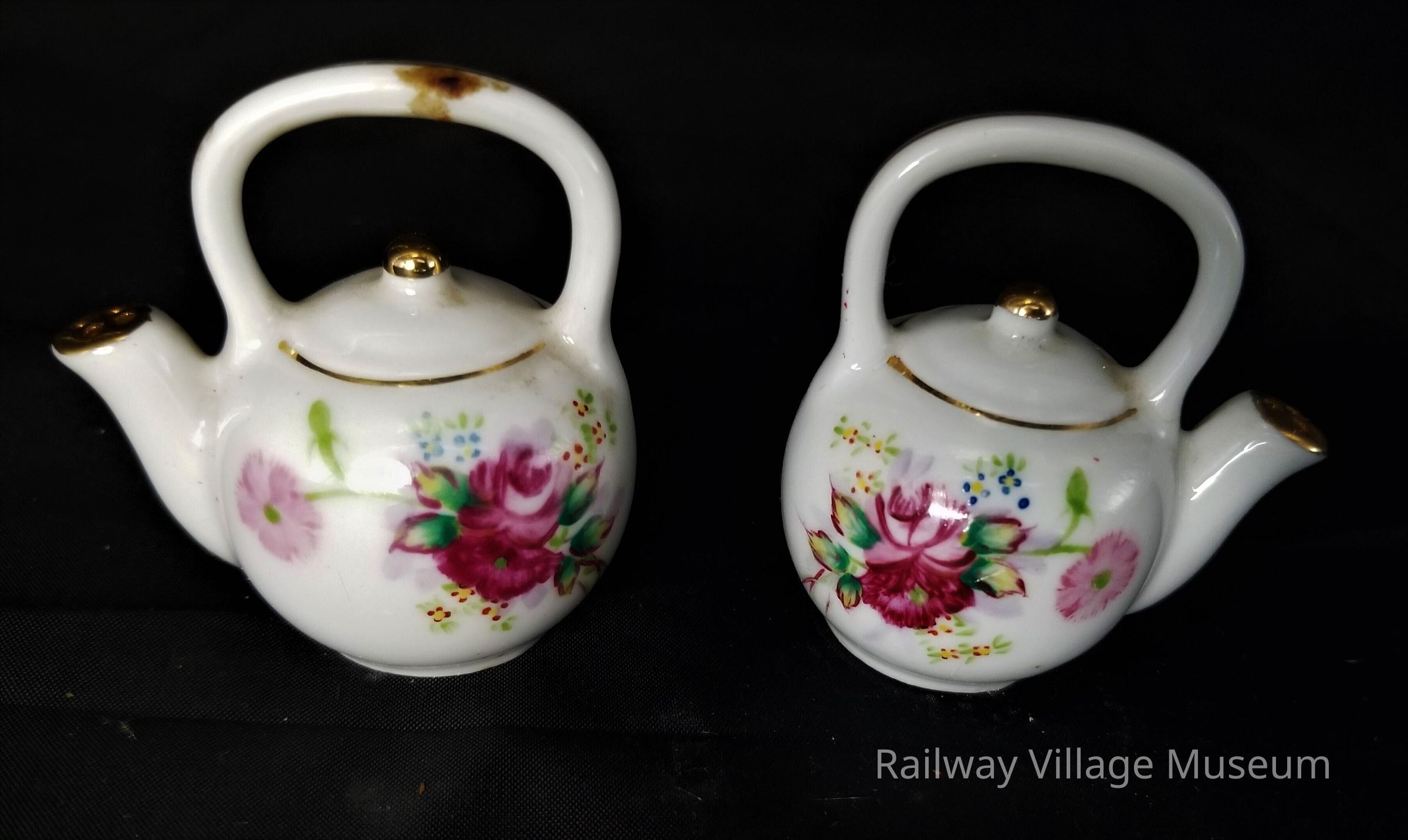 Ceramic teapot shakers with mirrored hand-painted floral motifs. Made in occupied Japan.