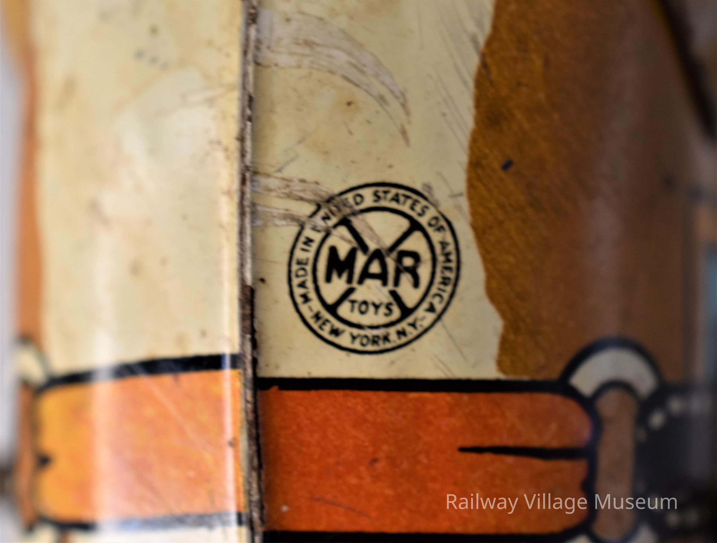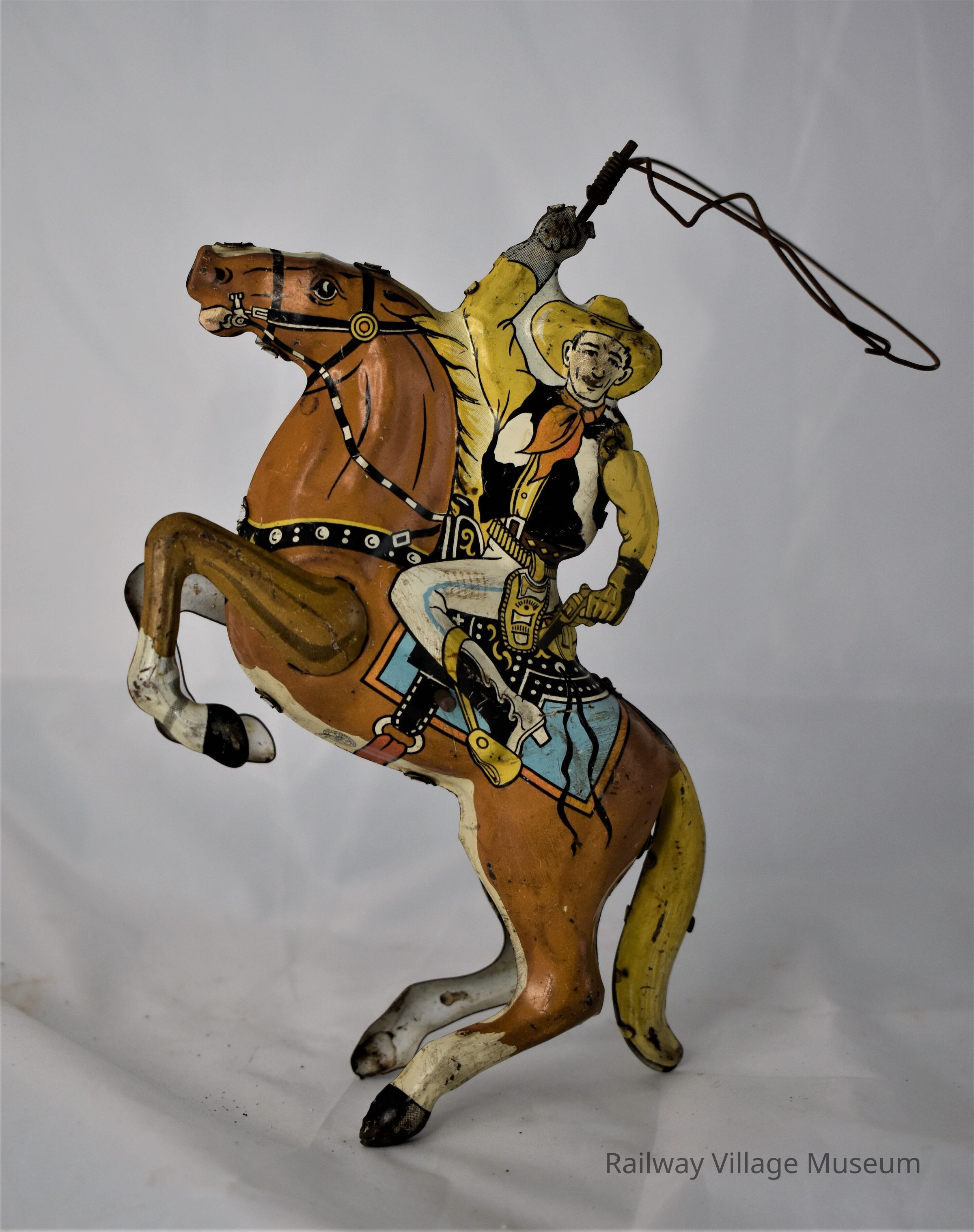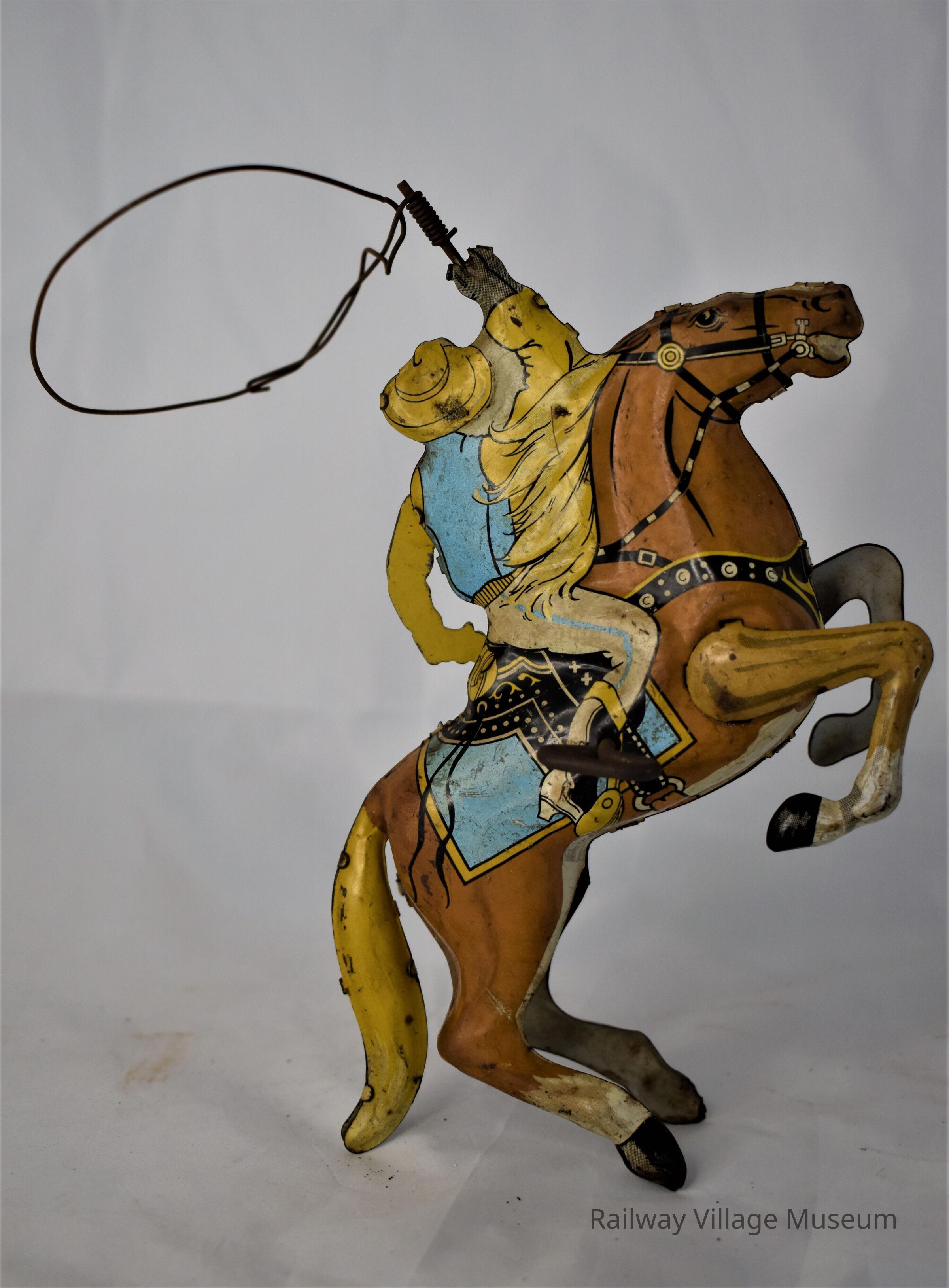 A lithograph tin cowboy, with a windup lasso. This toy still works. The key is located on the side, and when someone winds it up, the lasso starts to twirl. This action does shake the entire toy.Made/Created