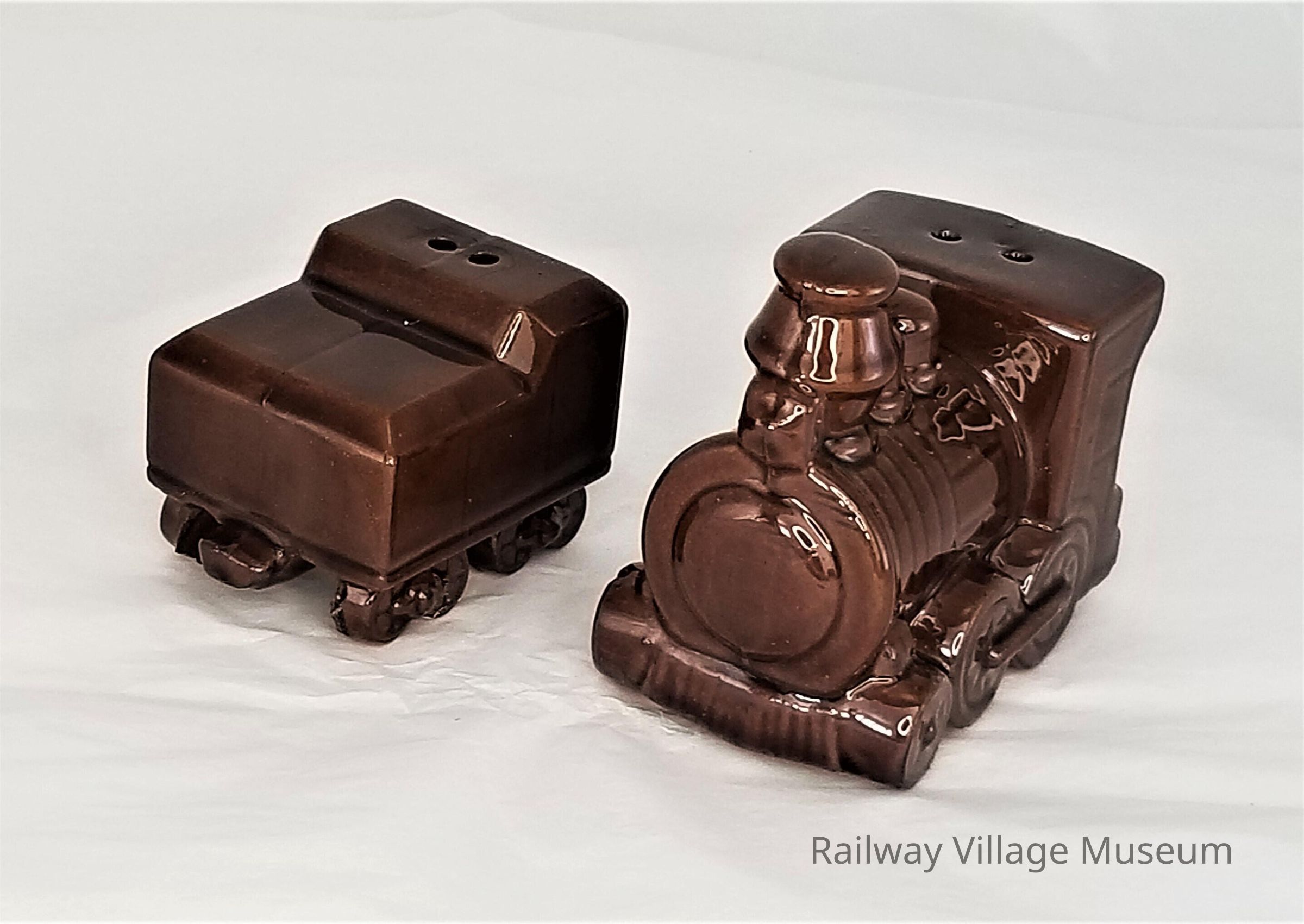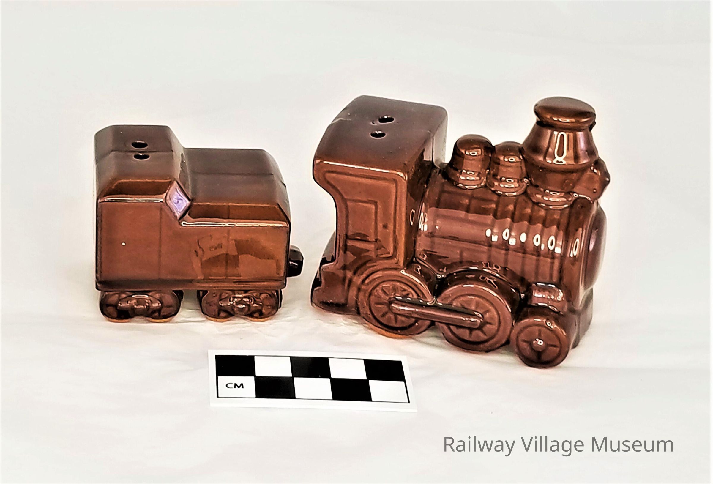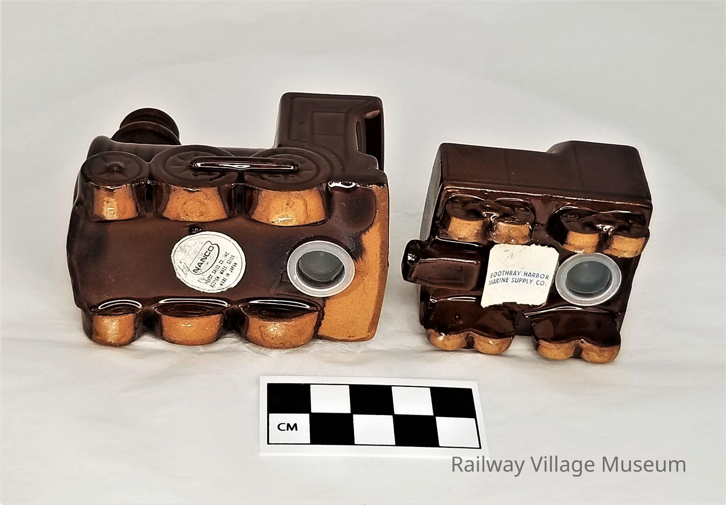 Salt and pepper shakers in the form of a train steam engine and accompanying coal car (or tender). Sticker on the base of engine says, "By NANCO --Sales Co., INC. Boston Mass. 02129 Made in Japan". Sticker on base of coal car says, "Boothbay Harbor Marine Supply Co."