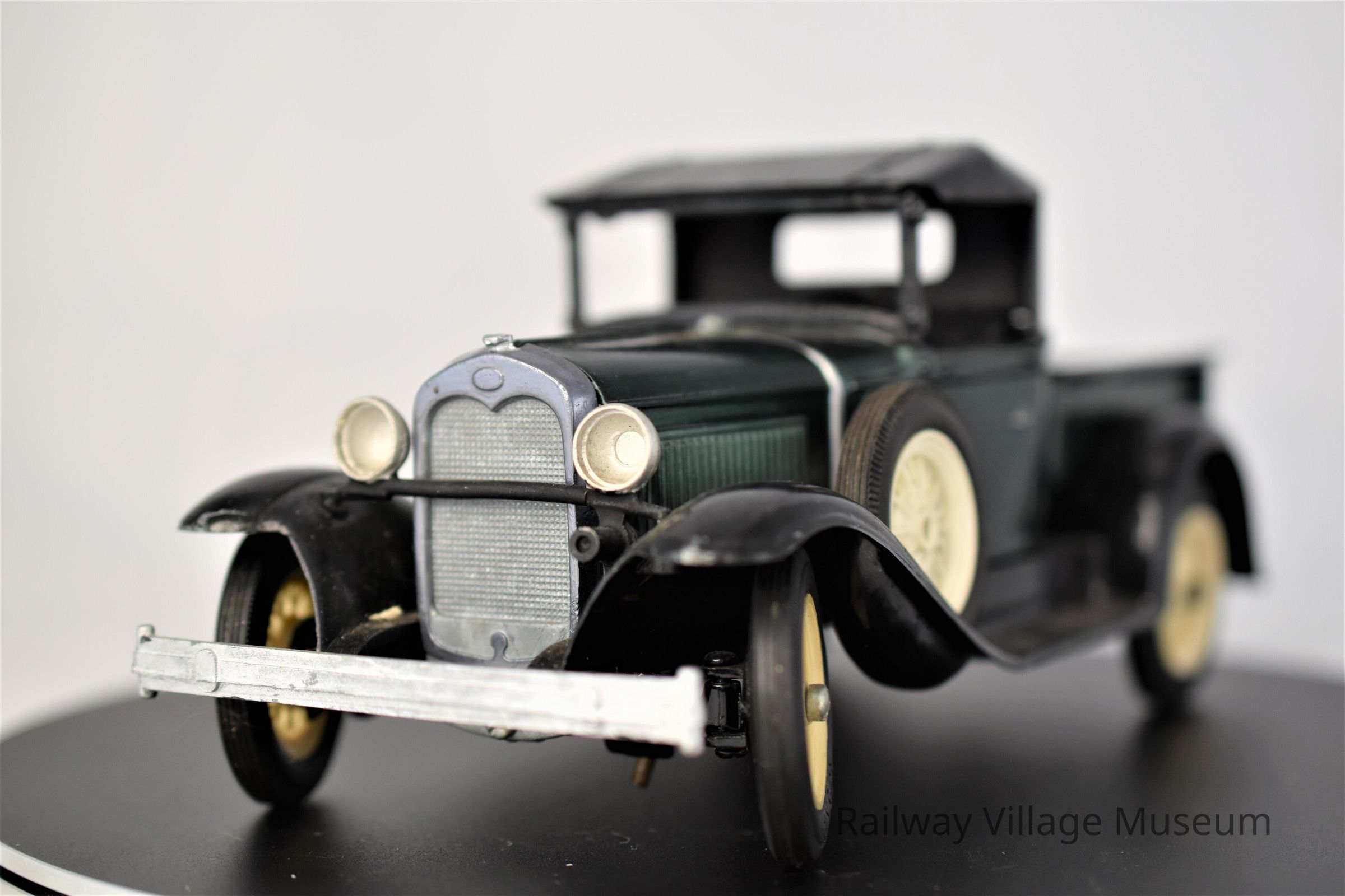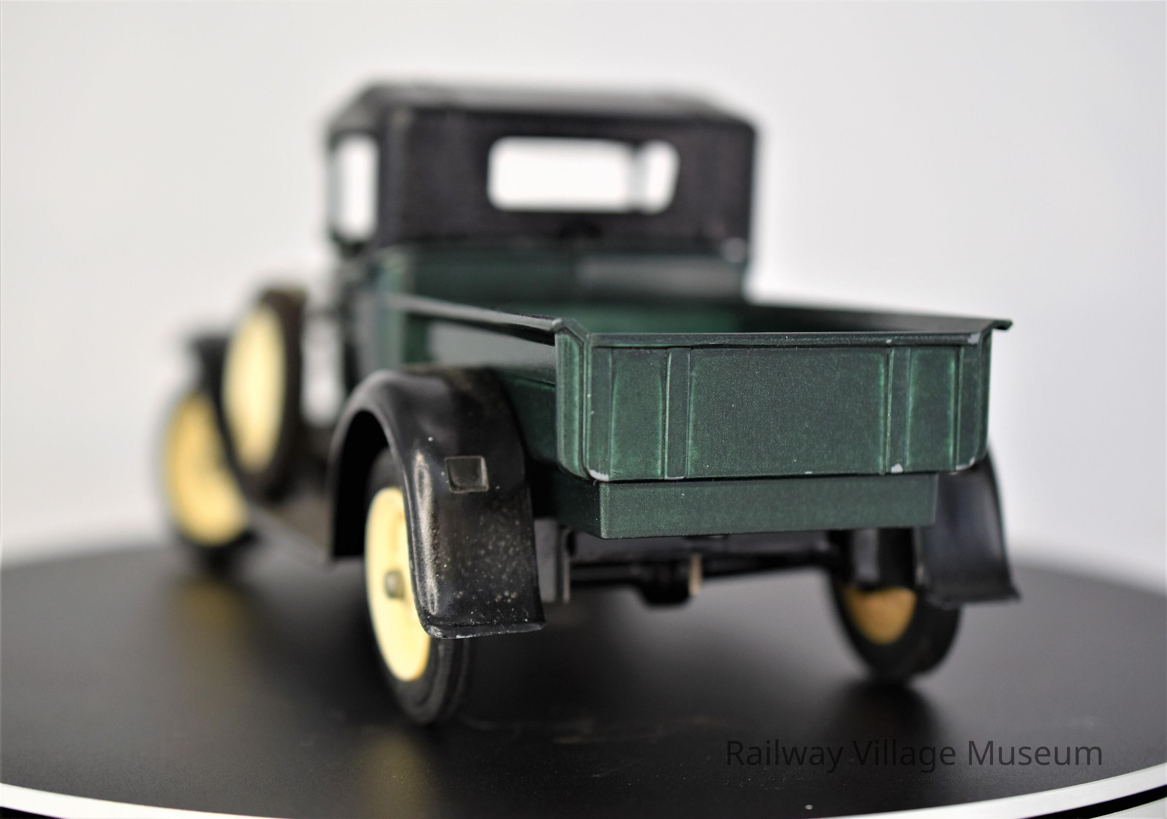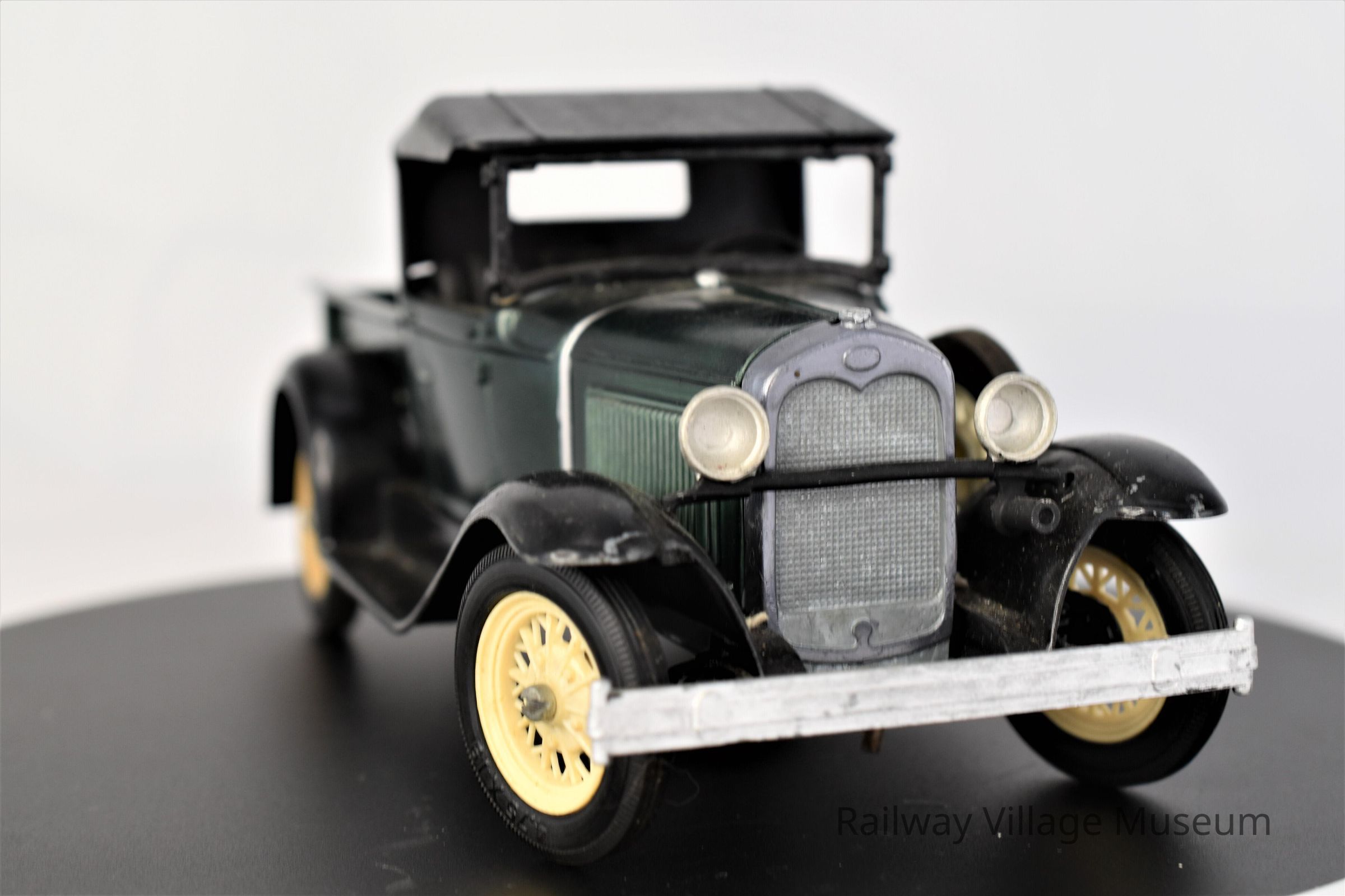 A dark green Model A Ford pickup truck, crafted from a kit. The tires are white, and the steering wheel turns the front two wheels.
