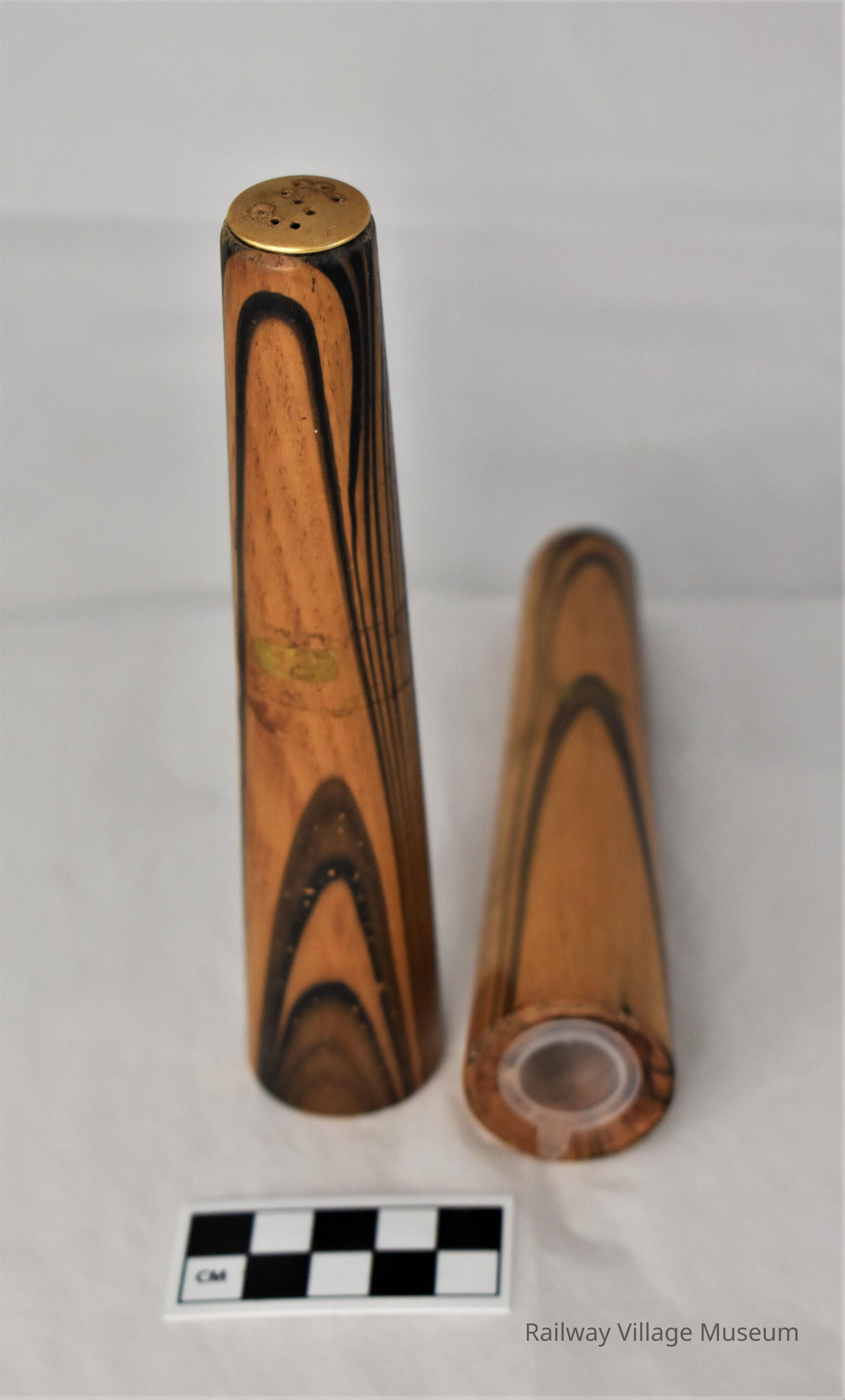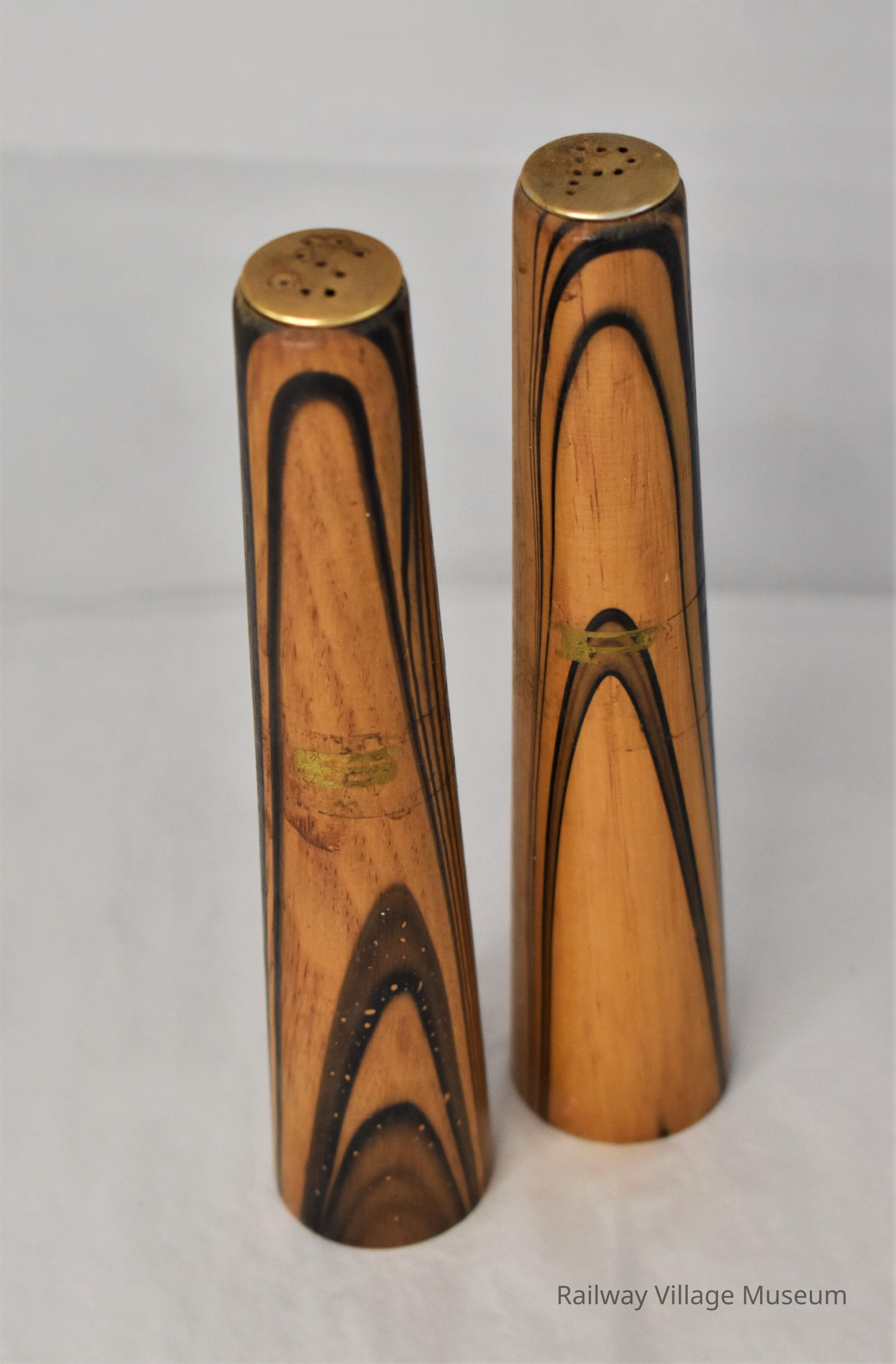 Tall wooden salt and pepper shakers with metal tops and plastic stoppers. The holes in the metal tops create an "S" and a "P".