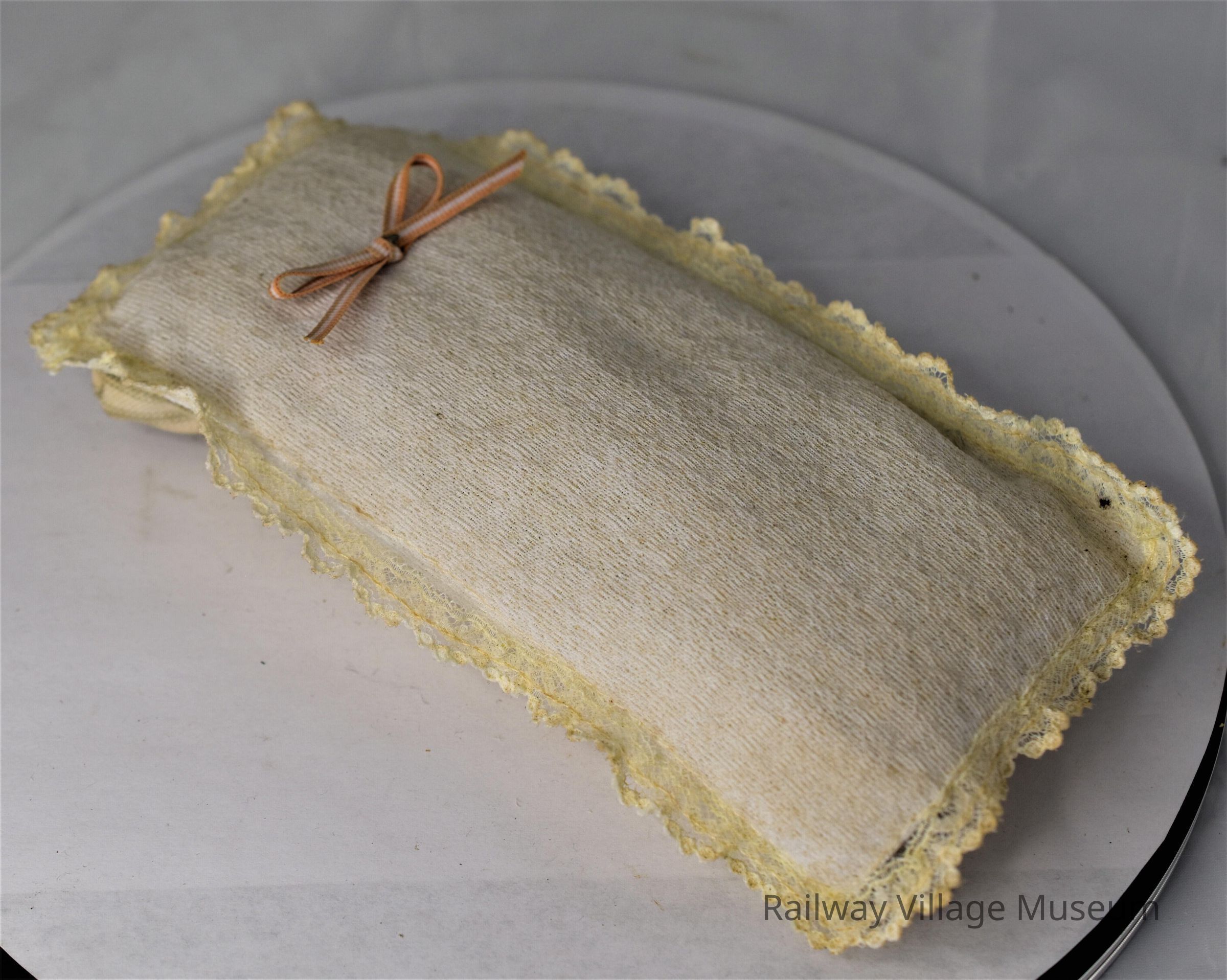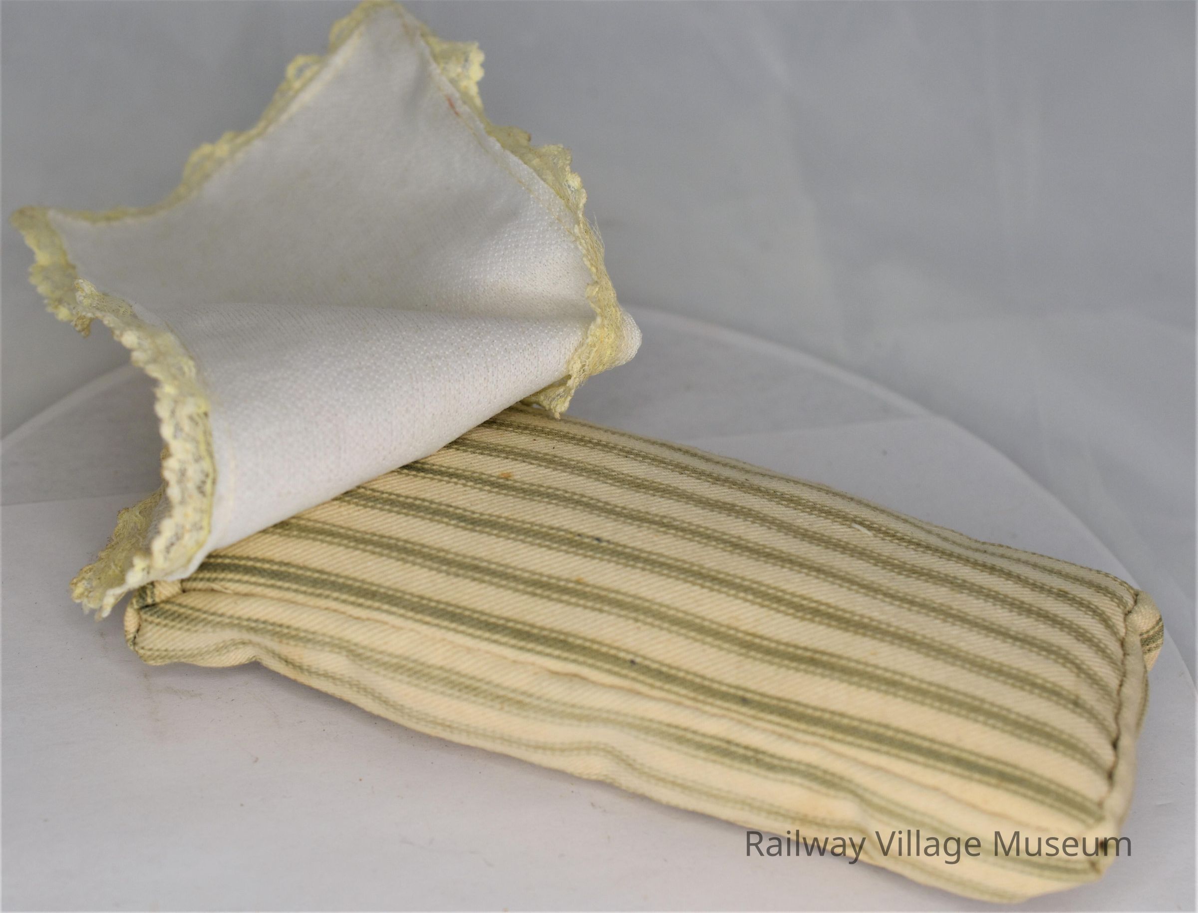 A round post bedframe with a mattress, by an unknown maker. This bed come in two parts, the bedframe and the mattress. The top part of the mattress is sewn onto the mattress. Underneath is a green and white striped mattress, while the top is white with a pink bow and lace around the edges. The bedframe itself is brown.Lexicon