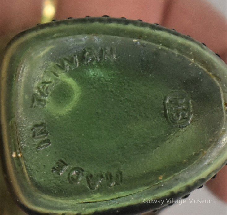 Vintage Fisch's Bitters Koi fish green bottles salt and pepper shakers. Raised letters "Fisch's" on one side and "Bitters" on the other side of each shaker. Each is embossed on the bottom "Made in Taiwan".