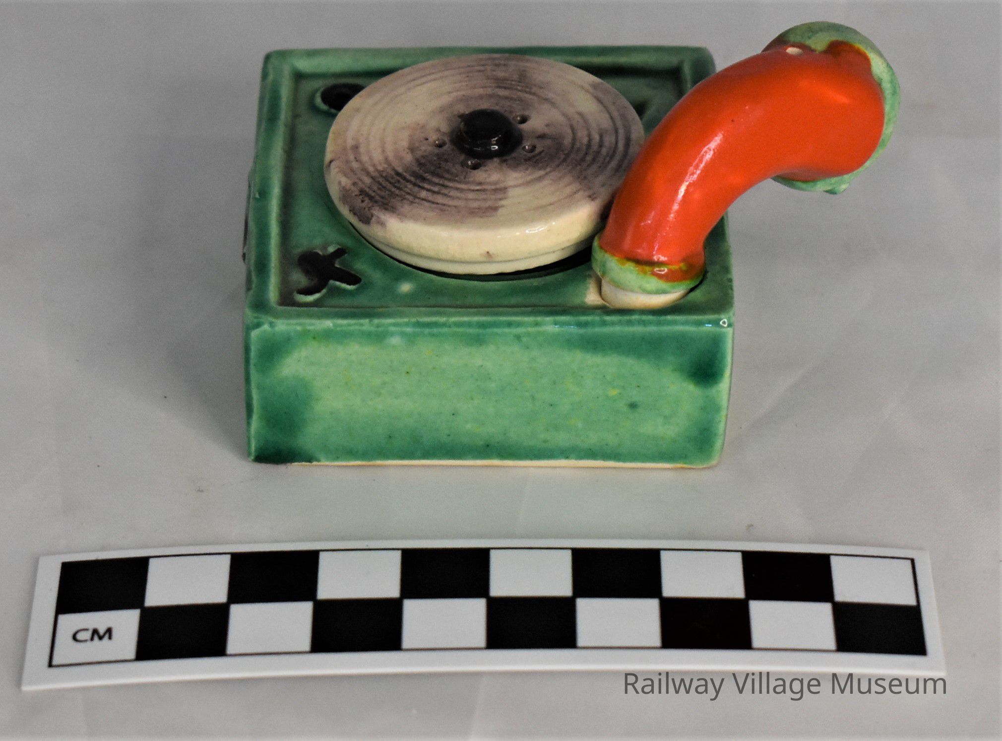 Record player salt and pepper shaker set: needle - 2023.1.205a, record - 2023.1.205b, and turntable - 2023.1.205c