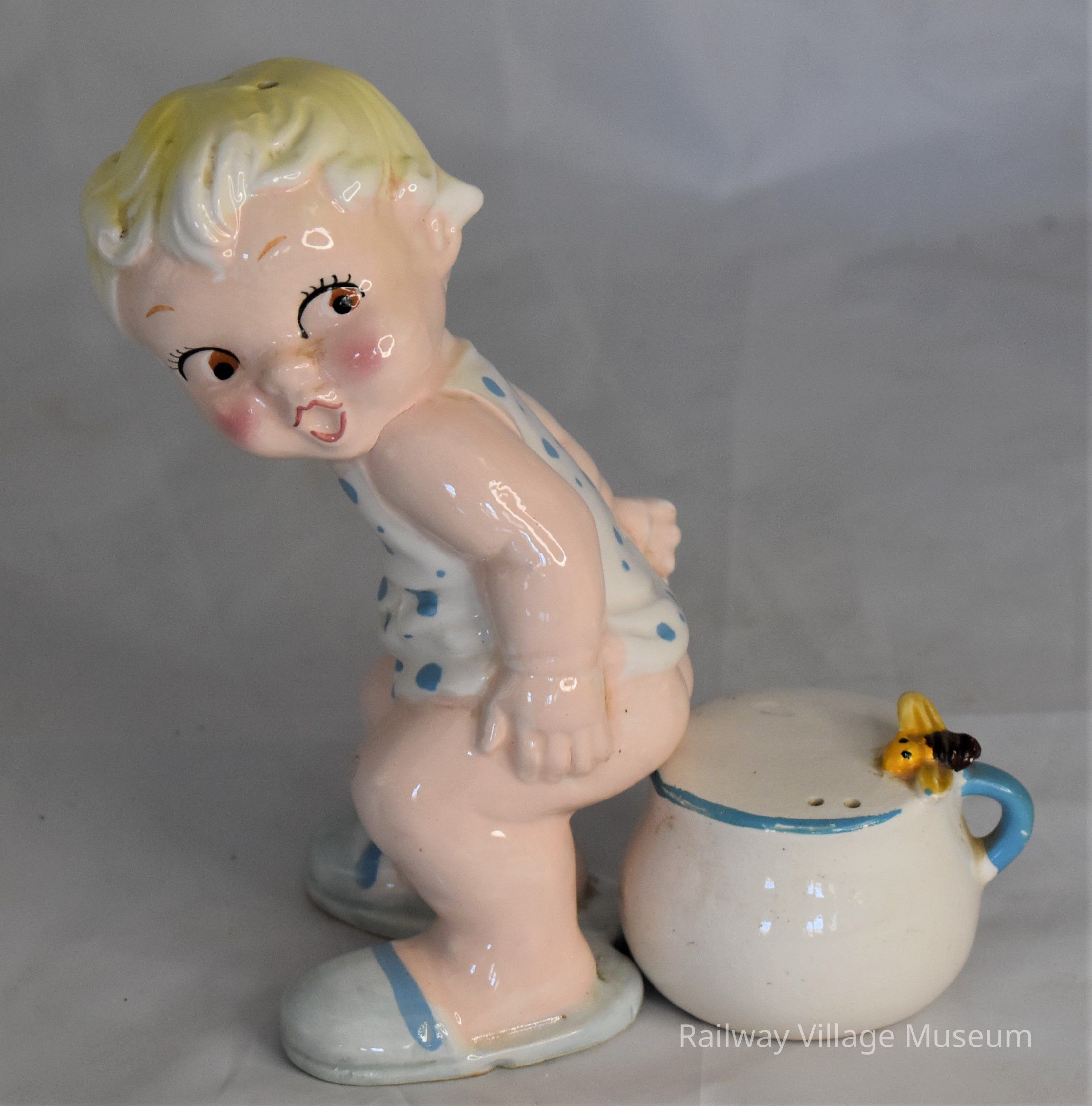 Vintage ceramic child on potty with a bee salt and pepper shakers made in Japan