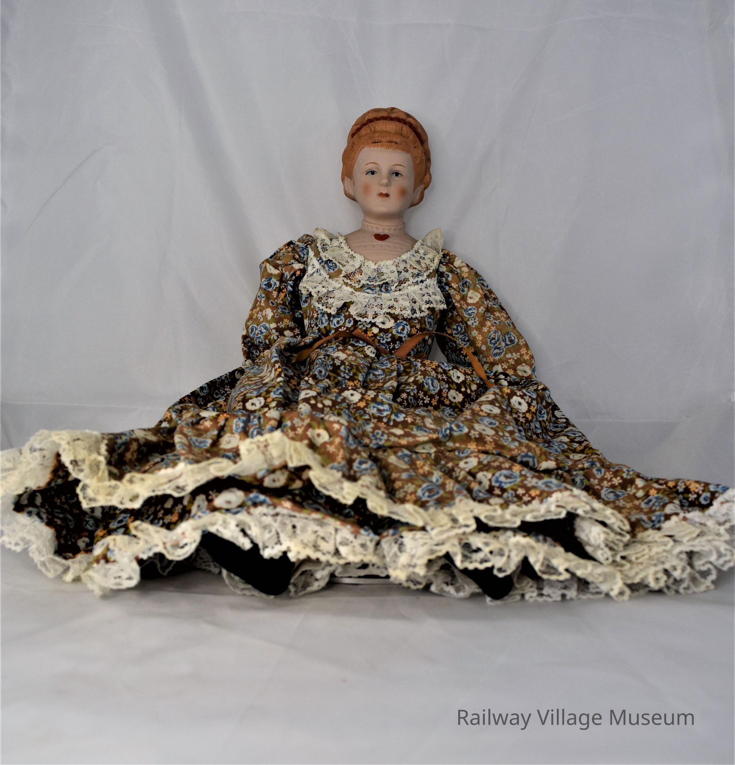 This doll's heads and shoulders are bisque, as well as her hands and feet. The rest of her body is made out of fabric. Part of her shoulders is actually a collar, the same color as her skin, but with a red heart in the center. Her features are all molded and painted on. Her dress is in rough condition, with parts of it faded by UV rays.Lexicon