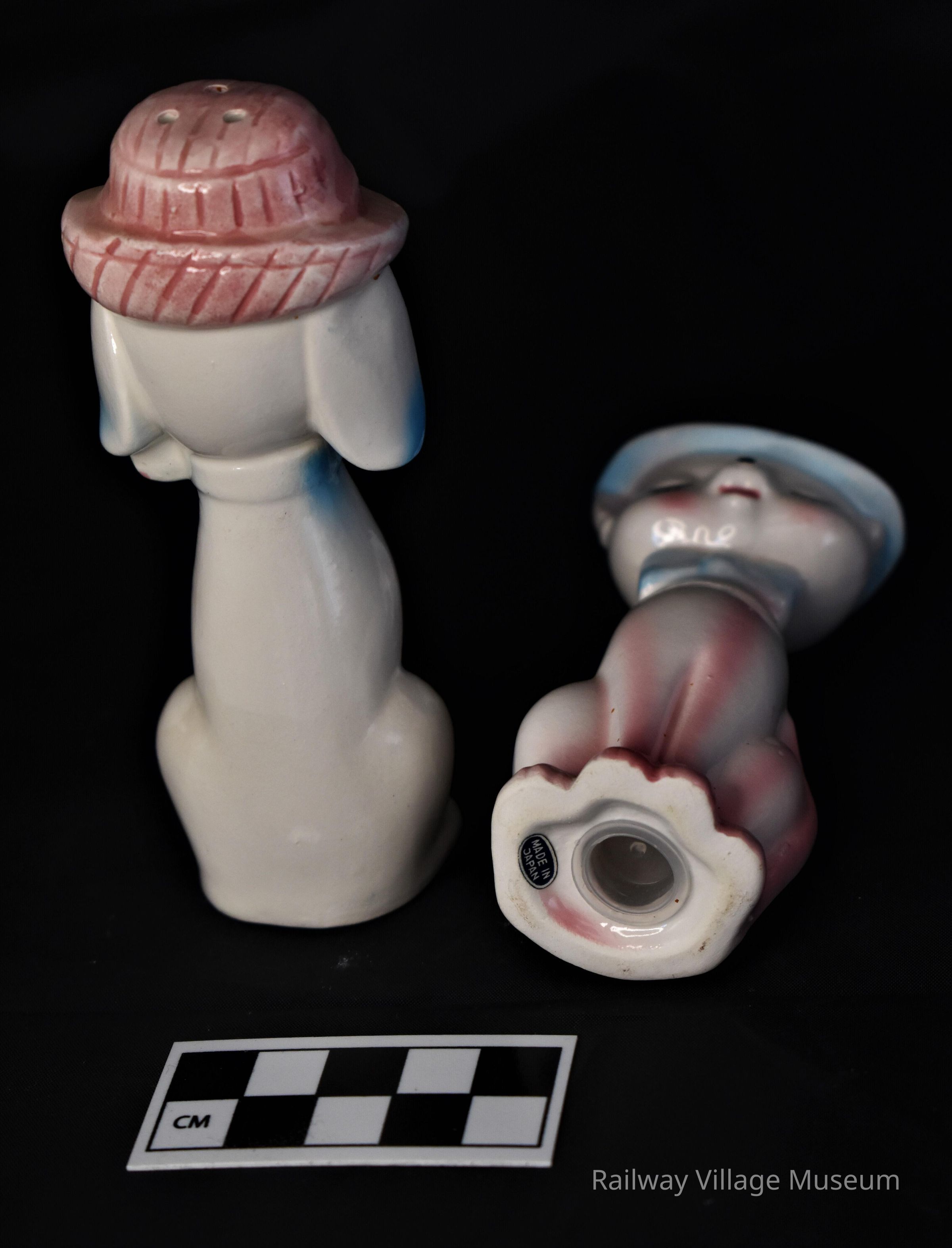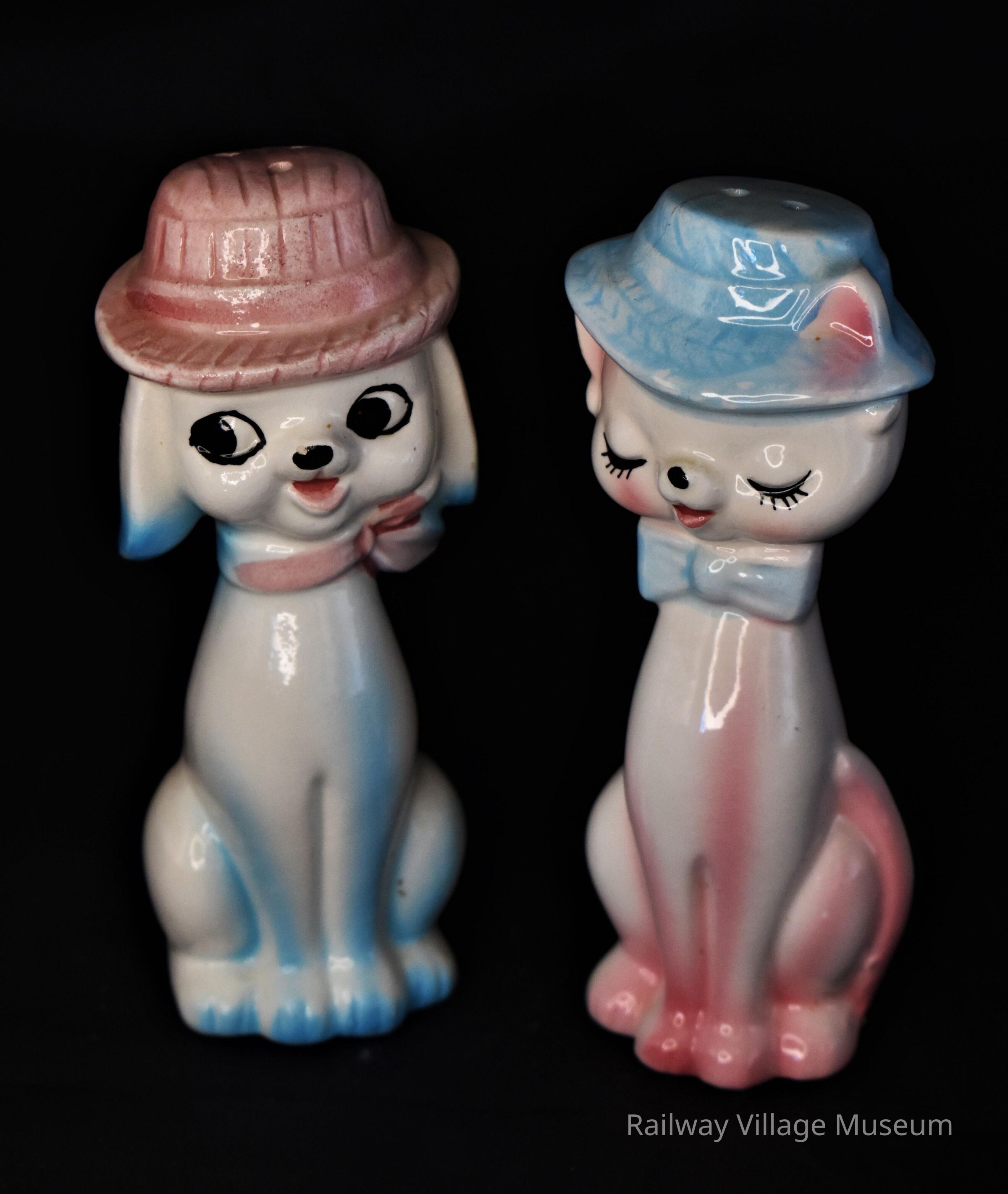 This pair of hand-painted ceramic salt and pepper shakers includes a blue-tinted dog wearing a pink hat and bow around its neck and a pink-tinted cat wearing a blue hat and bowtie. No manufacturer is indicated, however, both have a "made in Japan" sticker on the base. Plastic stoppers both intact.Inscription/Signature/Marks