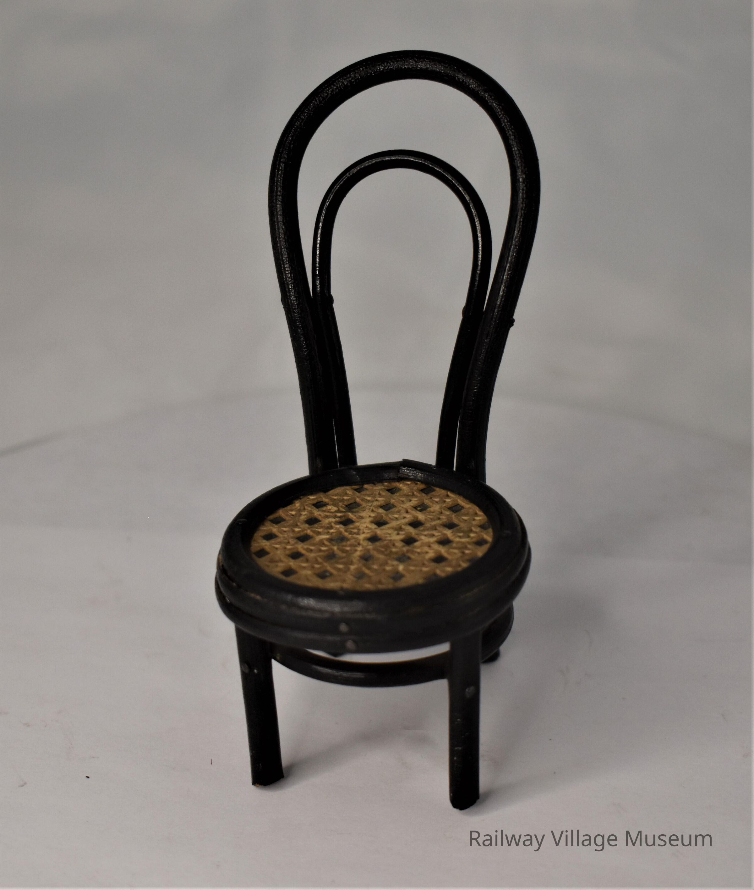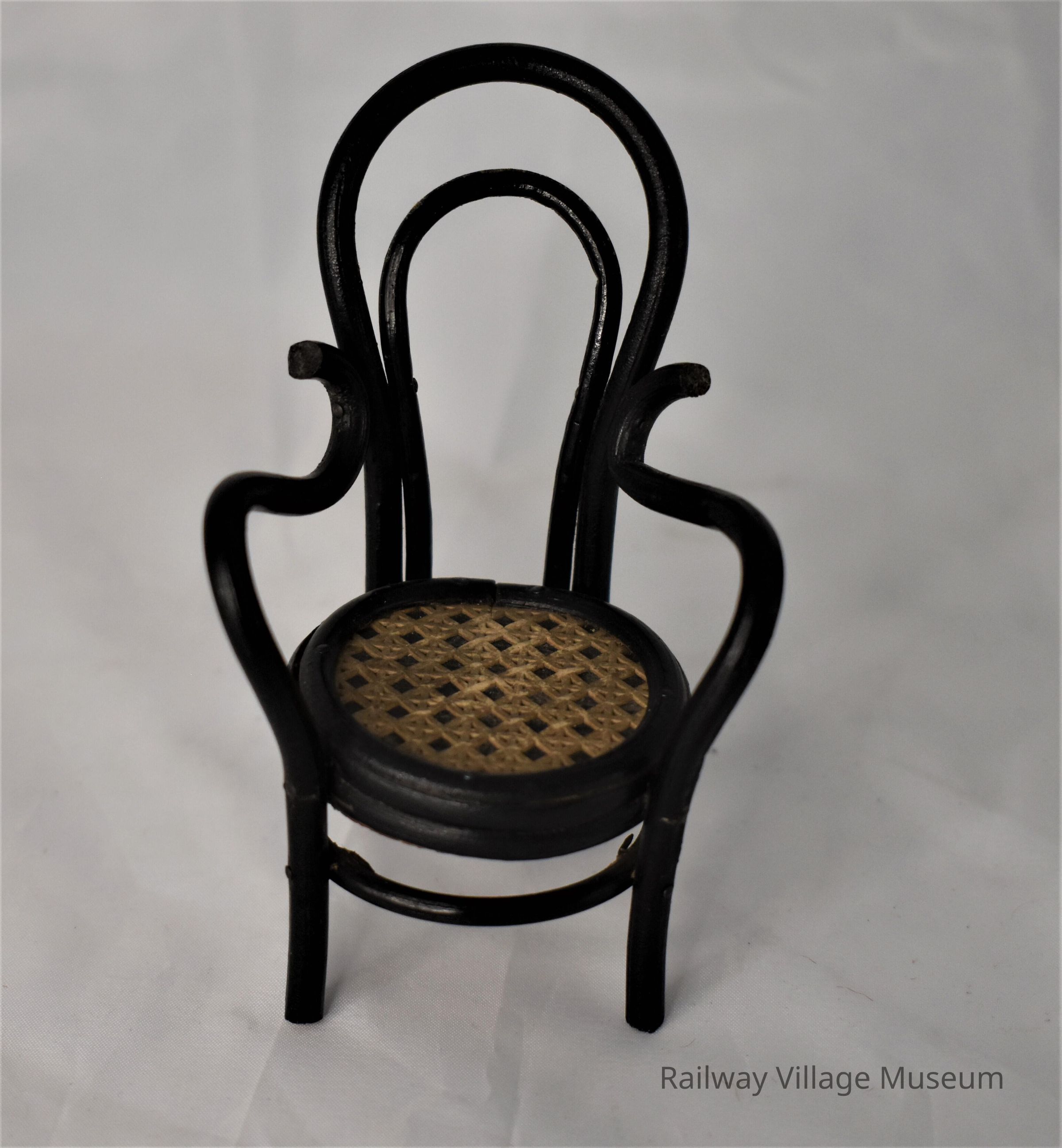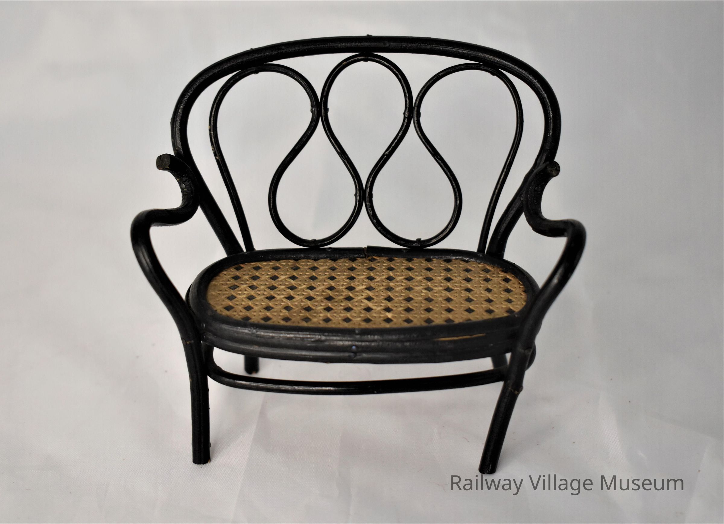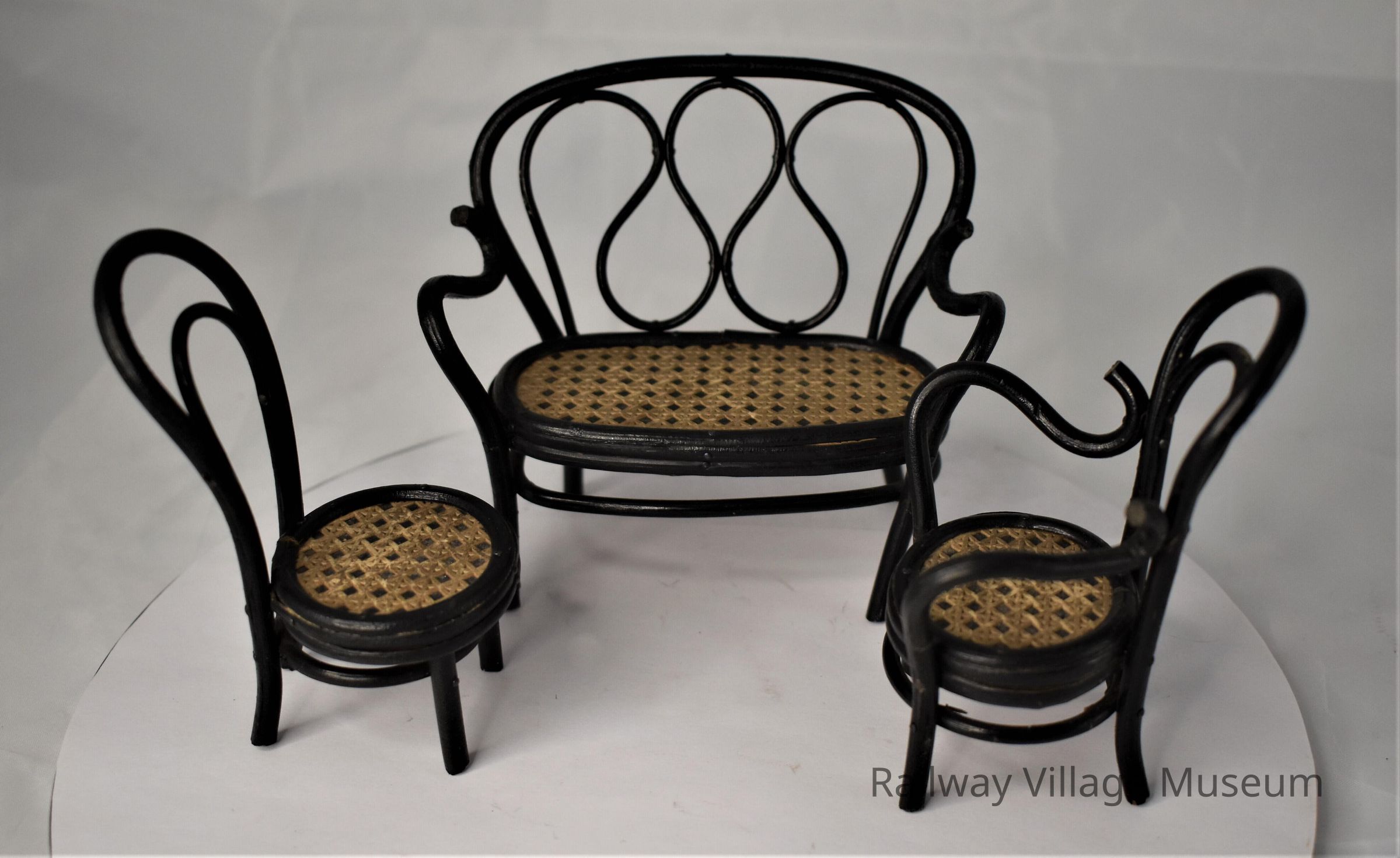 A wicker seated garden set by an unknown maker. Each piece is wooden, and painted black, with the seats of each piece brown. Two of the pieces have arm rests, while the other does not.