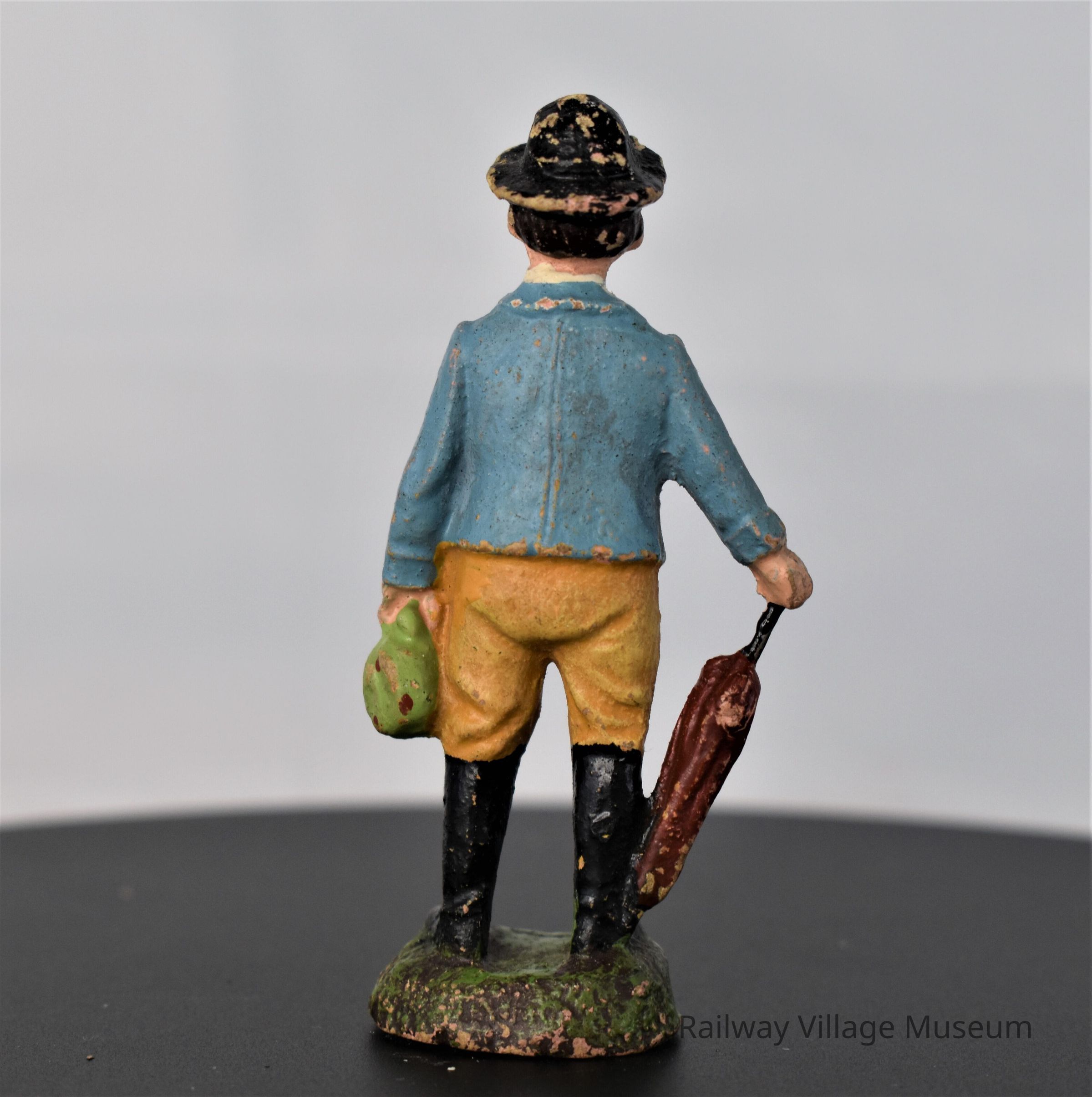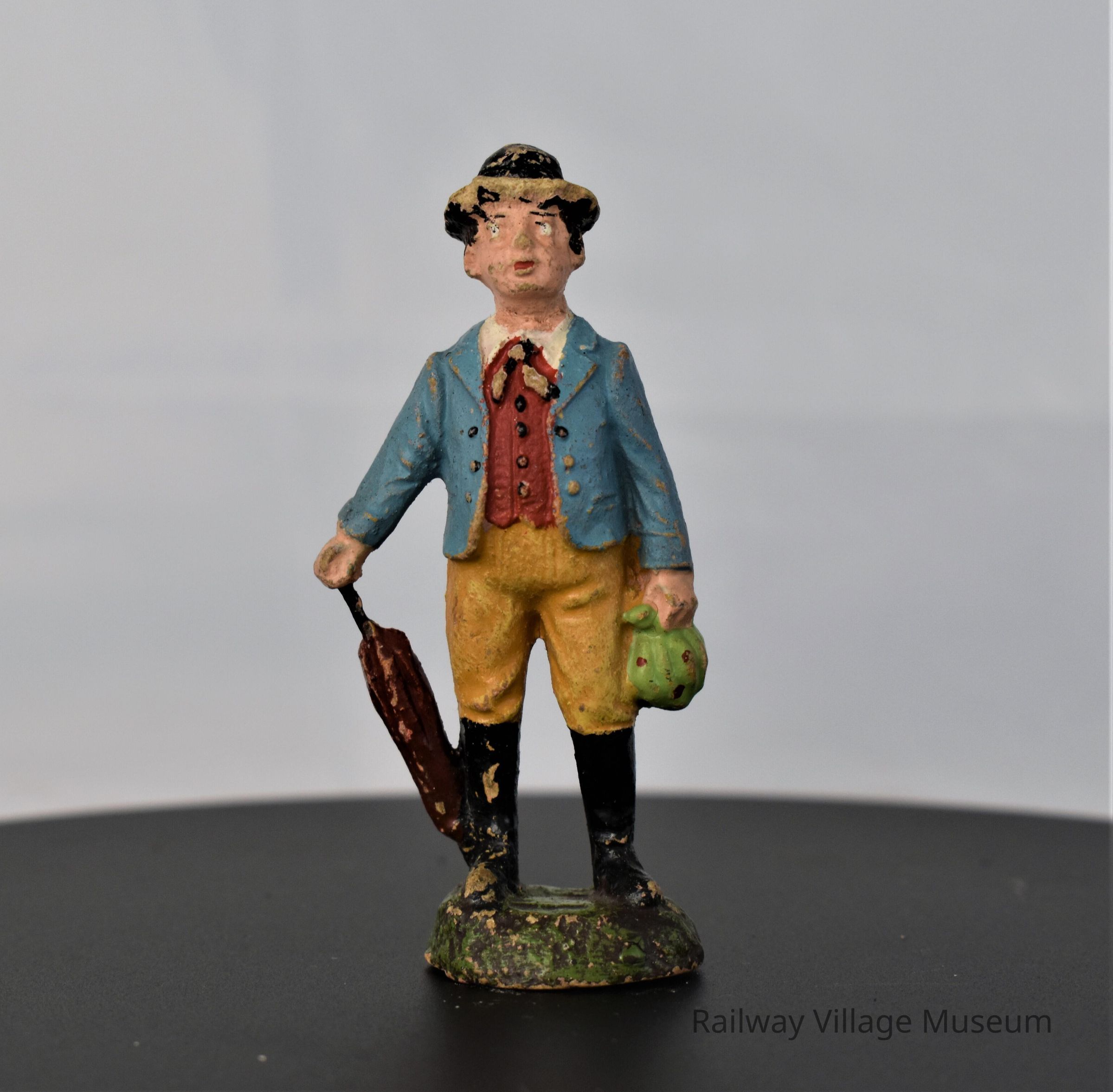 An Elastolin City Boy. He is made of a composite material that is most likely sawdust and glue. He wears a waistcoat, jacket, and trousers, and he holds a little umbrella on his left side.Lexicon