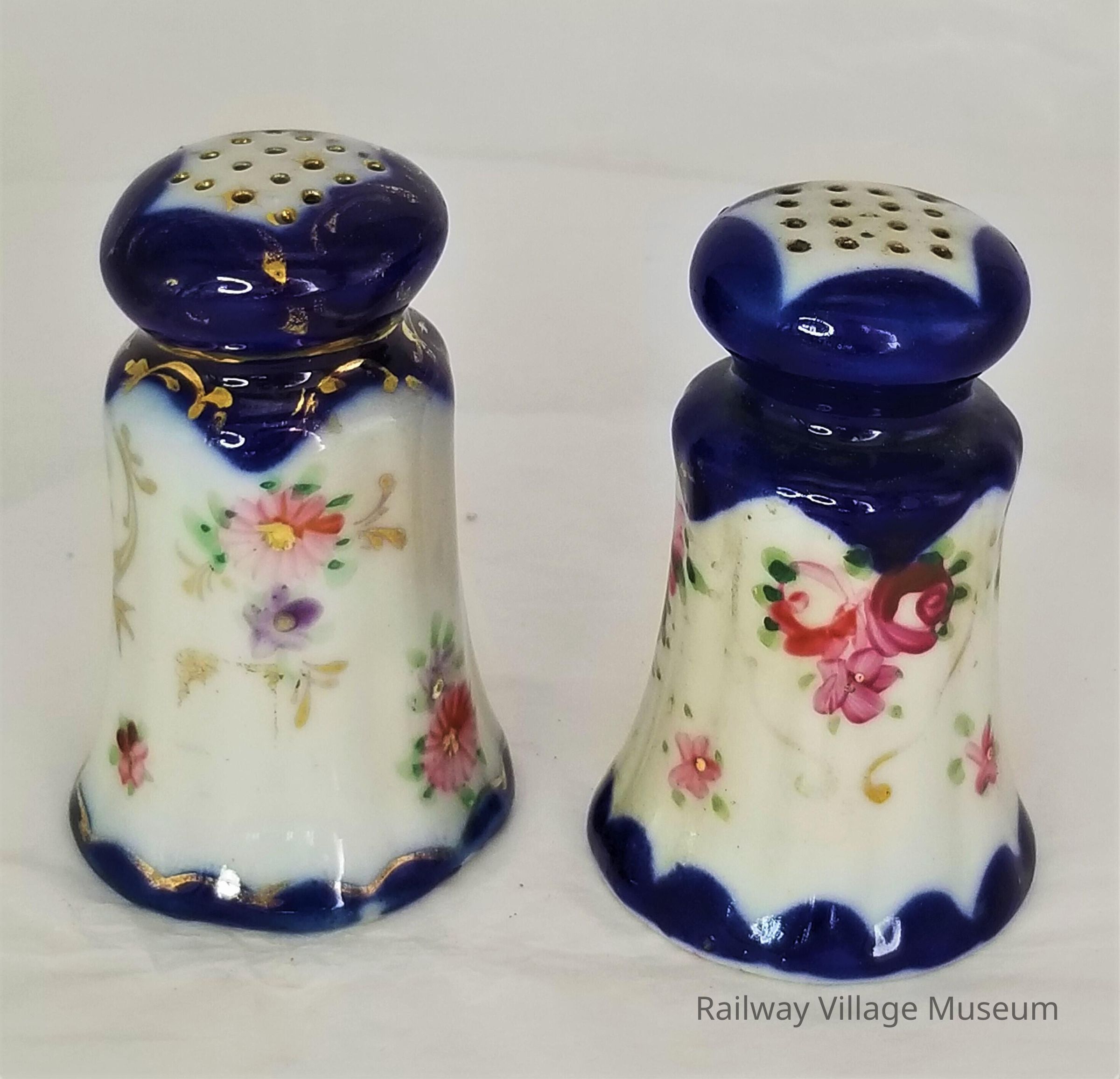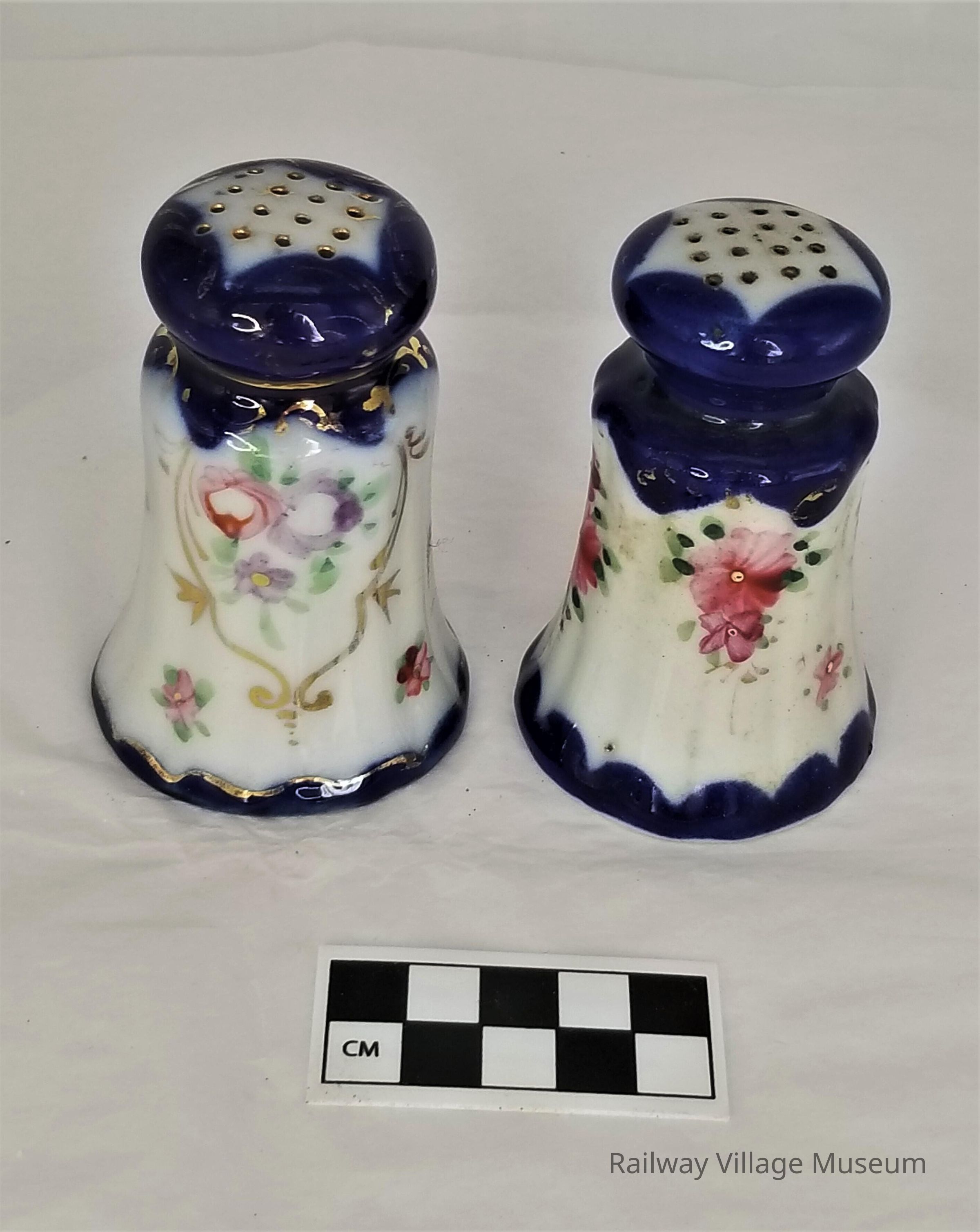 Hand-painted ceramic shakers. Though the floral patterns are similar, they are not matching copies. They are unmarked. One has a crack along the edge of the base.