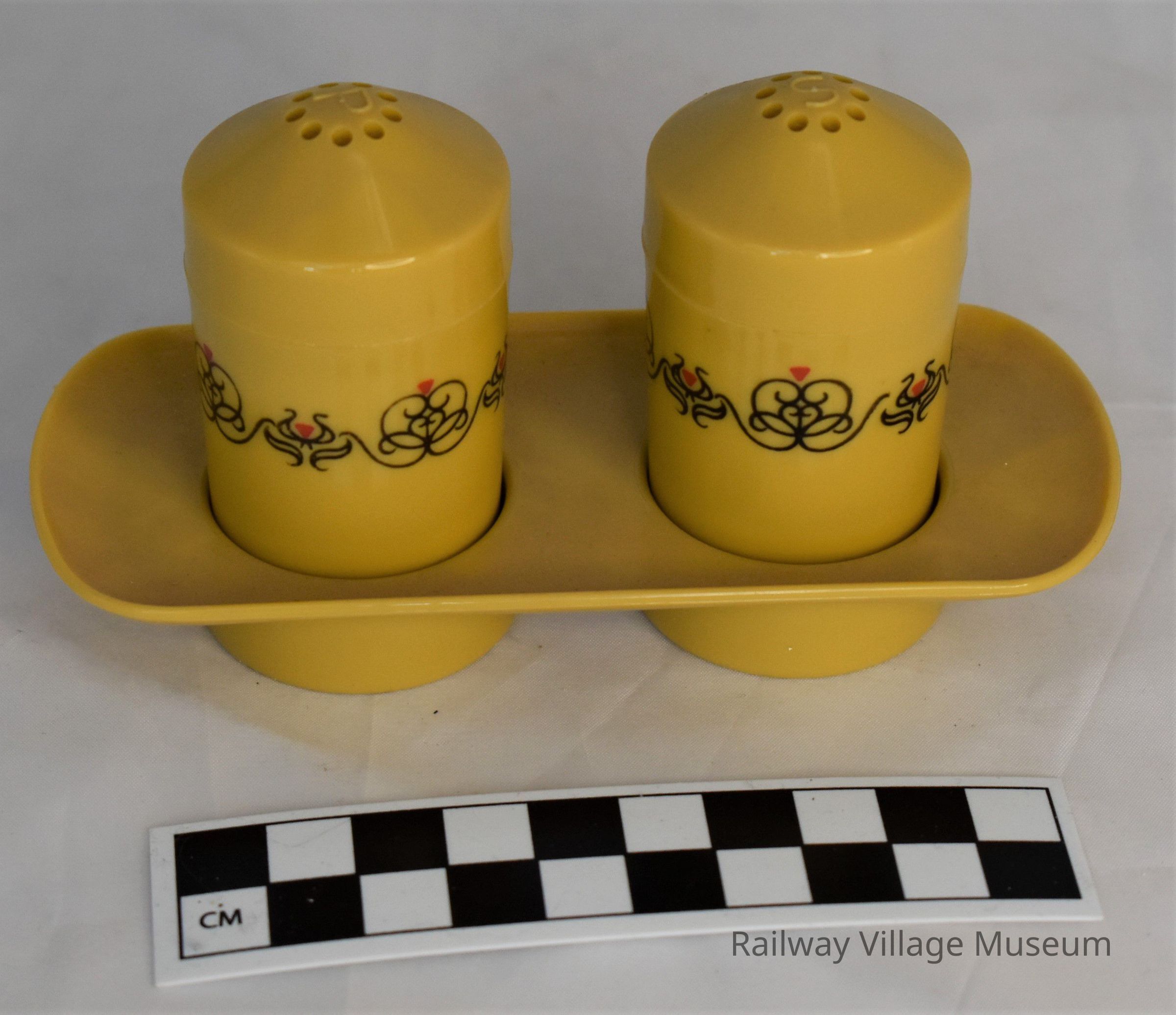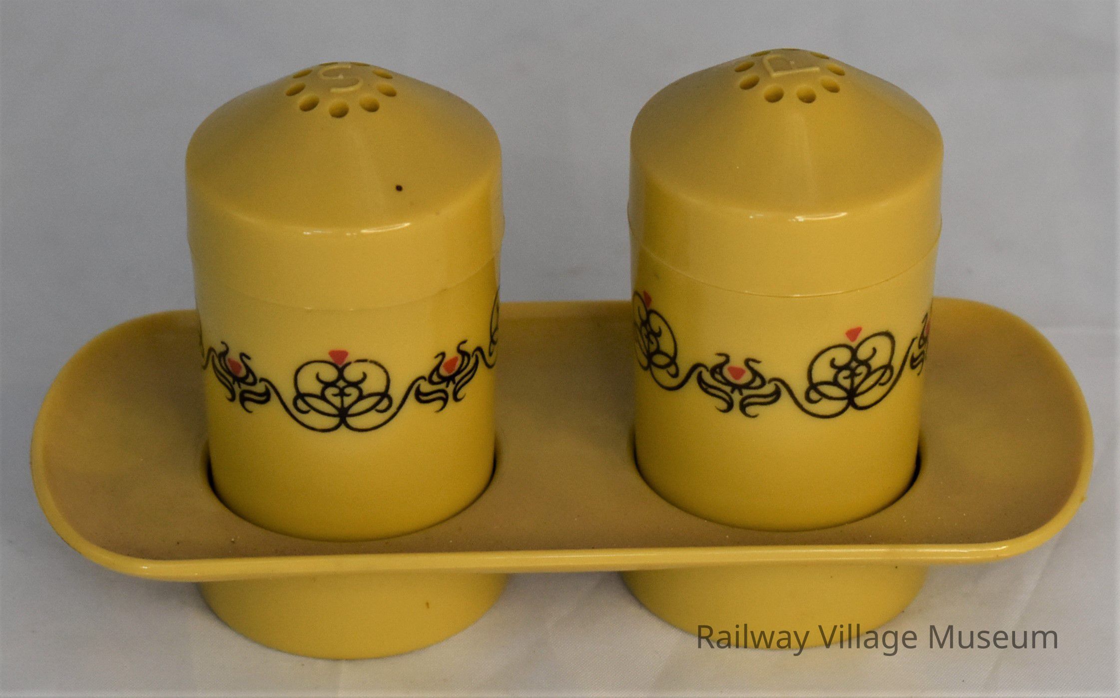 Vintage 1970's harvest gold with black and red decoration salt and pepper shakers with tray made by Eagle in the U.S.A.