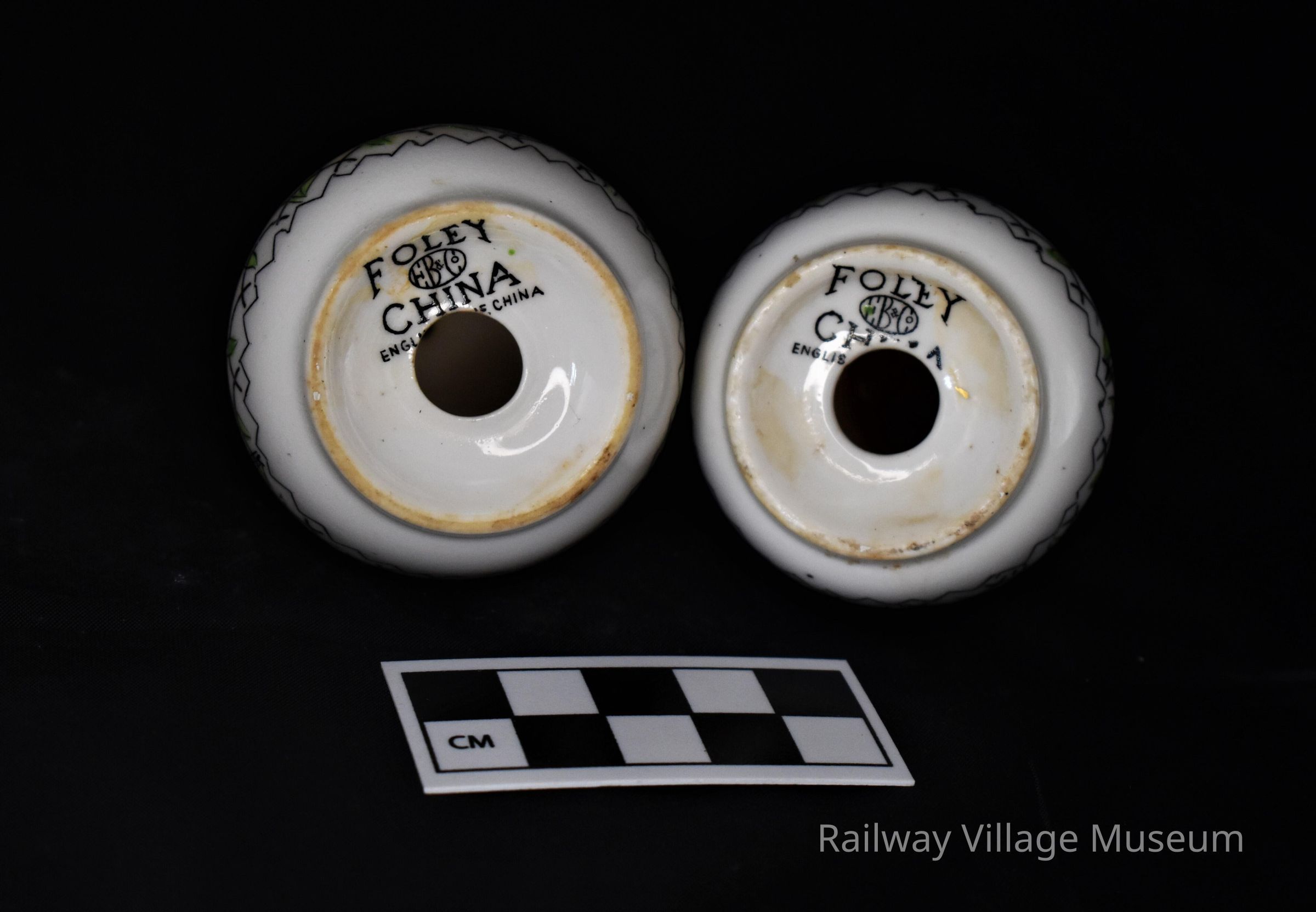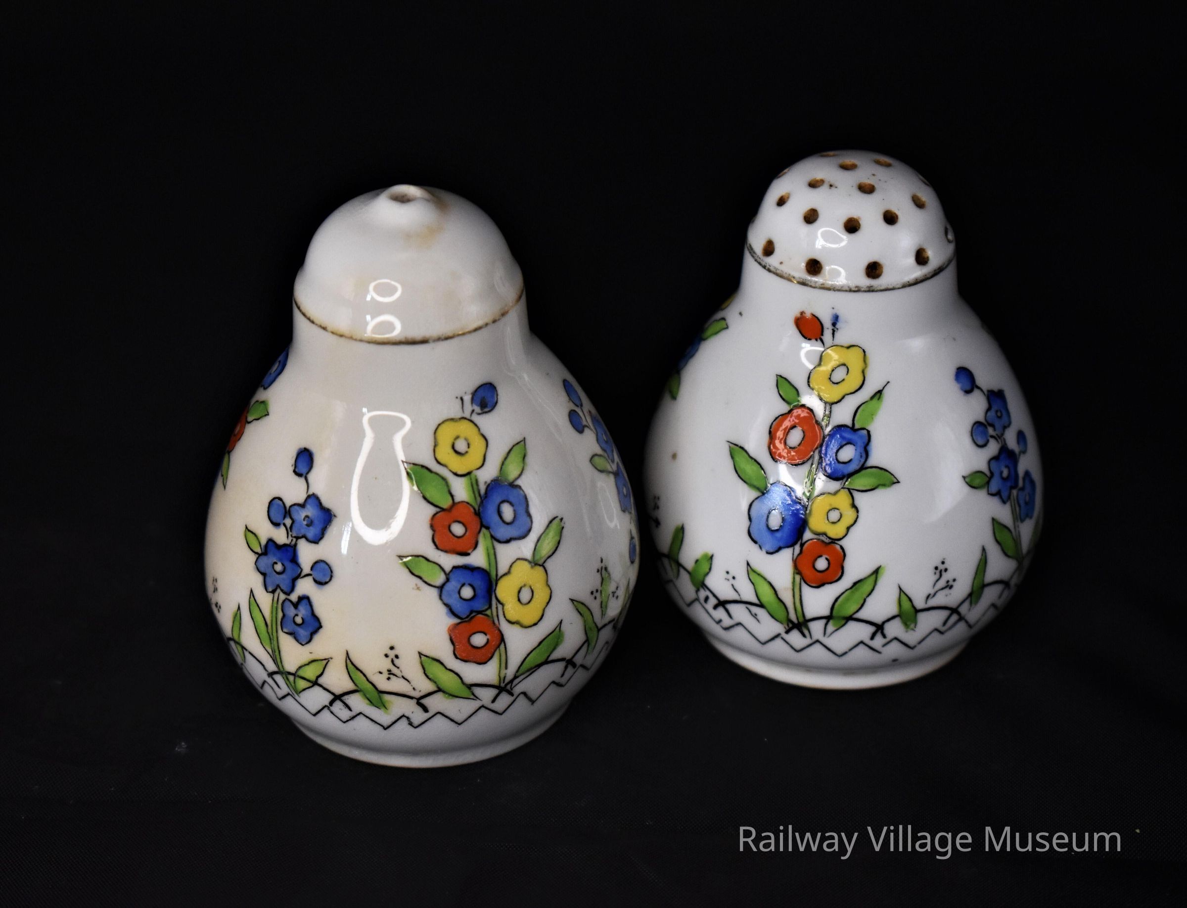Globular bone china shakers with matching floral painted decor. One shaker has only one hole where the other has many. The base is marked with the manufacturer Foley China and EB & Co which was part of a company called Robinson and Sons. Also, states "English Bone China" on the base but it is partially illegible due to missing stoppers.