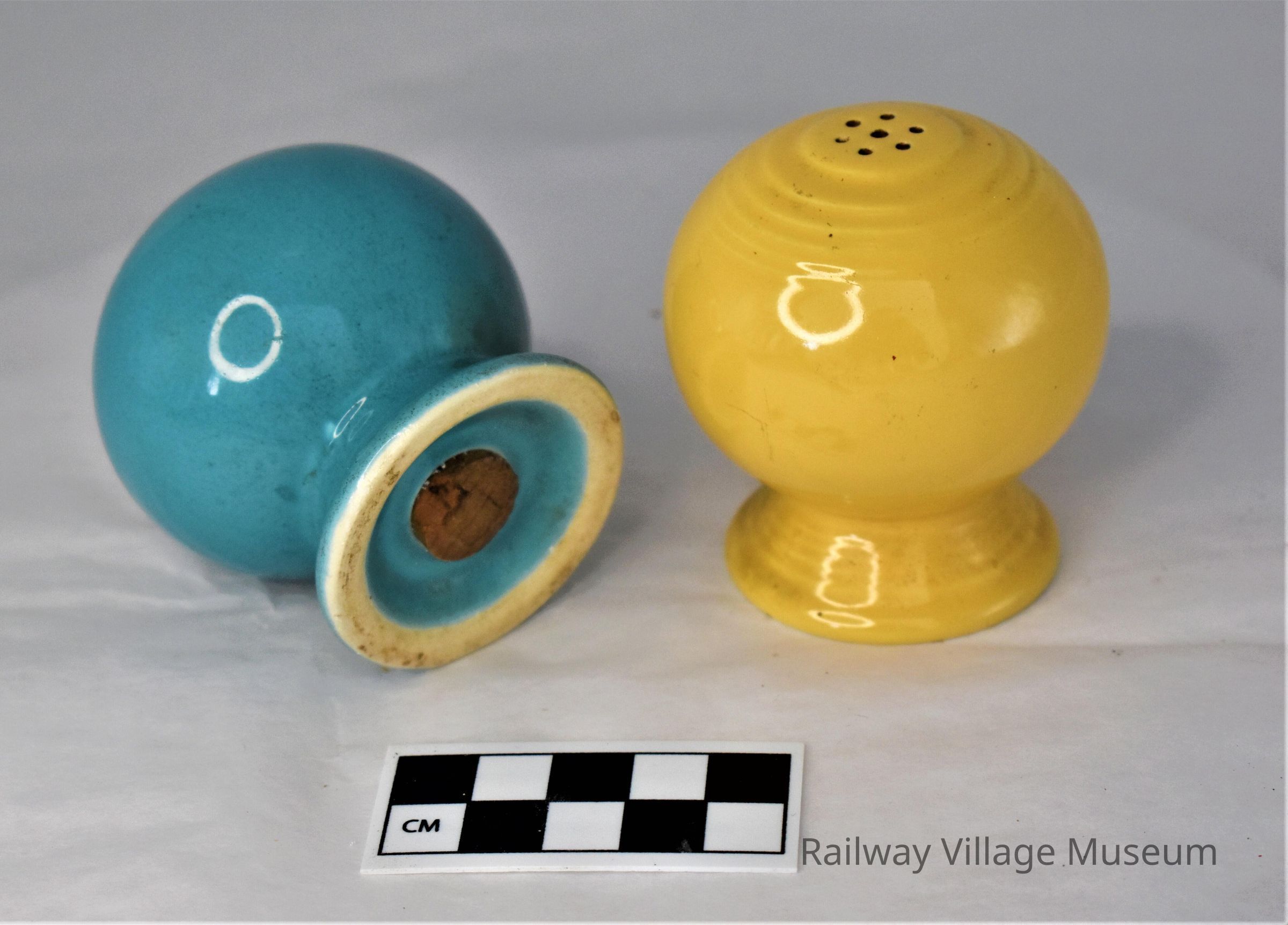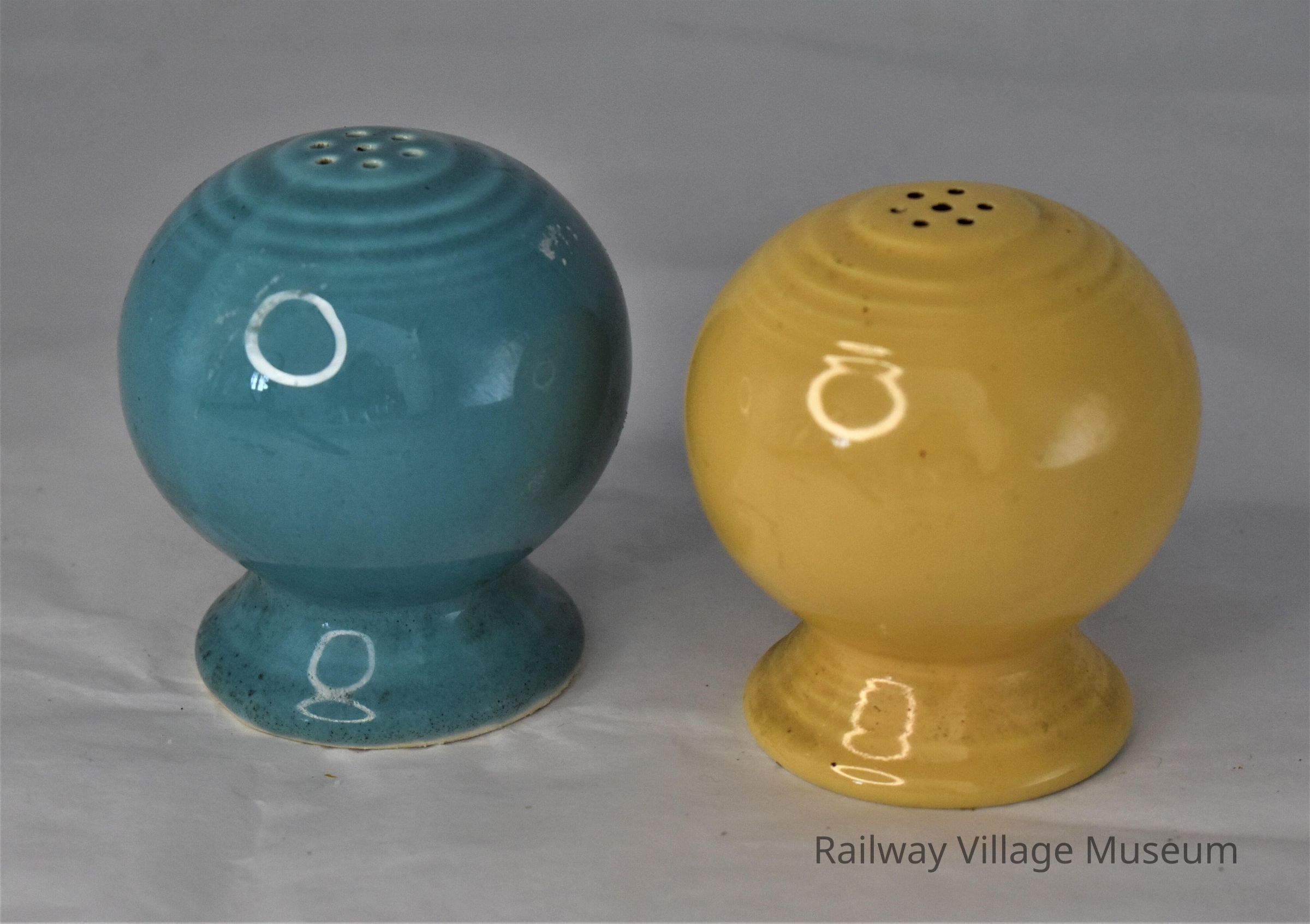 The fiesta salt and pepper shakers were part of a fourteen-piece set made through the entire vintage production. Though they were part of the original line, they were sold separately and not as pairs although there is a distinct difference in them. The pepper shakers have smaller holes and a smaller hole pattern than the salts. They were also one of the only unmarked items in the fiesta-ware line because of their small size. They are slip cast and the mold seam would have to be smoothed by hand. In our collection, the turquoise shaker is for salt and the yellow is a pepper shaker. Interestingly, pre-1972 pieces (such as those in the RVM collections) may be slightly radioactive, due to uranium compounds being used in the ceramic glaze to achieve certain colors, especially red.Made/Created