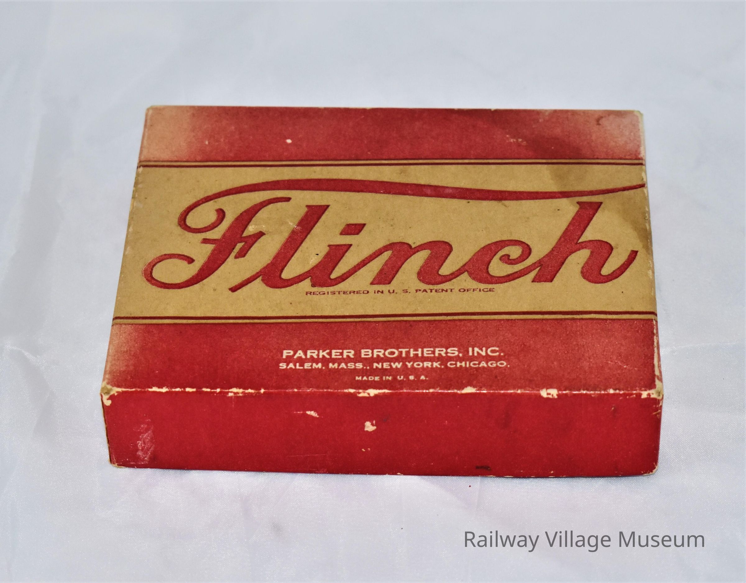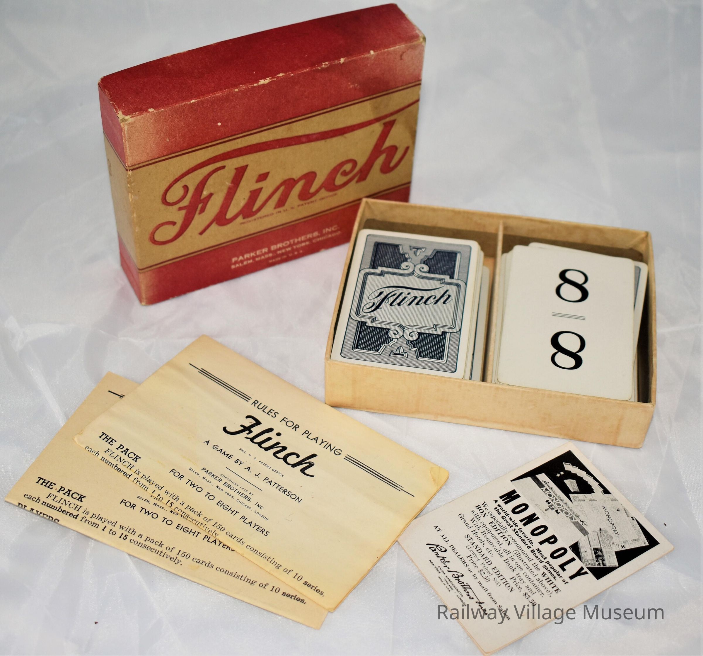Flinch Card game originally invented by A. J. Patterson in 1901 and produced by the Flinch Card Company. The game is based on the concept of stockpiling. This version was produced Parker Brothers, Inc in 1938. This game set still contains instructions and even a small advertisement insert but is missing one number "8" card.