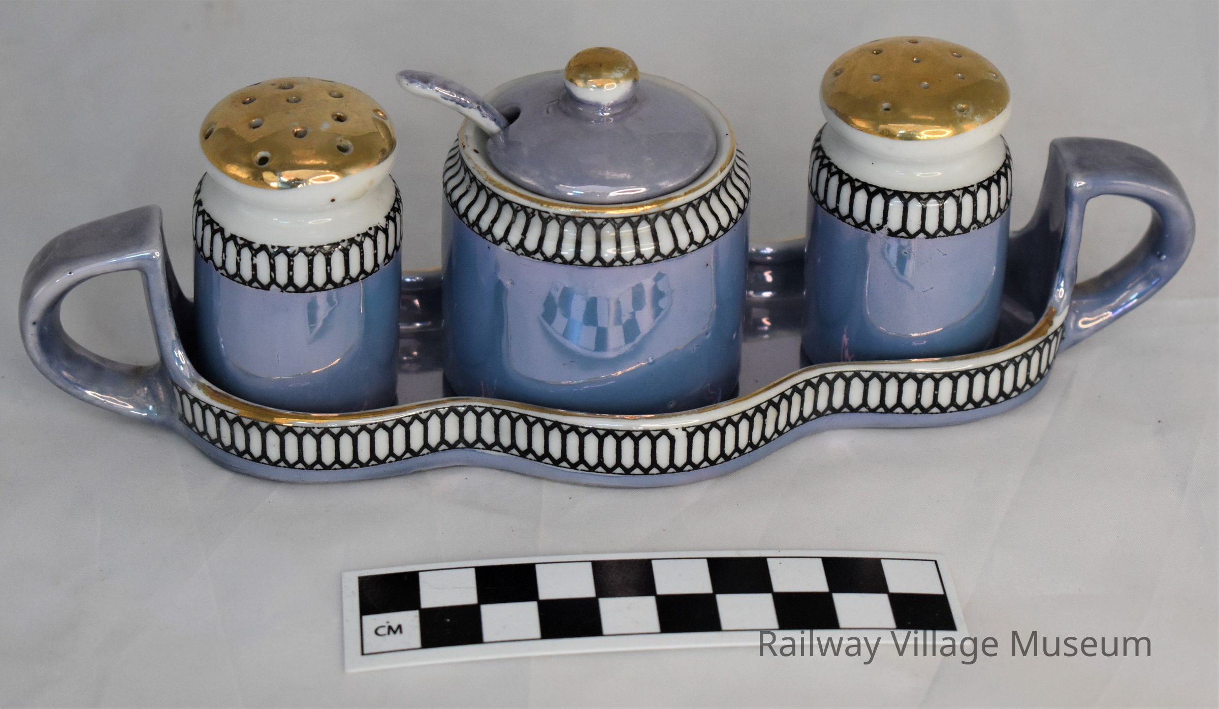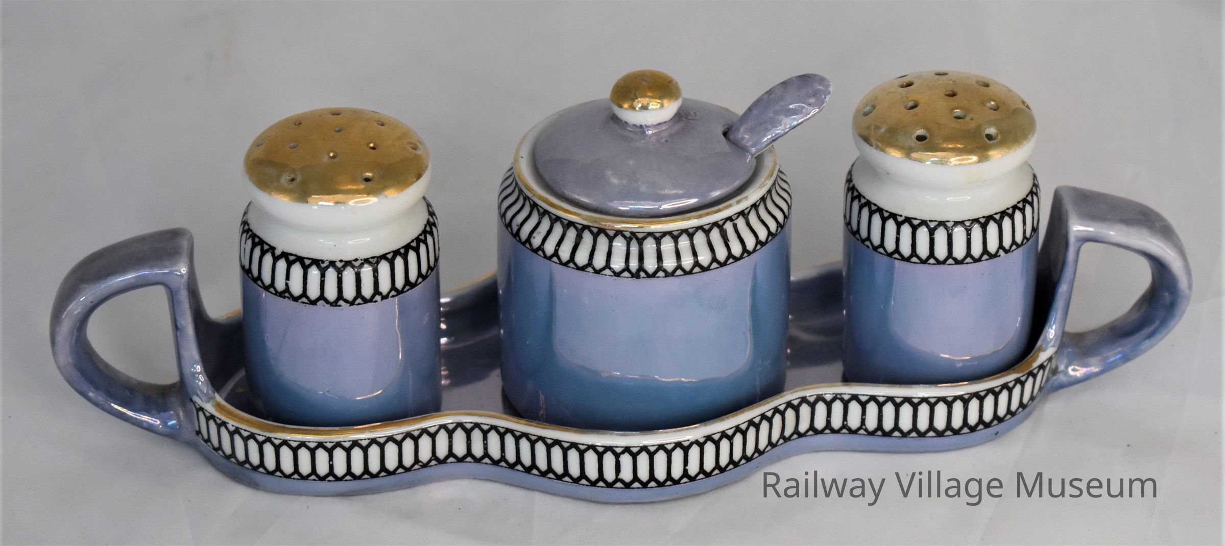 Vintage blue and gold Lusterware set consisting of salt and pepper shakers, mustard with cover and spoon, and handled undertray. Marked "Made in Japan".