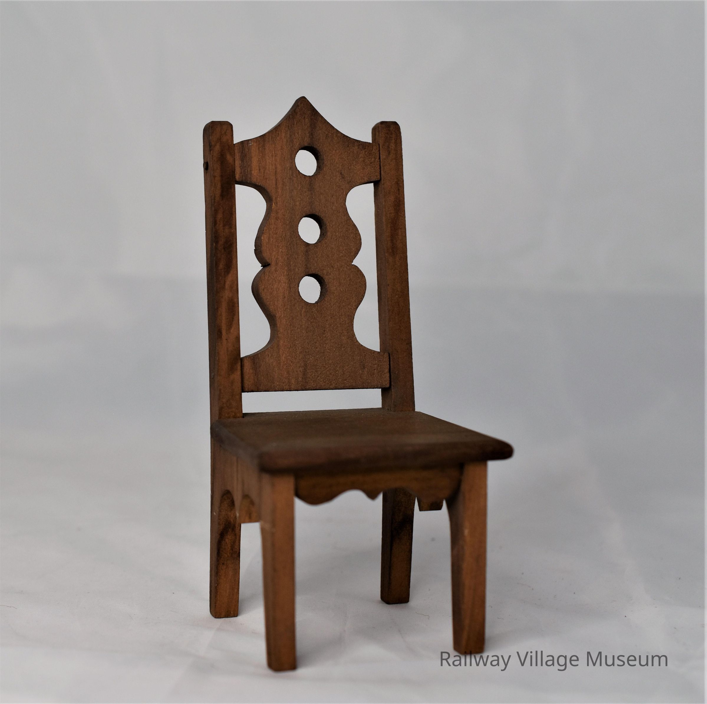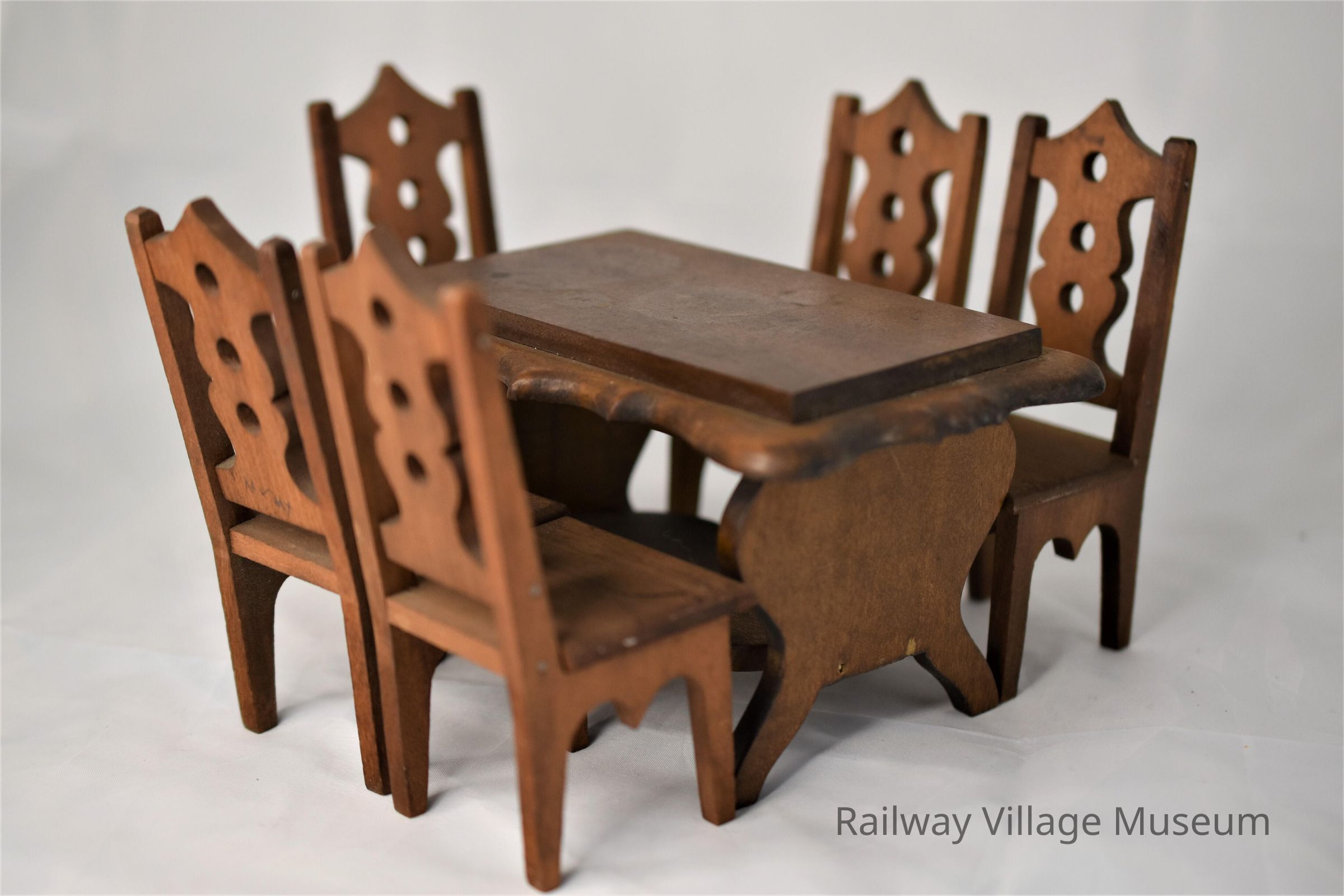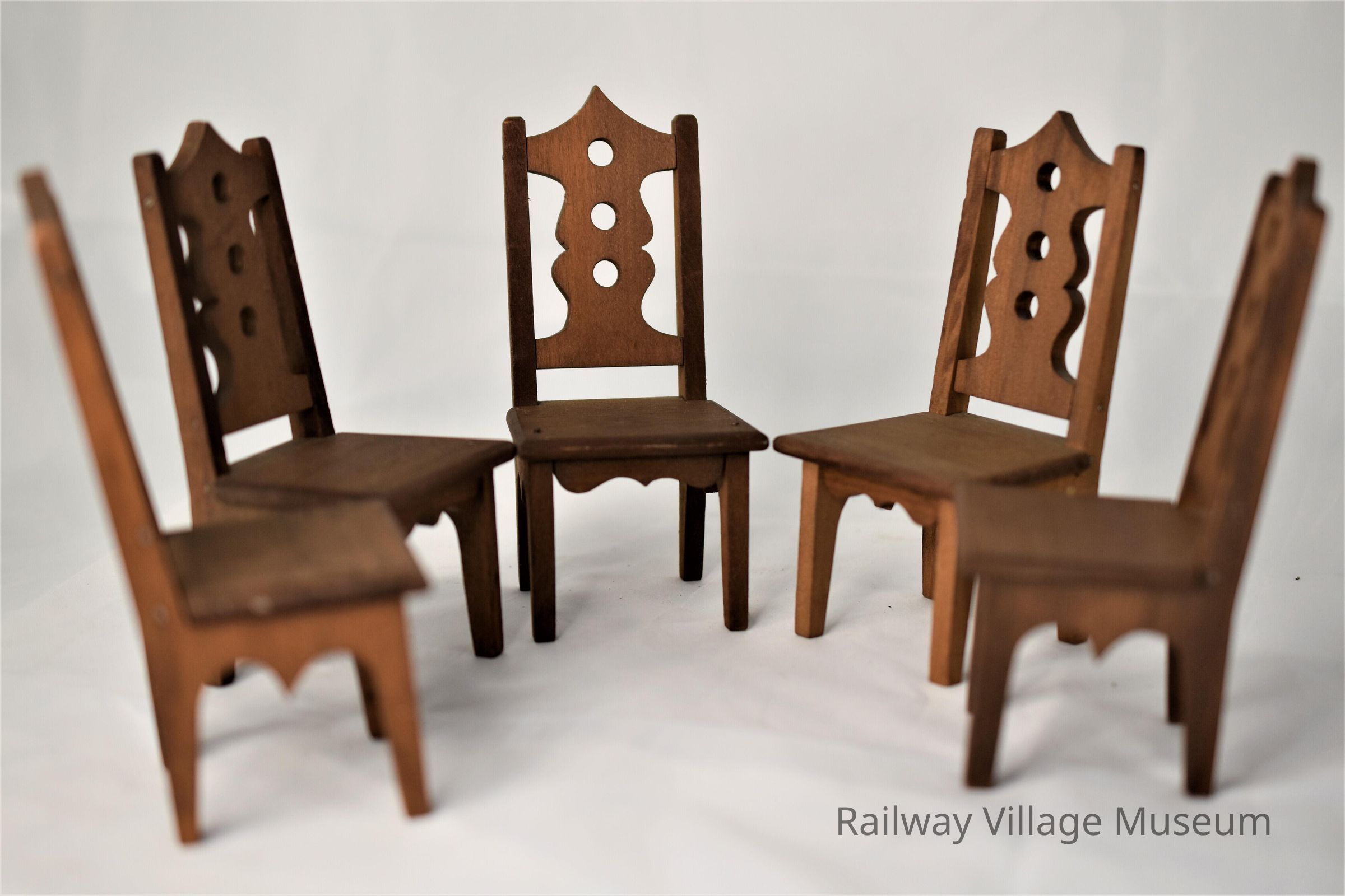 A wooden dining set, by an unknown maker. The chairs are all the same height and width. Their designs are also the same.