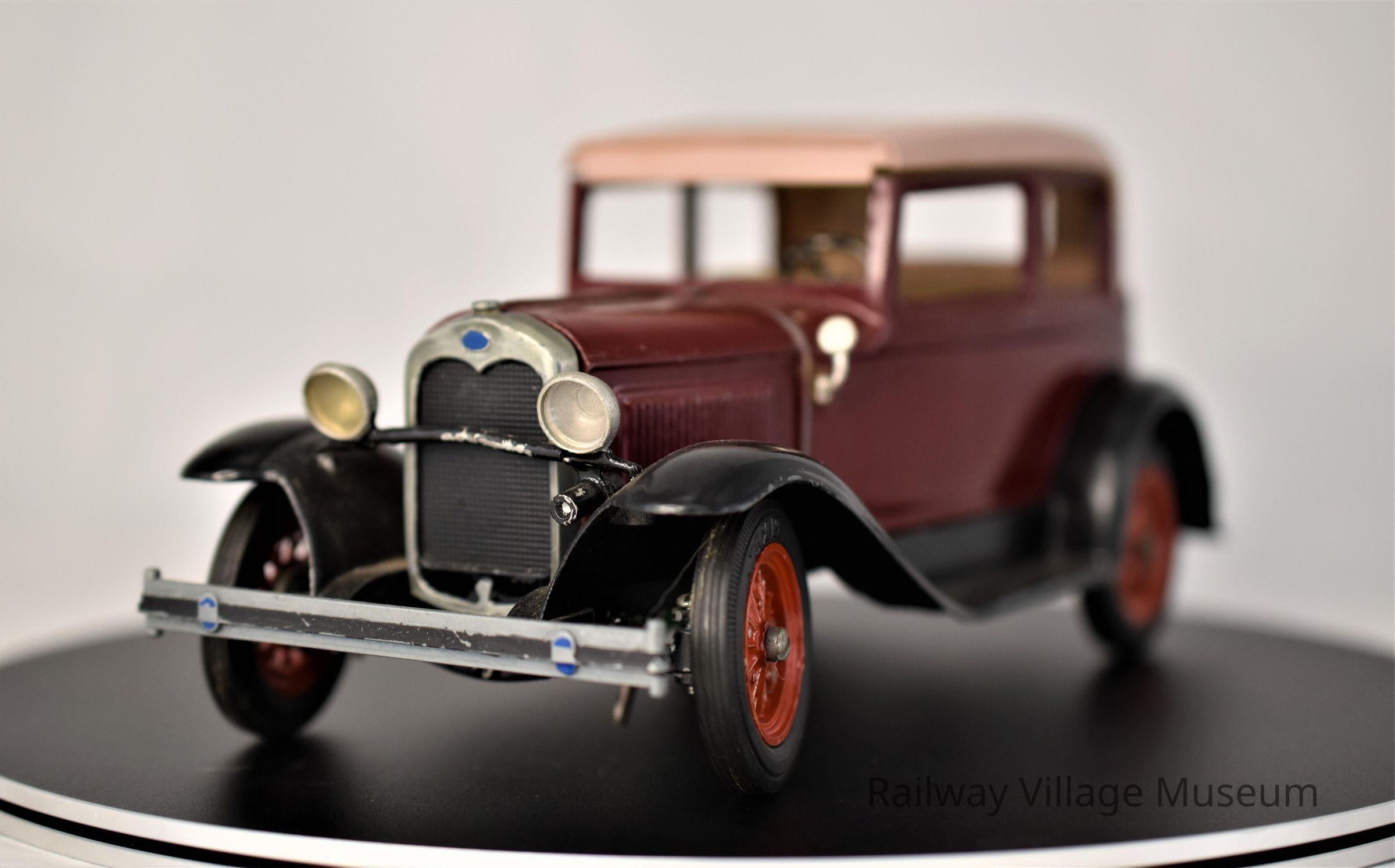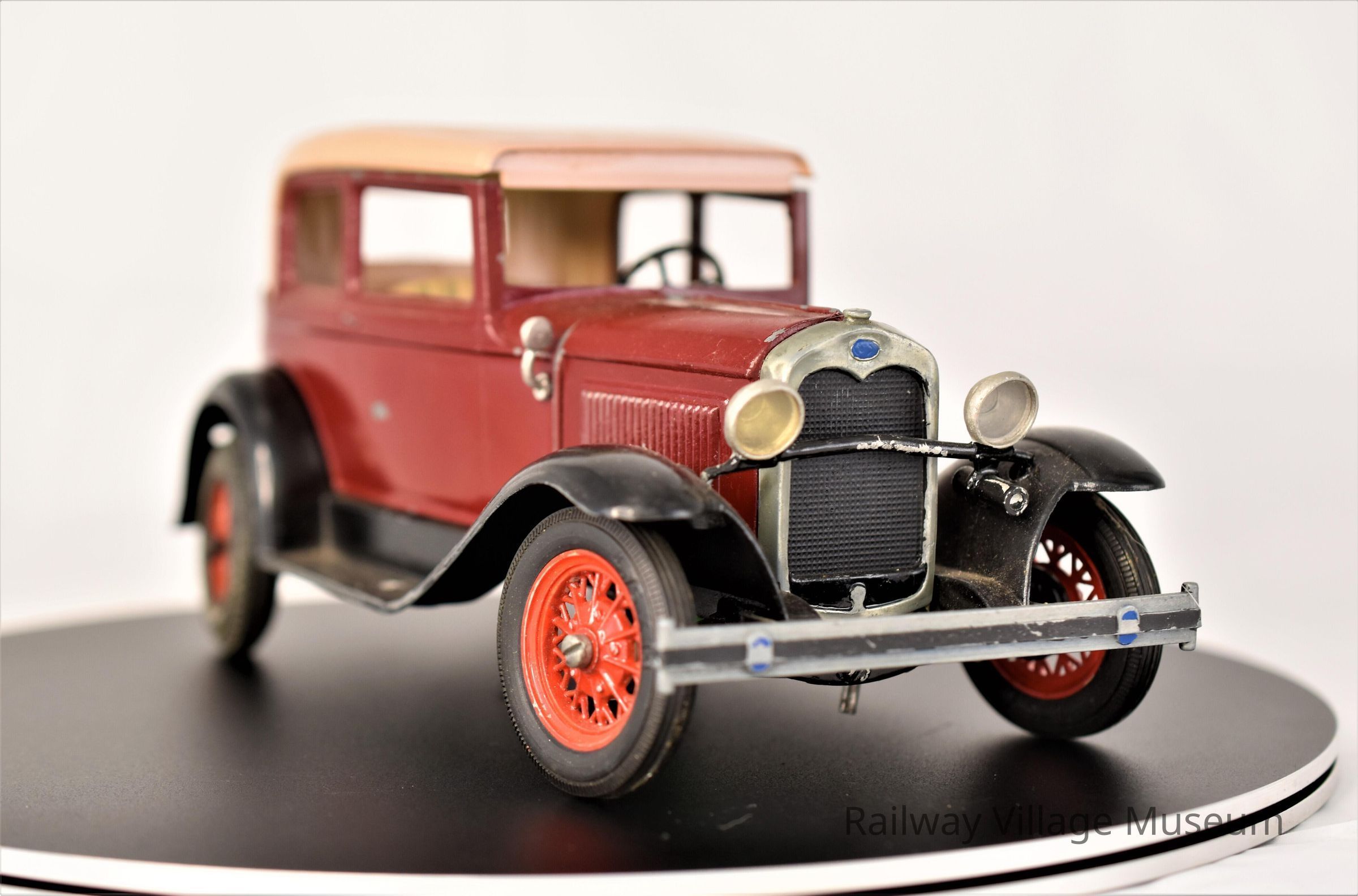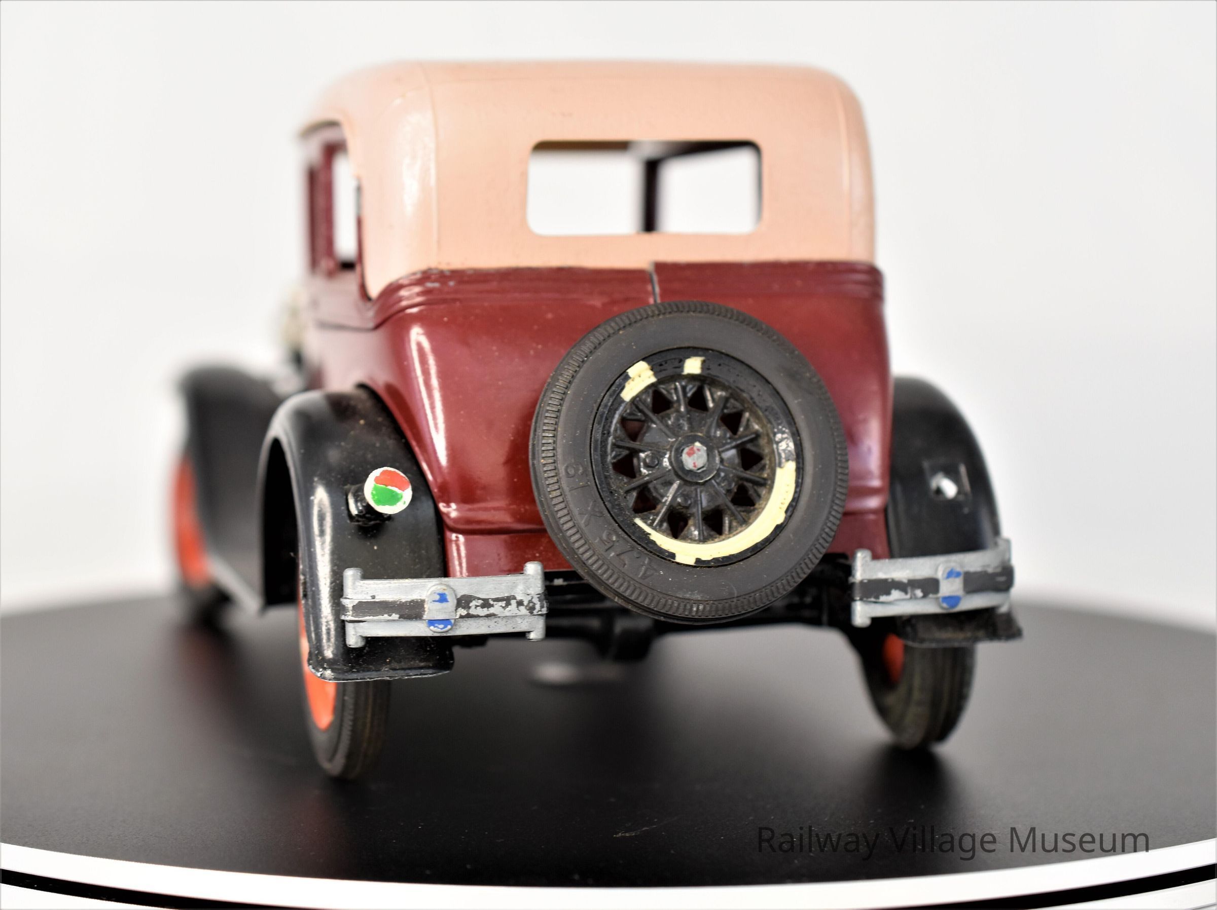 A Hubley Toys Model A Victoria Ford. This car was crafted from a model kit, and it appears complete. The steering wheel turns the two front wheels. Unlike the other cars, this ones spare tire is attached to the back of the car.