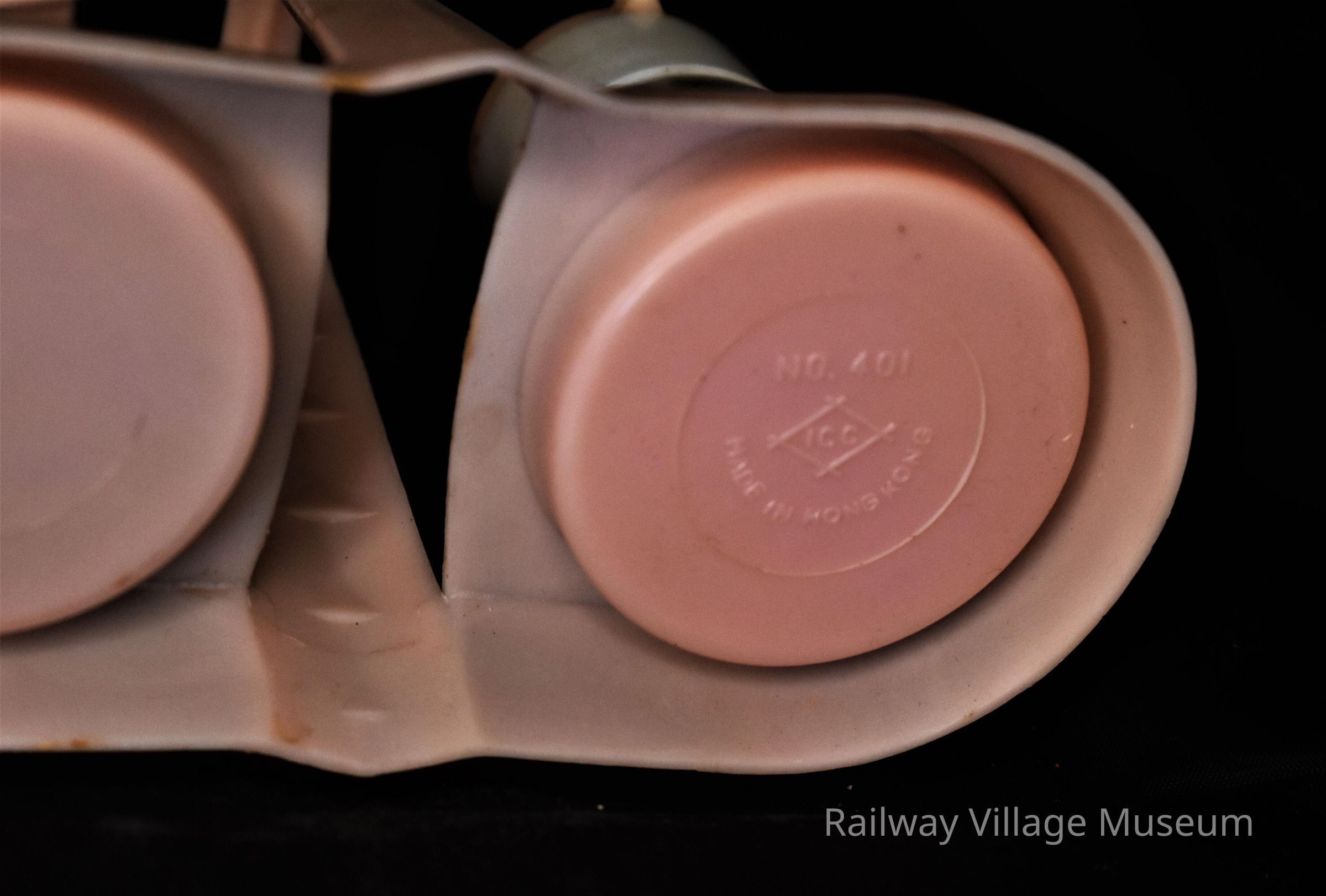 A pink plastic salt and pepper set similar to what would be found in a diner. An unidentified label of "ICC" inside a diamond shape along with "Made in Hong Kong" is on the base of the shaker stand. The set is severely faded.