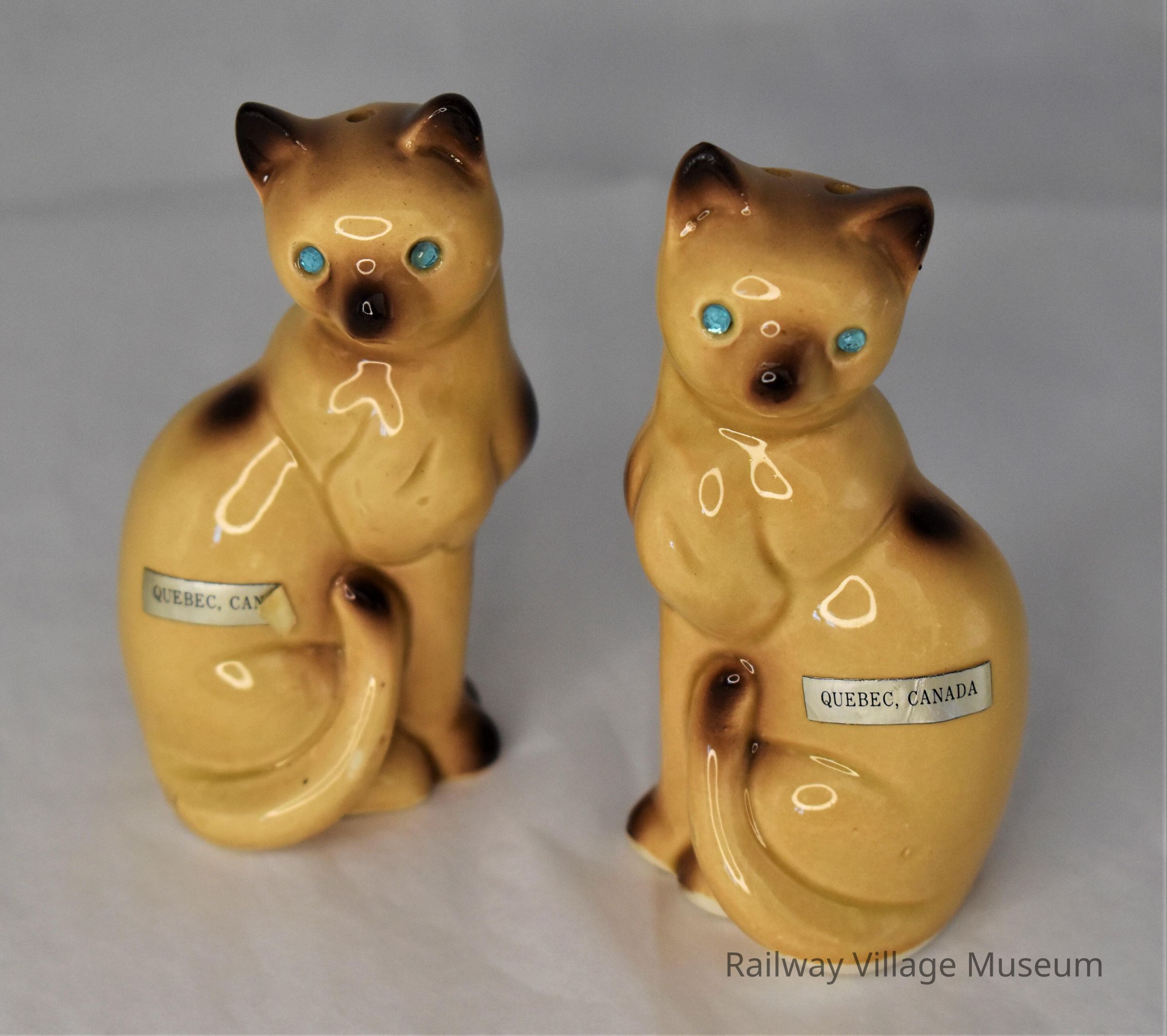 Tan ceramic salt and pepper shakers that resemble Siamese breed coloration. Each cat has blue rhinestones for eyes. Each also has a sticker on their front stating, "Quebec, Canada". One has a "Japan" stamp on the base.Lexicon