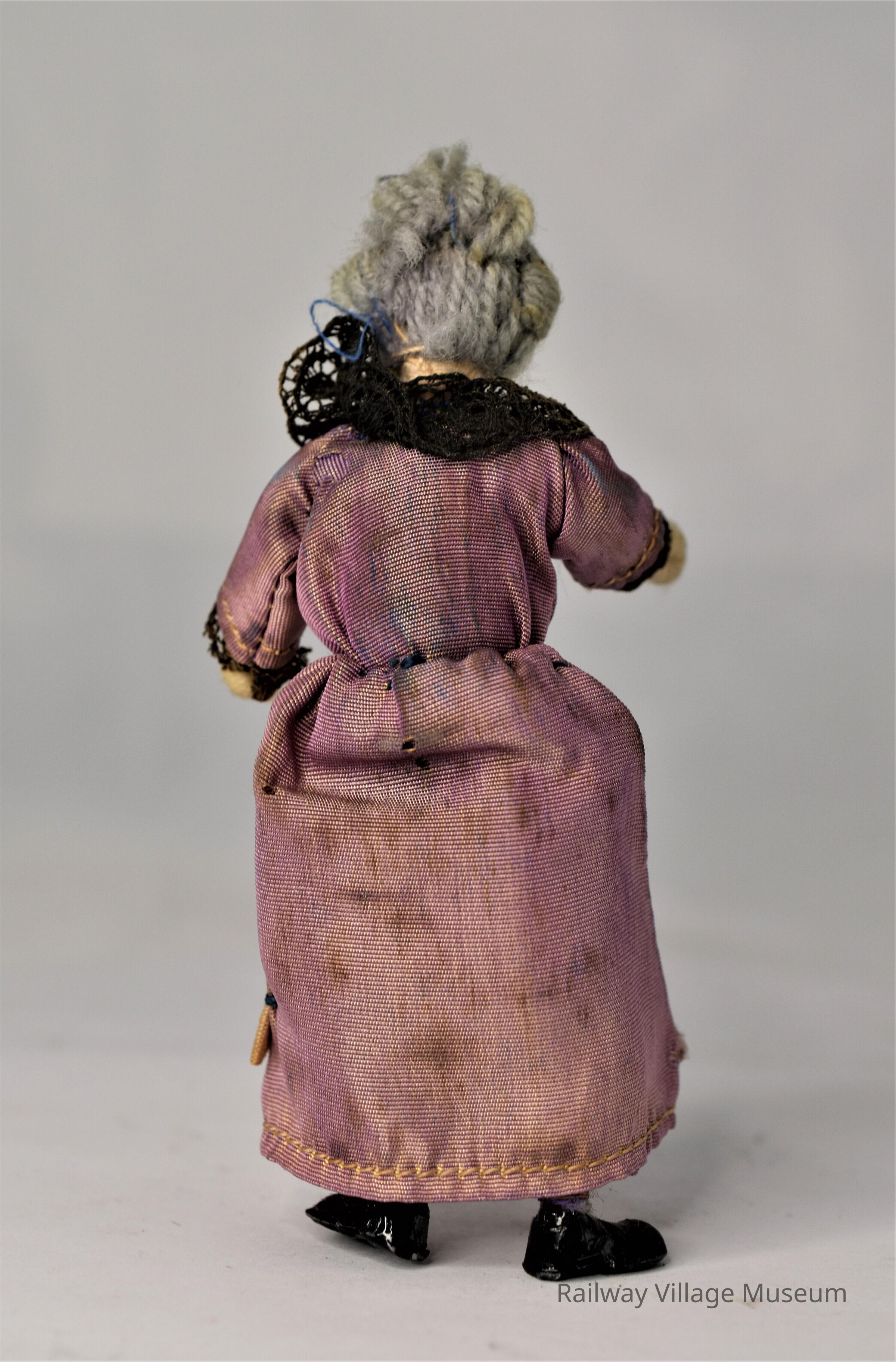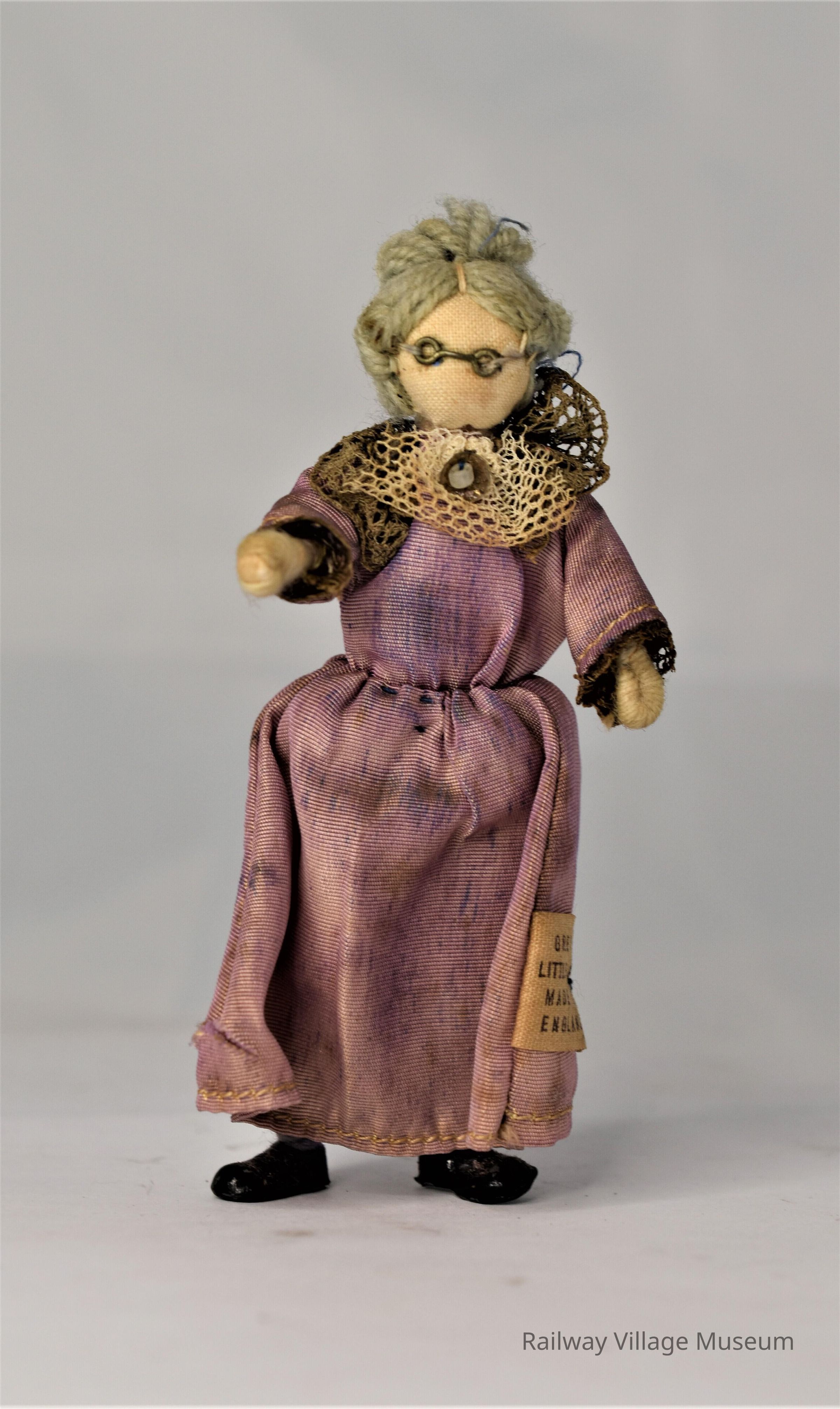 A grandmother doll, made by Grecon Dolls. Everything about her is original. Her hair is made from gray yarn. Her glasses is a piece of wire sewed to her head. The rest of her is a combination of cloth, yarn, and metal.Lexicon