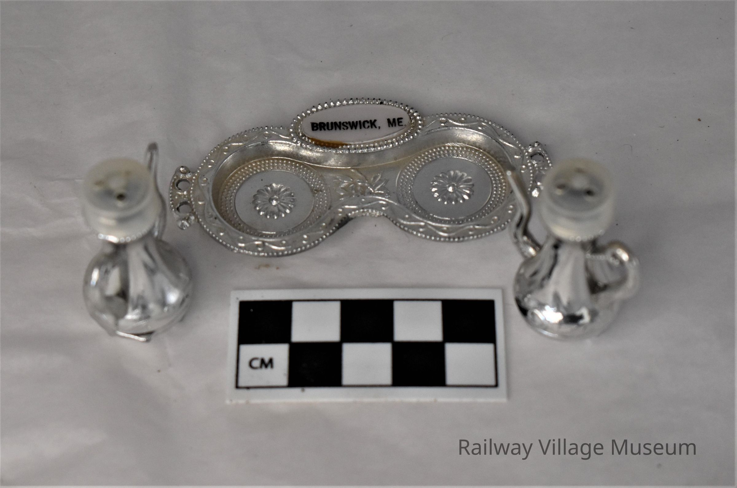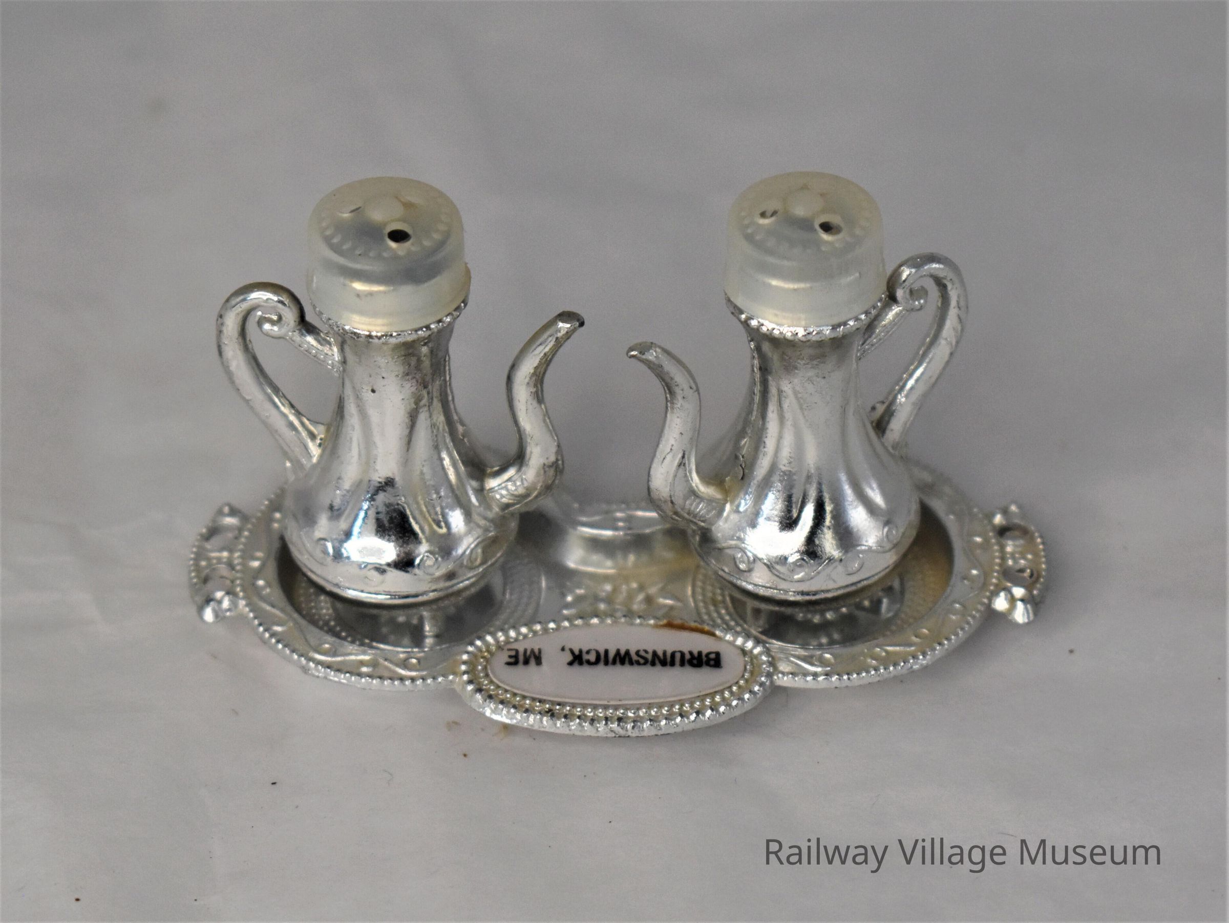 Metal teapot salt and pepper shakers with plastic tops. Accompanied by a small dish decorated with a floral pattern and name plate saying, "Brunswick, ME". Made in Japan.