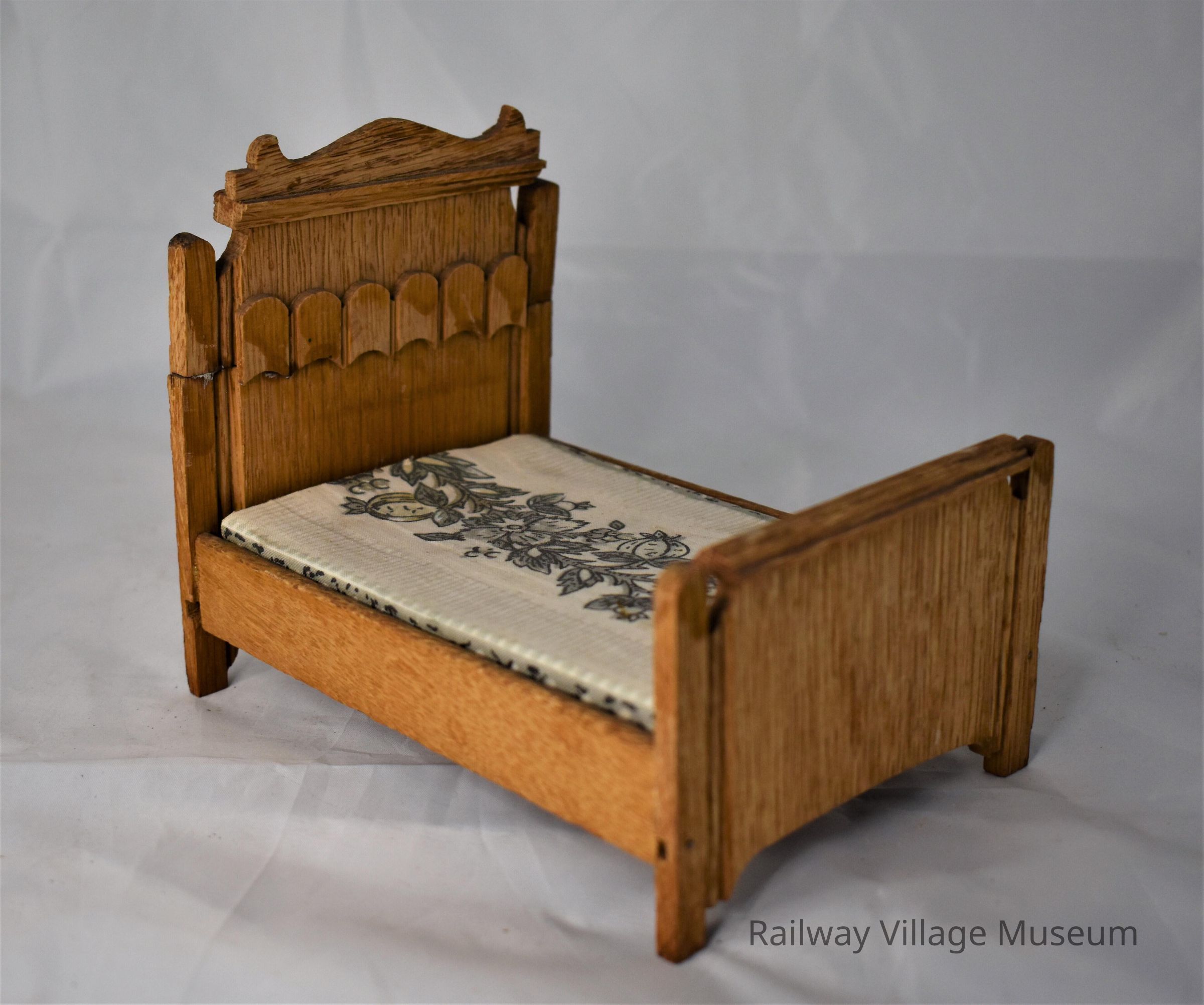 A wooden bed, by an unknown maker. The mattress is a cloth covered piece of cardboard.