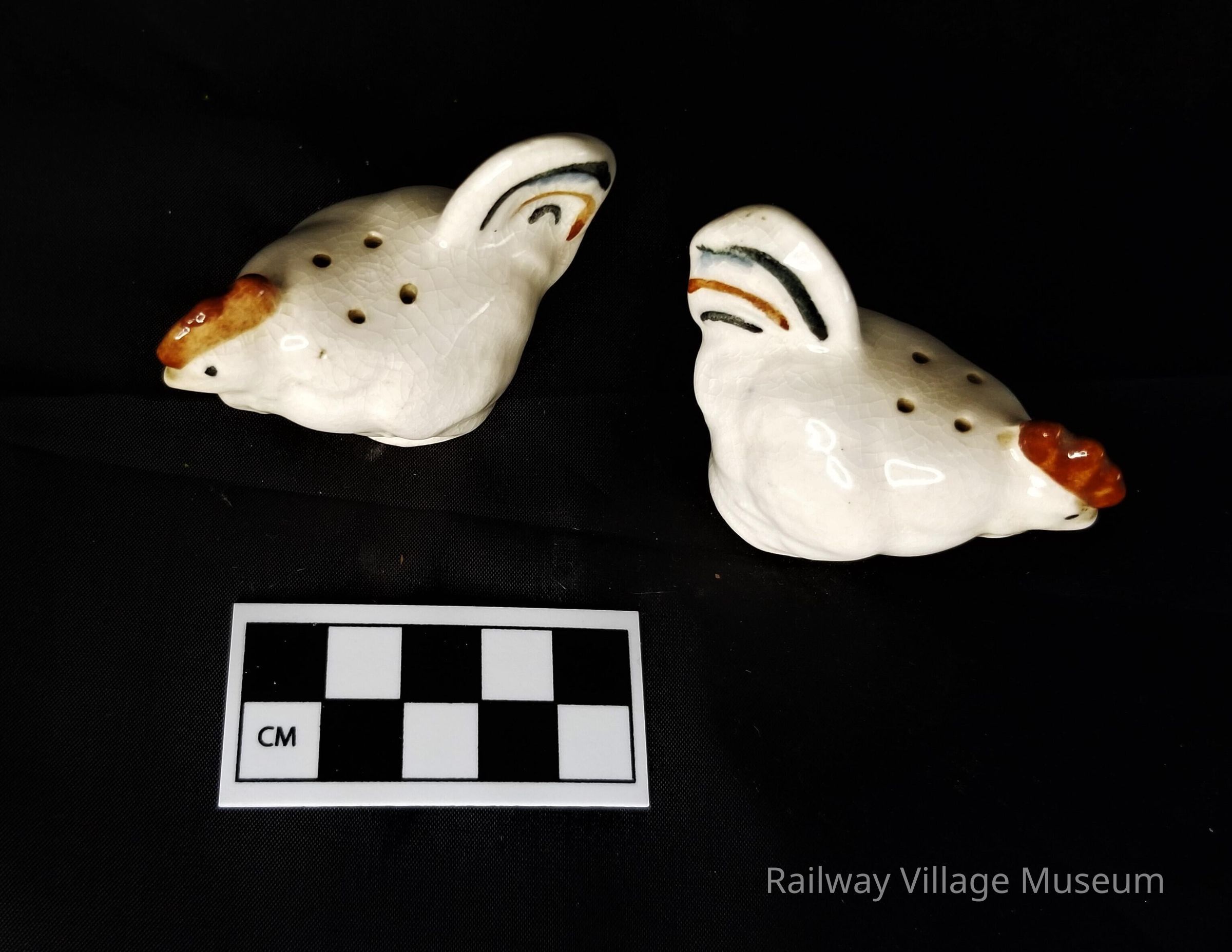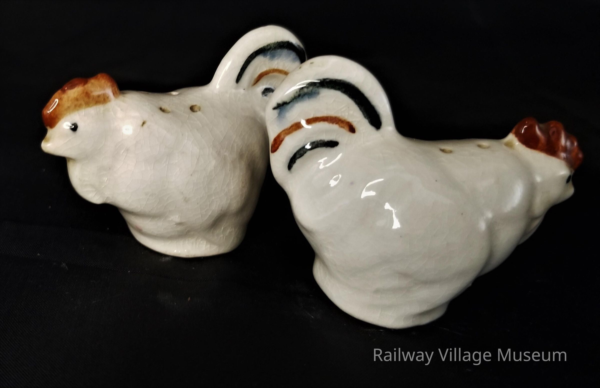 Hand-painted bisque ceramic chicken/rooster shakers. No stoppers. Unmarked.