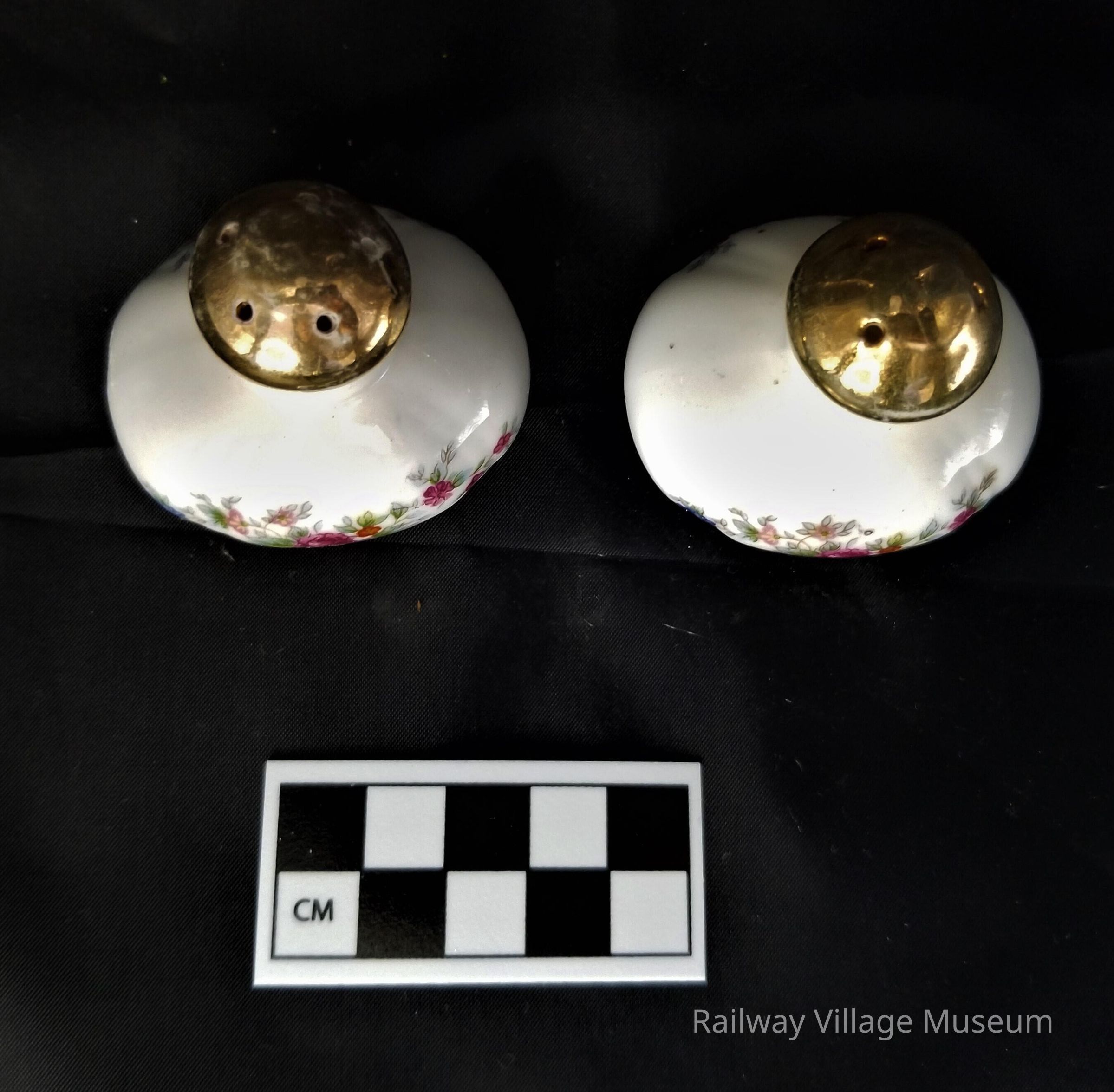 Porcelain salt and pepper shakers with floral motif. Unmarked.