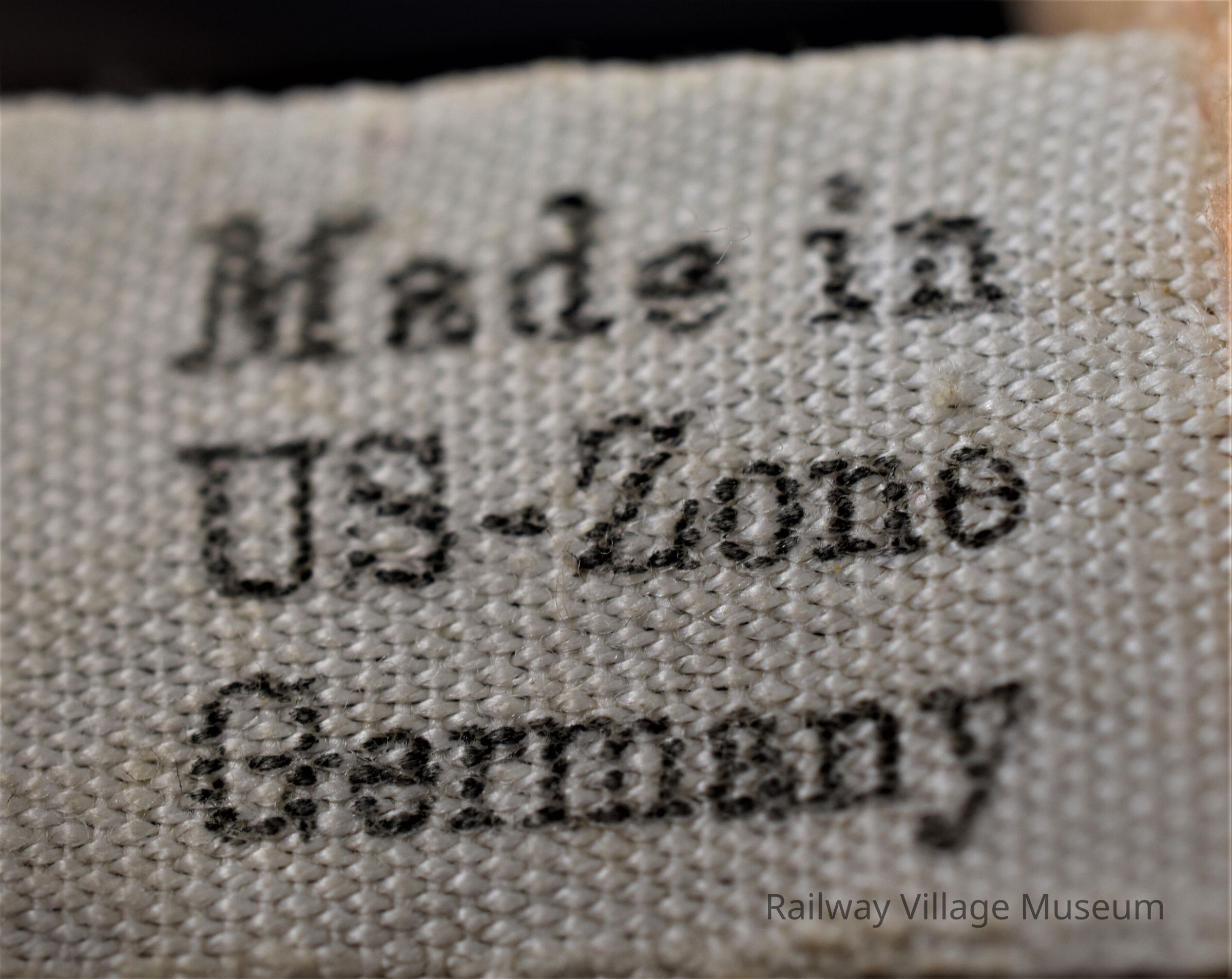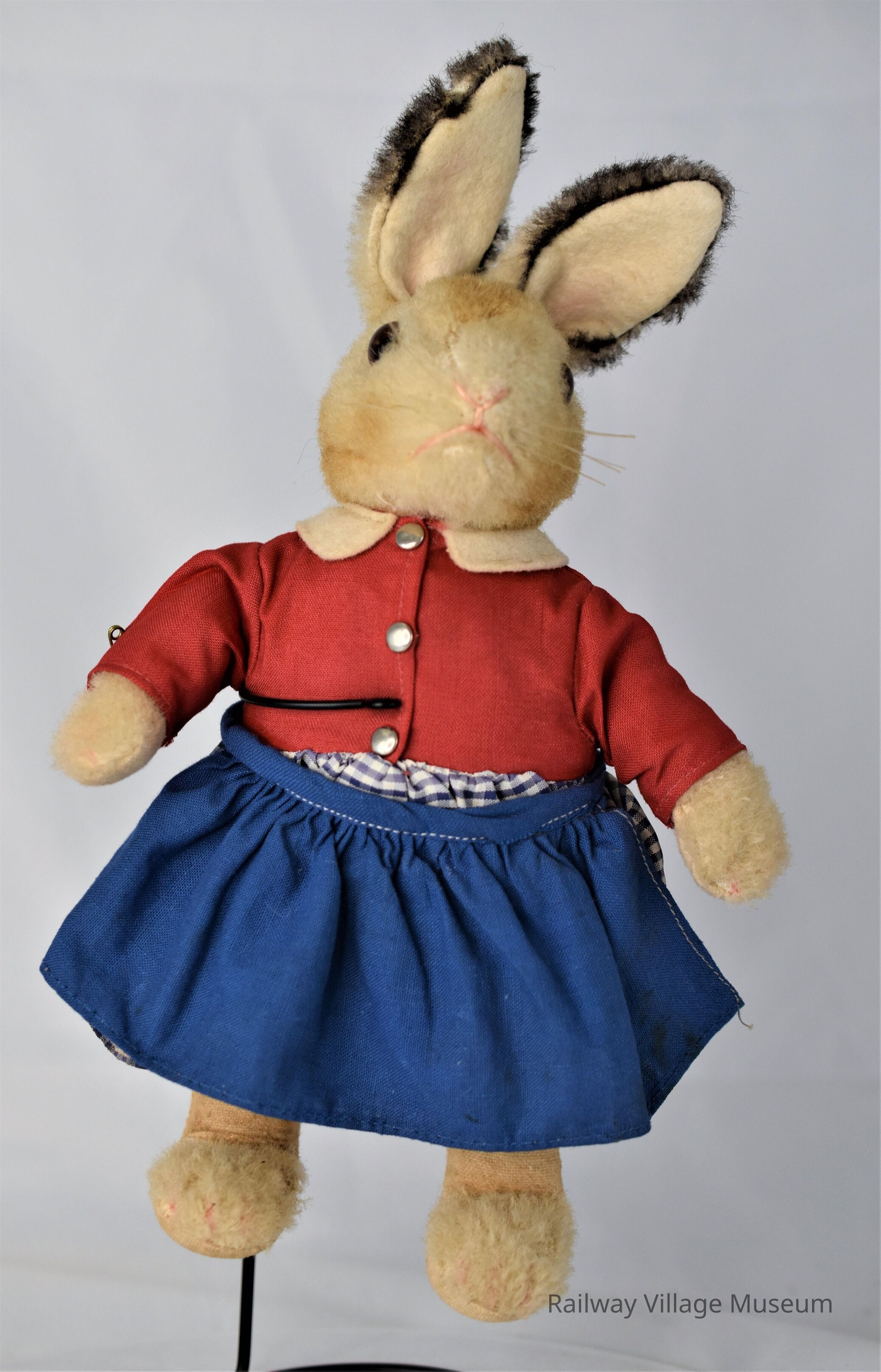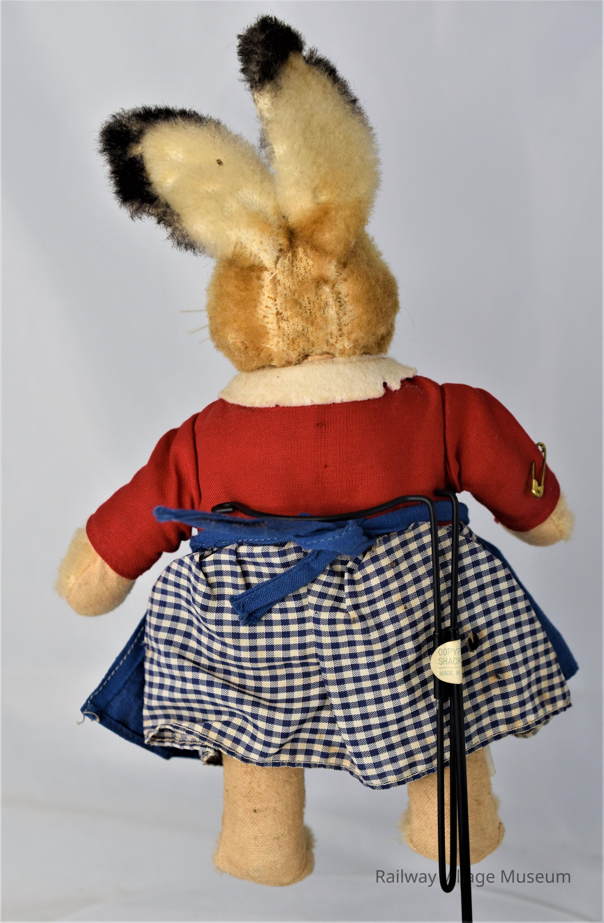 A Steiff stuffed bunny, dressed in a red blouse, a blue-checkered skirt, and a blue apron. Attached to her leg is a tag that reads "Made in US-Zone Germany." US-Zone was a part of post World War II Allied occupied Germany, with the US-Zone located in the south.Made/Created
