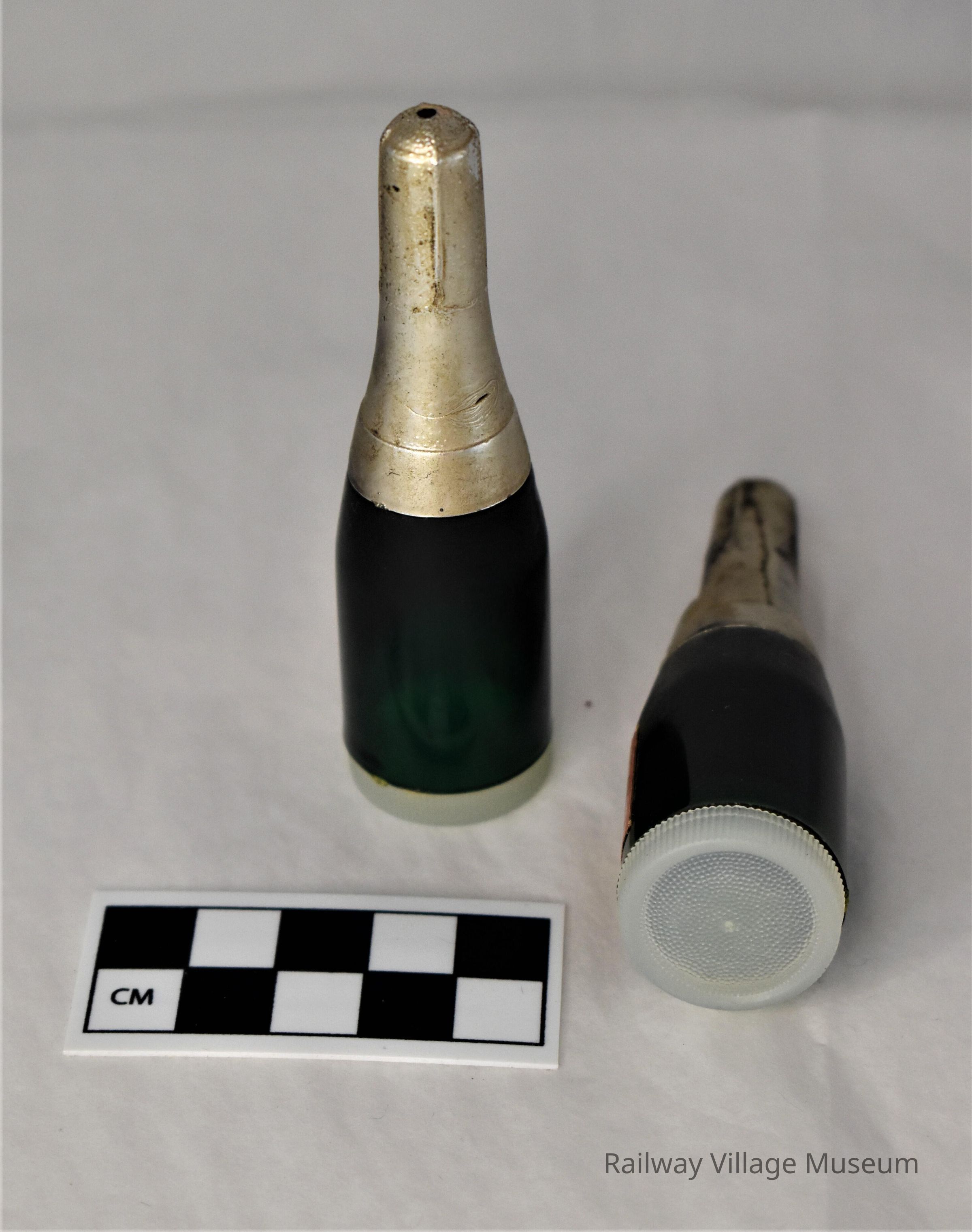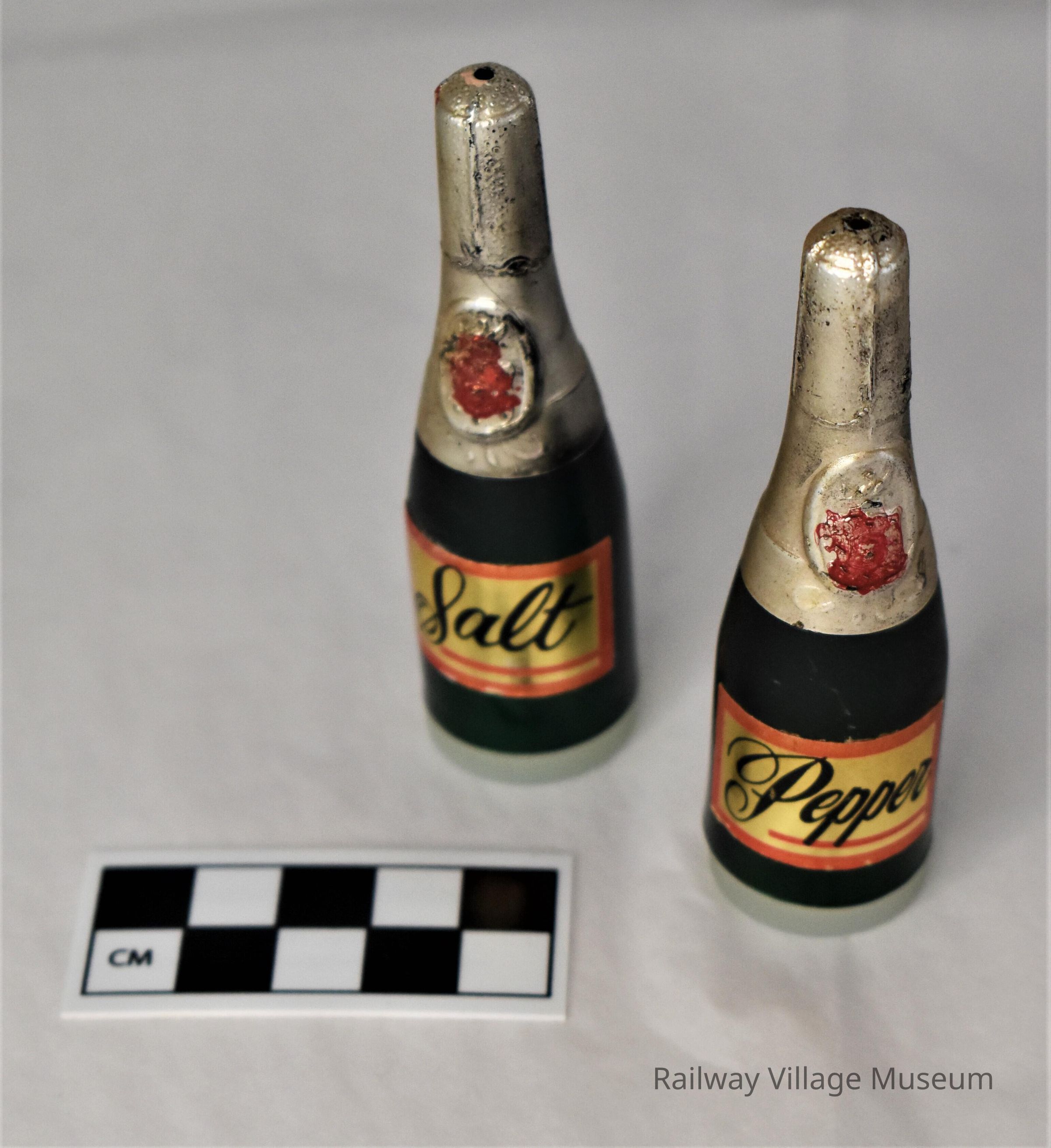 Plastic champagne bottle shaped salt and pepper shakers. plastic stopper in place. Unmarked/