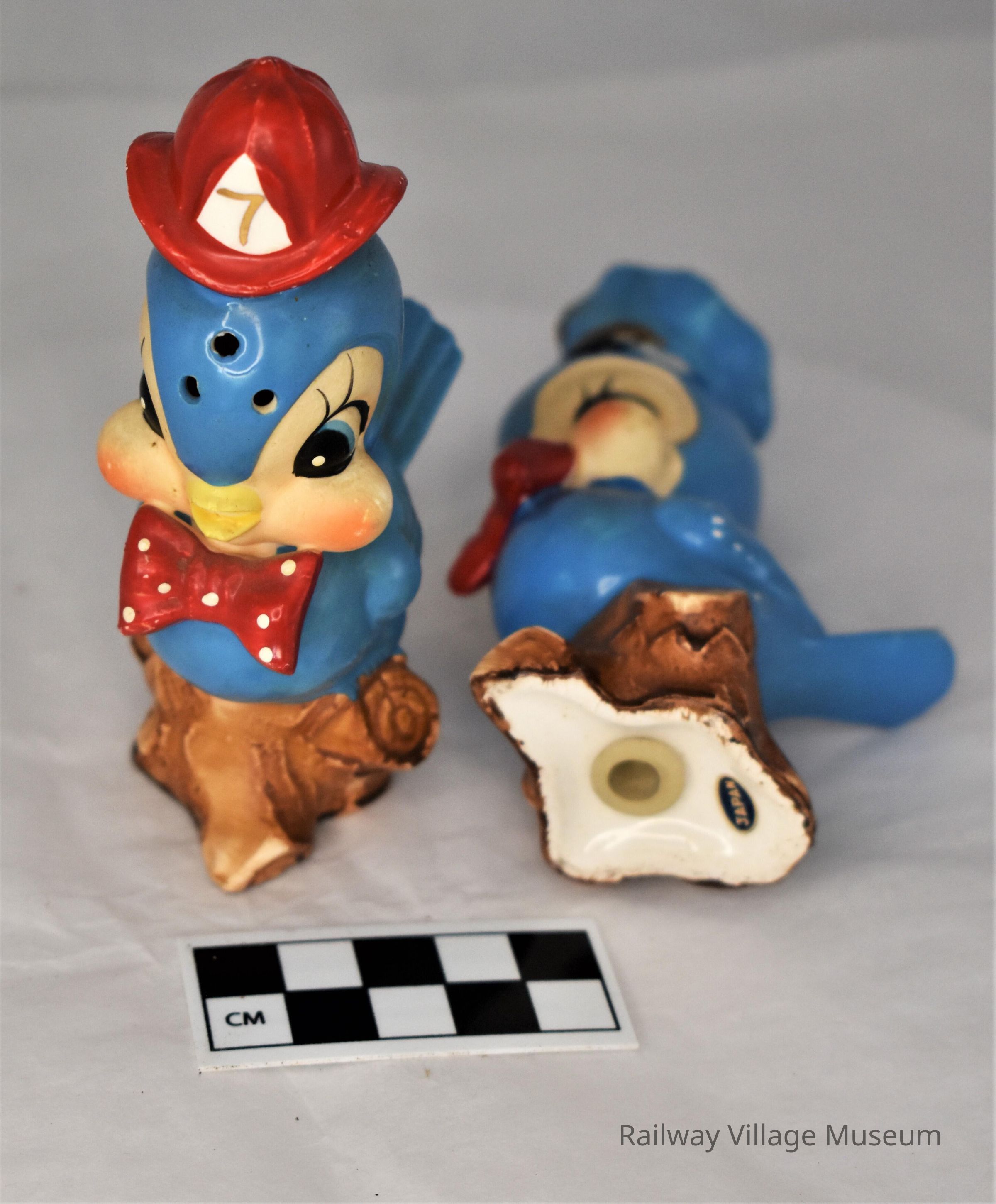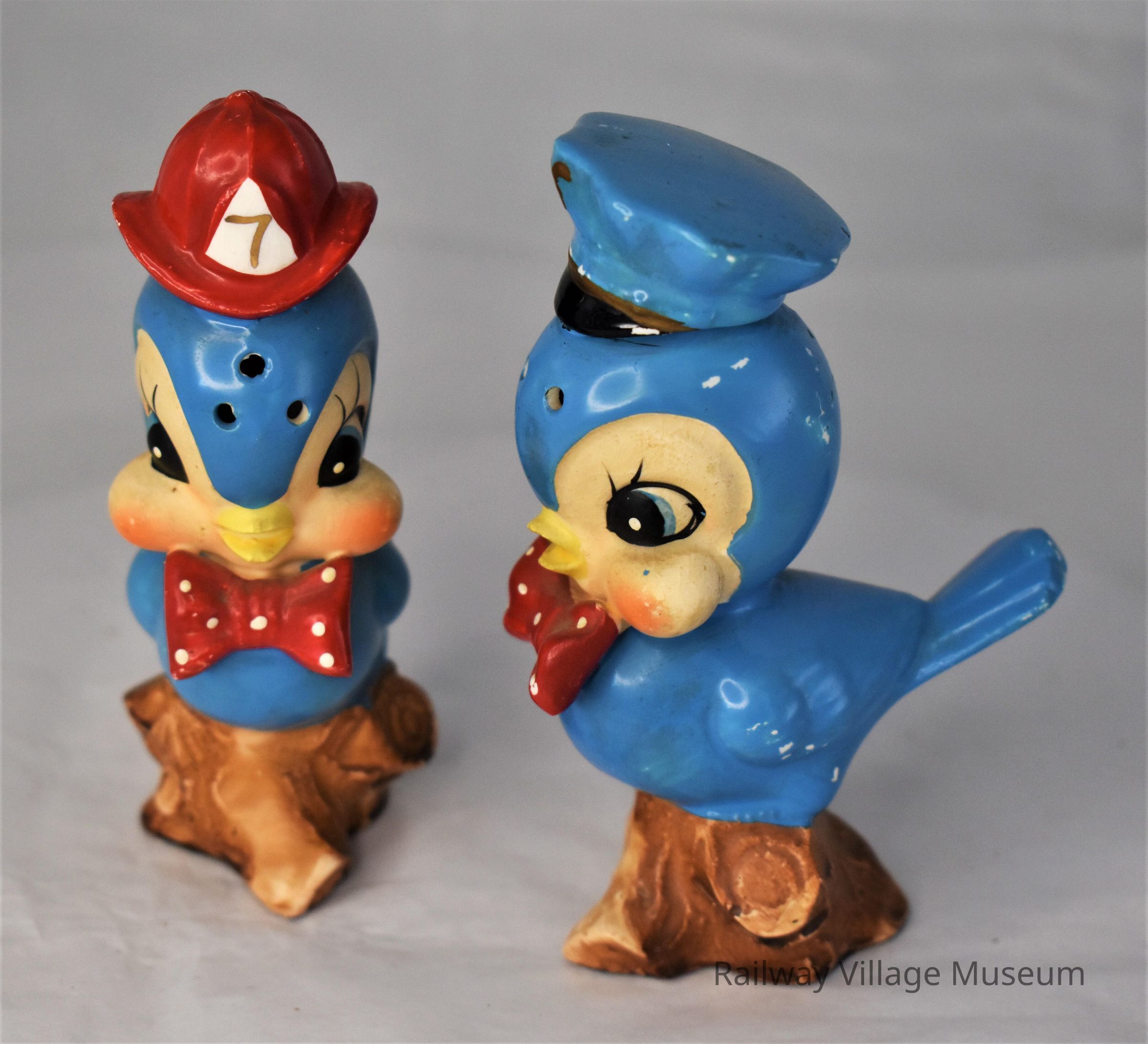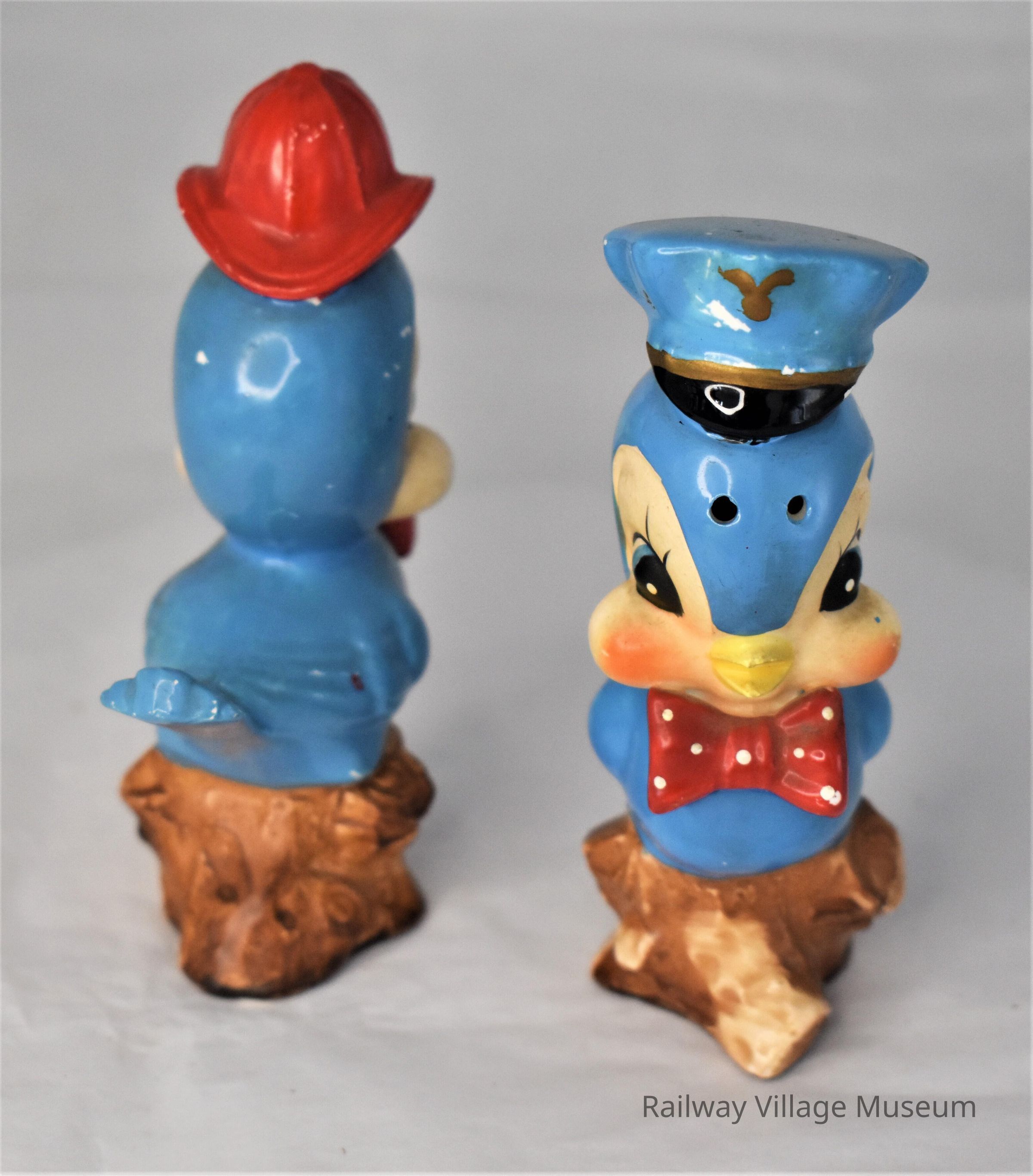 These ceramic salt and pepper shakers are a pair of jaunty blue birds. Salt is wearing a fireman's helmet and pepper is wearing a postal worker's cap. Besides their hats, the hand-painted birds themselves are matching and perched atop tree stumps. Made in Japan. Both have Japan stickers and plastic stoppers intact.