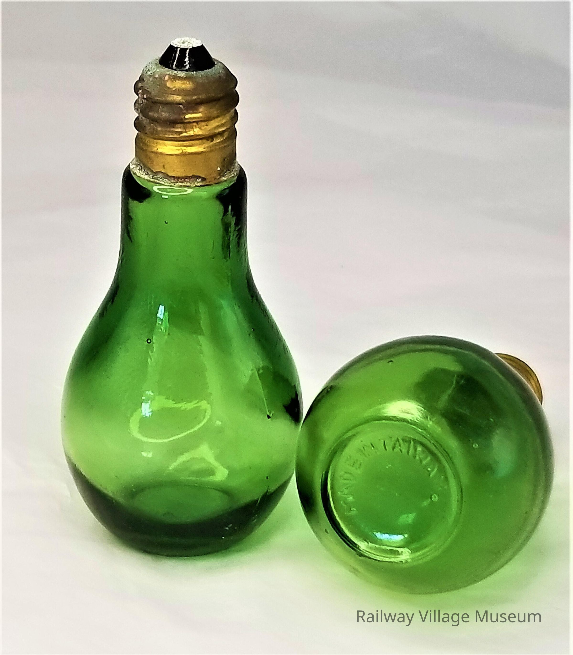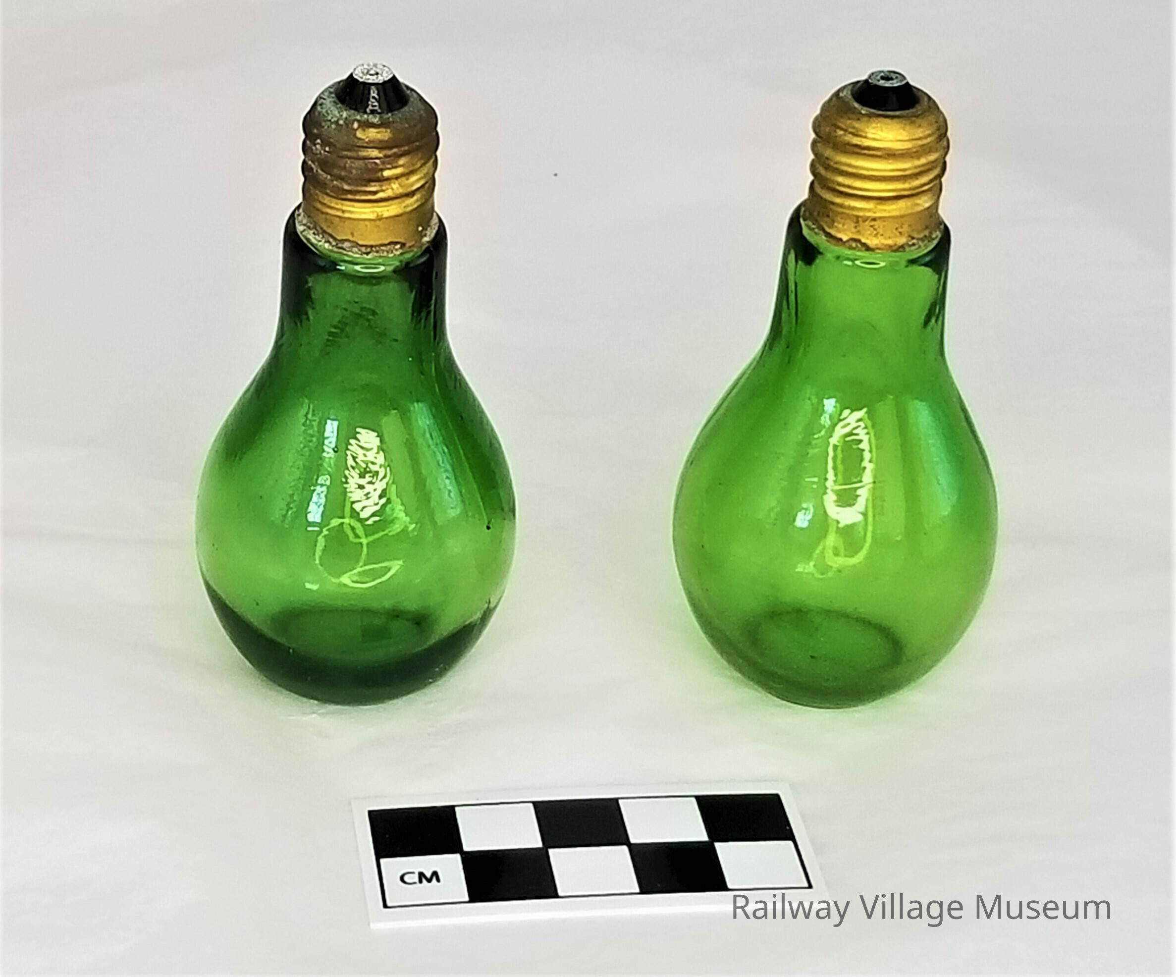 Made in Taiwan, Republic of China. These green light bulb-shaped shakers also came in other colors like blue, red, and clear. "Made in Taiwan" on base.